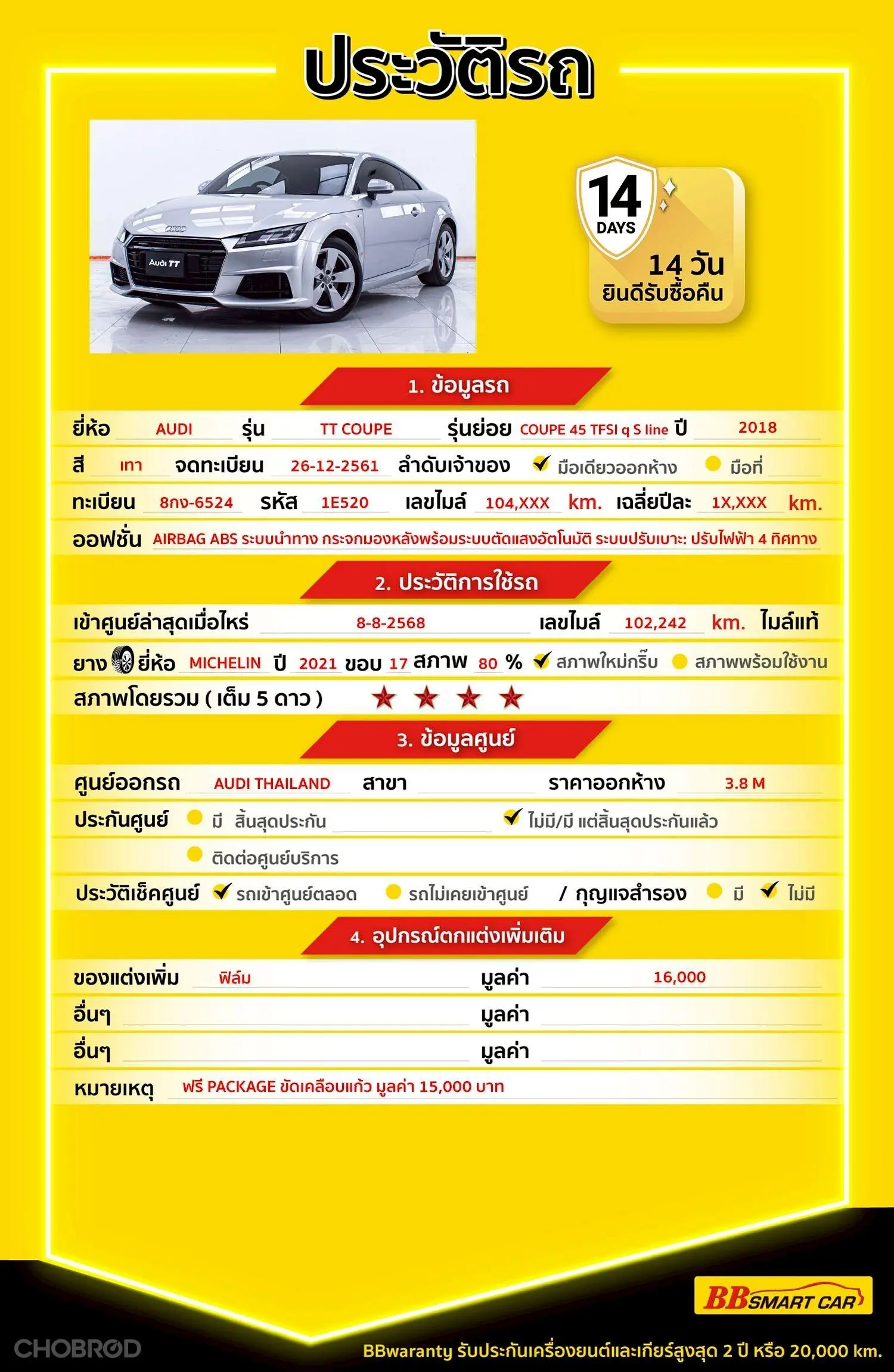 AUDI TT COUPE 45 TFSI Q S LINE 2.0 AT 2018 ออกรถ 0 บาท จัดได้ 1,179,000 บ.Line:***********แสดงข้อมูล 🔥จอง 199 บาท ส่งบัตรประชาชน รู้ผลพิจารณาภายใน 30 นาที ไม่ผ่านคืนเงินจองทุกกรณี 🔥ซื้อรถกับ BB พร้อมให้คำปรึกษา แก้ทุกปัญหา ให้ทุกเรื่อง บริการ call center 24 ชม. 🔥BB Care Plus รับประกันหลังการขาย สูงสุด 2 ปี หรือ 20,000 km.. 🔥มีรถให้เลือกมากกว่า 1,800 คัน สาขา 1 สี่แยกมไหสวรรย์ ใกล้เดอะมอลล์ท่าพระ รหัสรถ 1E520 ราคา 1,159,000 บาท ผ่อนเพียง 19,571 บาท Brand. : AUDI Year. : 2018 Model. : TT Grade. : COUPE 45 TFSI Q S LINE 2.0 Engine. : 2000 CC Type. : เบนซิน Gearbox : AT Color. : เทา Mileage. : 104,XXX KM. (ซื้อสด ราคานี้ยังไม่รวมค่าดำเนินการ 10,000 บ.) 🚩 Price. 1,159,0000 บาท ยอดจัด : 1,169,0000 บาท เงินดาวน์ : 0 บาท ประกันภัย : ฟรีประกันภัย 1 ปี ค่าดำเนินการ : 10,000 บาท รวมออกรถ : 0 บาท ผ่อน 36 งวด = 36,090 บาท ผ่อน 48 งวด = 27,404 บาท ผ่อน 60 งวด = 24,069 บาท ผ่อน 72 งวด = 21,532 บาท ผ่อน 84 งวด = 19,571 บาท เงื่อนไขเป็นไปตามที่ไฟแนนซ์กำหนด โปรโมชั่นพิเศษ สำหรับลูกค้าเครดิตดีลือกรับเรทดอกเบี้ยพิเศษ 📍36 งวด = 1.29 % 📍48 งวด = 1.99 % 📍60 งวด = 2.39 % 📍72 งวด = 3.59 % 🔥 เงื่อนไข โปรโมชั่น ดอกเบี้ยเริ่มต้น 1.29% ตลอดอายุสัญญา - ยอดจัดไฟแนนซ์ 300,000-600,000 บาท - ผ่อนสูงสุด 72 เดือน - เป็นลูกค้าประวัติดี พนักงานประจำเงินเดือน 20,000 ขึ้นไป - ค่าดำเนินการแคมเปญ 20,000 บาท (รวมในยอดจัดได้) 🎗Car Hightlight รถสวยๆ วันนี้ขอแนะนำ AUDI TT COUPE 45 TFSI Q S LINE 2.0 AT 2018 จุดเด่นออฟชั่น 1 : เครื่องยนต์เบนซิน 4 สูบ เทอร์โบ 2.0 ลิตร ให้กำลัง 230 แรงม้า (ในบางแหล่งระบุ 245 แรงม้า) แรงบิด 370 2 : • ชุดแต่ง: S line ภายนอกและภายใน * ล้อ: ขนาด 18 นิ้ว (รุ่นปี 2017) หรือ 19 นิ้ว (รุ่นปรับปรุง) 3 : • หน้าจอแสดงข้อมูล: 12.3 นิ้ว Audi virtual cockpit 🎗ภายใน * เบาะ: คู่หน้าแบบสปอร์ต หุ้มหนังผสม Alcantara * ระบบปรับเบาะ: ปรับไฟฟ้า 4 ทิศทางสำหรับดันหลัง * พวงมาลัย: หนังมัลติฟังก์ชัน 3 ก้าน แบบสปอร์ตท้ายตัด * ระบบนำทาง: MMI Navigation plus with MMI touch 🎗ภายนอก • ชุดแต่ง: S line ภายนอกและภายใน * ล้อ: ขนาด 18 นิ้ว (รุ่นปี 2017) หรือ 19 นิ้ว (รุ่นปรับปรุง) * ระบบเปิด-ปิดไฟหน้า และปัดน้ำฝนอัตโนมัติ * ไฟ Daytime LED * ระบบเพิ่มความส่องสว่างขณะเลี้ยวโค้ง * กระจกมองหลังพร้อมระบบตัดแสงอัตโนมัติ * กระจกมองข้างปรับ-พับไฟฟ้า และไล่ฝ้า 🎗ความคุ้มค่า สำหรับคันนี้หากเปรียบเทียบราคากับคุณภาพ คันนี้ถือว่าคุ้มค่ามากค่ะ ผ่อนสบายๆก็มีรถขับได้ รถดีมีคุณภาพแบบนี้รีบตัดสินใจซื้อได้เลราคานี้มาไวไปไวนะคะ ⭐️การรับประกันหลังการขาย BB Care Plus สูงสุด 2 ปี หรือ 20,000 km. ด้วยช่างที่ผ่านการอบรมจากศูนย์ชั้นนำของประเทศ 🎉Special offer เฉพาะ บีบีสมาร์ทคาร์ ที่นี่ที่เดียว ⭐ดอกเบี้ยเริ่มต้น 1.29% มีไฟแนนซ์รองรับหลายที่ค่ะ ⭐ฟรี!! แพคเก็จ ขัดเคลือบแก้ว มูลค่า 15,000 บาท ทุกคัน ⭐อนุมัติไว 30 นาที นำเอกสารมาให้ครบรับรถกลับบ้านทันทีค่ะ ⭐BB Care Plus รับประกันหลังการขาย สูงสุด 2 ปี หรือ 2
