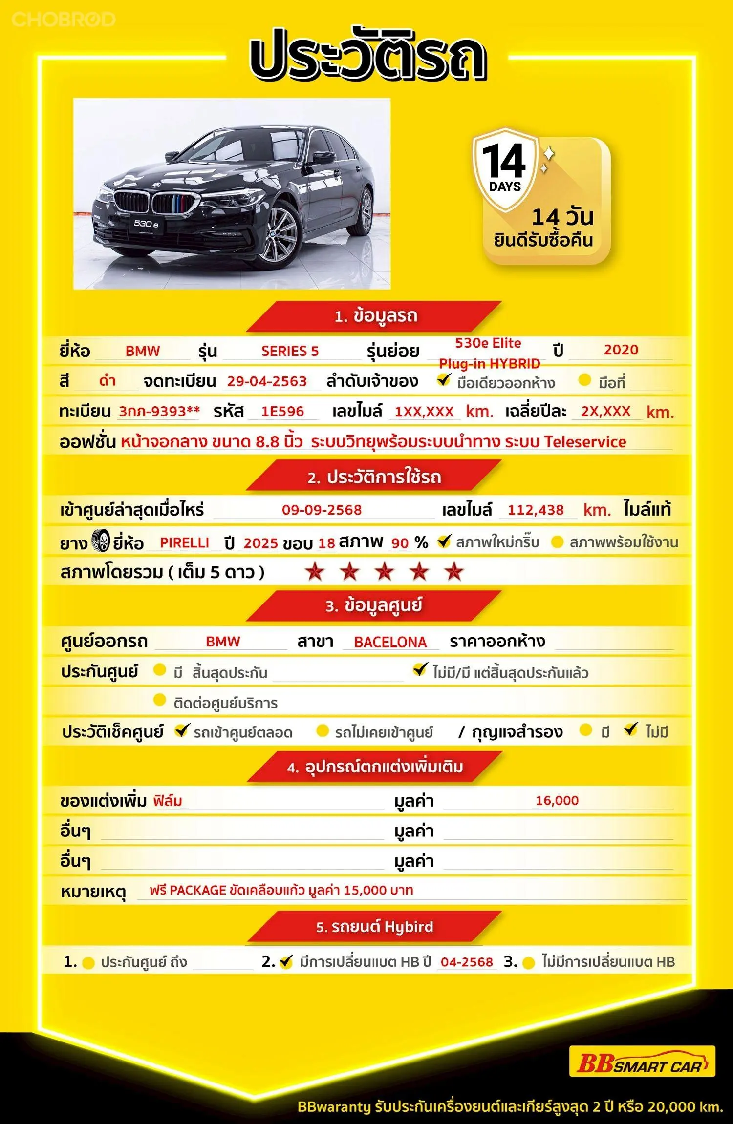 BMW SERIES 5 530E ELITE PLUG-IN HYBRID AT 2020 ออกรถ 0 บาท จัดได้ 889,000 Line:@bbsmartcar 🔥จอง 199 บาท ส่งบัตรประชาชน รู้ผลพิจารณาภายใน 30 นาที ไม่ผ่านคืนเงินจองทุกกรณี 🔥ซื้อรถกับ BB พร้อมให้คำปรึกษา แก้ทุกปัญหา ให้ทุกเรื่อง บริการ call center 24 ชม. 🔥BB Care Plus รับประกันหลังการขาย สูงสุด 2 ปี หรือ 20,000 km.. 🔥มีรถให้เลือกมากกว่า 1,800 คัน สาขา 1 สี่แยกมไหสวรรย์ ใกล้เดอะมอลล์ท่าพระ รหัสรถ 1E596 ราคา 869,000 บาท ผ่อนเพียง 14,716 บาท Brand. : BMW Year. : 2020 Model. : SERIES 5 Grade. : 530E ELITE PLUG-IN HYBRID Engine. : 2000 CC Type. : เบนซิน+ไฟฟ้าแบบเสียบปลั๊ก Gearbox : AT Color. : ดำ Mileage. : 116,XXX KM. (ซื้อสด ราคานี้ยังไม่รวมค่าดำเนินการ 10,000 บ.) 🚩 Price. 869,000 บาท ยอดจัด : 879,000 บาท เงินดาวน์ : 0 บาท ประกันภัย : ฟรีประกันภัย 1 ปี ค่าดำเนินการ : 10,000 บาท รวมออกรถ : 0 บาท ผ่อน 36 งวด = 27,137 บาท ผ่อน 48 งวด = 20,605 บาท ผ่อน 60 งวด = 18,097 บาท ผ่อน 72 งวด = 16,190 บาท ผ่อน 84 งวด = 14,716 บาท เงื่อนไขเป็นไปตามที่ไฟแนนซ์กำหนด โปรโมชั่นพิเศษ สำหรับลูกค้าเครดิตดีลือกรับเรทดอกเบี้ยพิเศษ 📍36 งวด = 1.29 % 📍48 งวด = 1.99 % 📍60 งวด = 2.39 % 📍72 งวด = 3.59 % 🔥 เงื่อนไข โปรโมชั่น ดอกเบี้ยเริ่มต้น 1.29% ตลอดอายุสัญญา - ยอดจัดไฟแนนซ์ 300,000-600,000 บาท - ผ่อนสูงสุด 72 เดือน - เป็นลูกค้าประวัติดี พนักงานประจำเงินเดือน 20,000 ขึ้นไป - ค่าดำเนินการแคมเปญ 20,000 บาท (รวมในยอดจัดได้) 🎗Car Hightlight รถสวยๆ วันนี้ขอแนะนำ BMW SERIES 5 530E ELITE PLUG-IN HYBRID AT 2020 จุดเด่นออฟชั่น 1 : ไฟหน้า Adaptive LED ปรับตามทิศทางการหมุนพวงมาลัย 2 : ระบบช่วยนำรถเข้าที่จอดอัตโนมัติ Parking Assistant 3 : ระบบวิทยุพร้อมระบบนำทาง Navigation System รุ่น Business หน้าจอกลาง ขนาด 8.8 นิ้ว ปุ่มควบคุม iDrive, 🎗ภายใน เบรกมือไฟฟ้า พร้อมฟังก์ชั่น Auto Hold , ระบบ Comfort Access, รองรับระบบกุญแจ Digital Key on iPhone, ระบบช่วยปิดประตูแบบผ่อนแรงกระแทก Soft-close function ,ระบบไฟหน้า เปิด-ปิด อัตโนมัติ, ระบบปัดน้ำฝน อัตโนมัติ Rain Sensor, กระจกมองข้างฝั่งคนขับ ตัดแสงอัตโนมัติ,เซนเซอร์กะระยะช่วยจอด ด้านหน้า-ด้านหลัง, ที่ปรับดันหลังไฟฟ้าเบาะนั่งคู่หน้า Lumbar Support, ระบบวิทยุพร้อมระบบนำทาง Navigation System รุ่น Business หน้าจอกลาง ขนาด 8.8 นิ้ว ปุ่มควบคุม iDrive, โหมดการขับขี่ Drive Select ECO PRO, Comfort, Sport , พวงมาลัยไฟฟ้า ปรับน้ำหนักตามความเร็วขณะขับขี่ Servotronic, ระบบ BMW ConnectedDrive -ระบบแสดงข้อมูลการจราจรแบบ Real-time -บริการติดต่อผู้ช่วยส่วนตัว Concierge Service -ระบบ Remote Service -ระบบ Teleservice -ปุ่มโทรออกฉุกเฉิน Intelligent Emergency Call 🎗ภายนอก กระจกมองข้างสีเดียวกับตัวรถ กระจกมองข้าง ปรับและพับด้วยไฟฟ้า พร้อมไฟเลี้ยวในตัว มือเปิดประตูภายนอก สีเดียวกับตัวรถ ไฟตัดหมอกหลัง ไฟตัดหมอกคู่หน้า ไฟท้ายแบบ LED ล้อแมกซ์ขนาด 18" 🎗ความคุ้มค่า สำหรับคันนี้หากเปรียบเทียบราคากับคุณภาพ คันนี้ถือว่าคุ้มค่ามากค่ะ ผ่อนสบายๆก็มีรถขับได้ รถดีมีคุณภาพแบบนี้รีบตัดสินใจซื้อได้เลยราคานี้มาไวไปไวนะคะ ⭐️การรับประกันห