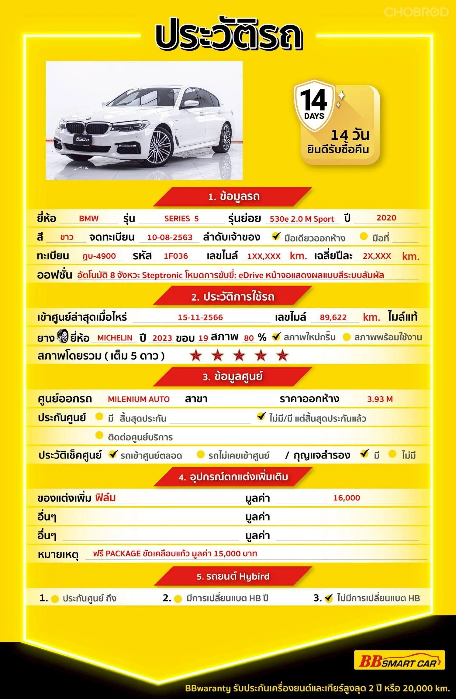 BMW SERIES 5 530E 2.0 M SPORT G30 2020 ออกรถ 0 บาท จัดได้ 919,000 บ. Line:@bbsmartcar 📍BBsmartcar สาขา 1 สี่แยกมไหสวรรย์ BMW SERIES 5 530E 2.0 M SPORT G30 2020 💸price 899,000 บาท *** Highlight *** BMW 530e Model Top M Sport (e-Drive) สีขาว Alphine White ตัวท๊อป สปอร์ตหรูแบบพรีเมี่ยม วิ่งเพียง 125,930 KM. รถศูนย์แท้ ประวัติดี ไร่อุบัติเหตุ สภาพรถเกือบป้ายแดง เจ้าของบริษัท ใช้งานคนเดียว ประหยัดจากราคาป้ายแดงถึง 2.0 M ล้านบาท 💎รับประกันไมล์แท้ 100% กรณีตรวจพบการกรอไมล์ ยินดีคืนเงินเต็มจำนวน 💎รับประกันโครงสร้างรถ ไม่เคยประสบอุบัติเหตุหนัก พลิกคว่ำ น้ำท่วม หรือไฟไหม้ โครงสร้างและแชสซีอยู่ในสภาพสมบูรณ์ สติกเกอร์และแผ่นเพลทครบถ้วน 💎BB Care Plus รับประกันหลังการขายสูงสุด 2 ปี หรือ 20,000 km. 💎ไม่พอใจ ยินดีคืนเงินภายใน 14 วัน 🔥คลิ๊กที่ลิงก์เพื่อดู วิดีโอคันนี้,ประวัติรถ,รูปภาพภายนอกและรูปภายใน https://www.bbsmartcar.com/web-php/index.php/site/cardetail/202602182AADD2591EA5 🔥เรามีรถรุ่นนี้ให้เลือกชมอีก 5 คัน https://www.bbsmartcar.com/web-php/index.php/site/car?name_brand=BMW&modelCar=SERIES_5&search=one 🔥มีรถให้เลือกมากกว่า 1,800 คัน https://www.bbsmartcar.com/web-php/index.php/site/home NO. 1F036 Brand. : BMW Year. : 2020 Model. : SERIES 5 Grade. : 530E 2.0 M SPORT G30 Engine. : 2000 CC Type. : เบนซิน + ไฟฟ้าแบบเสียบปลั๊ก Gearbox : AT Color. : สีขาว Mileage. : 125,XXX KM. (ซื้อสด ราคานี้ยังไม่รวมค่าดำเนินการ 10,000 บ.) เงินดาวน์ : 0 บาท ประกันภัย : ฟรีประกันภัย 1 ปี ค่าดำเนินการ : 10,000 บาท รวมออกรถ : 0 บาท ผ่อน 72 งวด = 16,742 บาท ผ่อน 84 งวด = 15,219 บาท จุดเด่นออฟชั่น 1 : เครื่องยนต์เบนซิน 4 สูบ 2.0 ลิตร TwinPower Turbo แบตเตอรี่High-voltage Lithium-ion ความจุ 7.6 kWh (ชาร์จไฟบ้านประมาณ 3 ชม.) 2 : โหมดการขับขี่: eDrive (AUTO eDRIVE, MAX eDRIVE SAVE BATTERY) และ Driving Experience Control (Sport, Comfort, ECO PRO) 3 : ประตูดูด (Soft-close) 🎗ภายใน ภายใน: พวงมาลัย M Sport เบาะนั่งสปอร์ตหนัง Dakota หน้าจอ 10.25 นิ้ว, Gesture Control หน้าจอแสดงผลแบบสี ระบบสัมผัส Touchscreen ขนาด 10.25 นิ้ว ปุ่มควบคุม iDrive พร้อม Touch Controller เครื่องเล่น CD ระบบนำทาง Navigation System รุ่น Professional Application สำหรับ Smart Phone (BMW Apps) ระบบสั่งงานโดยการเคลื่อนไหวของมือ Gesture Control ระบบสั่งงานด้วยเสียง Intelligent Voice Control Assistance ระบบเชืี่อมต่อไร้สาย Bluetooth ระบบชาร์จโทรศัพท์ไร้สาย Wireless Charging ช่องเชืี่อมต่อ USB หน้าจอสำหรับผู้โดยสารตอนหลัง ขนาด 10.2 นิ้ว ระบบเสียงรอบทิศทาง Harman Kardon 🎗ภายนอก ภายนอก: ชุดแต่ง M Aerodynamics ไฟหน้า Adaptive LED ไฟท้าย LED กระจกมองข้างพร้อมไฟเลี้ยว LED Sunroof / หลังคาแก้วไฟฟ้า กระจังหน้า, กันชนหน้า-หลัง และรายละเอียดภายนอกเฉพาะรุ่นสปอร์ต มือเปิดประตูสีตัวรถพร้อมขอบโครเมียม 🎗ความคุ้มค่า สำหรับคันนี้หากเปรียบเทียบราคากับคุณภาพ คันนี้ถือว่าคุ้มค่ามากค่ะ ผ่อนสบายๆก็มีรถขับได้ รถดีมีคุณภาพแบบนี้รีบตัดสินใจซื้อได้เลราคานี้มาไวไปไวนะคะ ⭐️การรับประกันหลังการขาย BB Care Plus สูงสุด 2 ปี หรือ 20,000 km. ด้วยช่างที่ผ่านการอบรมจากศูนย์ชั้นนำของประเทศ 🎉Special offer เฉพาะ บีบีสมาร์ทคาร์ ที่นี่ที่เดียว ⭐ดอกเบี้ยเริ่มต้น 1.29% ม
