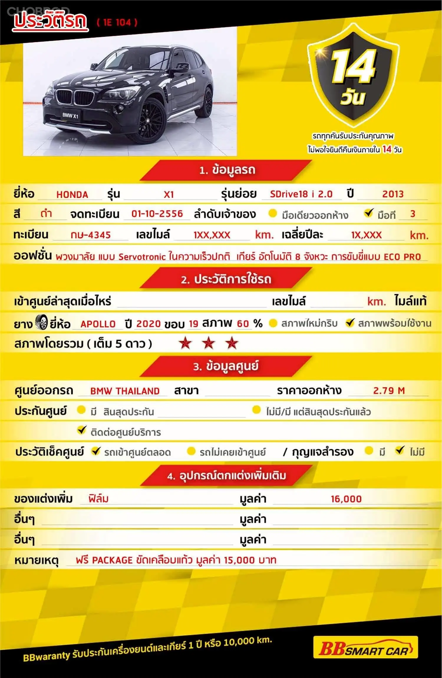BMW X1 SDrive18 i 2.0 AT 2013 ออกรถ 0 บาท จัดได้ 314,000 Line:@**********แสดงข้อมูล 🔥จอง 199 บาท ส่งบัตรประชาชน รู้ผลพิจารณาภายใน 30 นาที ไม่ผ่านคืนเงินจองทุกกรณี 🔥ซื้อรถกับ BB พร้อมให้คำปรึกษา แก้ทุกปัญหา ให้ทุกเรื่อง บริการ call center 24 ชม. 🔥BB Care Plus รับประกันหลังการขาย สูงสุด 2 ปี หรือ 20,000 km.. 🔥มีรถให้เลือกมากกว่า 1,800 คัน สาขา 1 สี่แยกมไหสวรรย์ ใกล้เดอะมอลล์ท่าพระ รหัสรถ 1E104 ราคา 299,000 บาท ผ่อนเพียง 6,003 บาท Brand. : BMW Year. : 2013 Model. : X1 Grade. : SDrive18 i 2.0 Engine. : 2000 CC Type. : เบนซิน Gearbox : AT Color. : ดำ Mileage. : 146,XXX KM. (ซื้อสด ราคานี้ยังไม่รวมค่าดำเนินการ 10,000 บ.) 🚩 Price. 299,000 บาท ยอดจัด : 309,000 บาท เงินดาวน์ : 0 บาท ประกันภัย : ฟรีประกันภัย 1 ปี ค่าดำเนินการ : 10,000 บาท รวมออกรถ : 0 บาท ผ่อน 36 งวด = 10,630 บาท ผ่อน 48 งวด = 8,334 บาท ผ่อน 60 งวด = 7,164 บาท ผ่อน 72 งวด = 6,383 บาท ผ่อน 84 งวด = 6,003 บาท เงื่อนไขเป็นไปตามที่ไฟแนนซ์กำหนด โปรโมชั่นพิเศษ สำหรับลูกค้าเครดิตดีลือกรับเรทดอกเบี้ยพิเศษ 📍36 งวด = 1.29 % 📍48 งวด = 1.99 % 📍60 งวด = 2.39 % 📍72 งวด = 3.59 % 🔥 เงื่อนไข โปรโมชั่น ดอกเบี้ยเริ่มต้น 1.29% ตลอดอายุสัญญา - ยอดจัดไฟแนนซ์ 300,000-600,000 บาท - ผ่อนสูงสุด 72 เดือน - เป็นลูกค้าประวัติดี พนักงานประจำเงินเดือน 20,000 ขึ้นไป - ค่าดำเนินการแคมเปญ 20,000 บาท (รวมในยอดจัดได้) 🎗Car Hightlight รถสวยๆ วันนี้ขอแนะนำ BMW X1 SDrive18 i 2.0 AT เบนซิน 2013 จุดเด่นออฟชั่น 1 : พวงมาลัย แบบ Servotronic ในความเร็วปกติ ระบบจะทำการปรับน้ำหนักการบังคับเลี้ยวให้สอดคล้องการสภาพการขับขี่ ในขณะที่ขับขี่ด้วยความเร็วสูง 2 : เครื่องยนต์บีเอ็มดับเบิลยู เบนซิน 4 สูบ เครื่องยนต์เบนซิน 4 สูบใน บีเอ็มดับเบิลยู X1 sDrive 18i ให้กำลัง สูงสุด110กิโลวัตต์ (150แรงม้า) ด้วยเครื่องยนต์ขนาด 2 ลิตร 🎗ภายใน เกียร์ อัตโนมัติ 8 จังหวะ พร้อม Steptronic ที่ไม่ได้ให้แค่ความนุ่มนวลและลดเสียงของเครื่องยนต์ในความเร็วสูง แต่ยังช่วยลดการสิ้นเปลืองเชื้อเพลิง ระบบ Auto Start/Stop ในบีเอ็มดับเบิลยู X1 sDrive20d จะช่วยลดการสิ้นเปลืองเชื้อเพลิงโดยการดับเครื่องยนต์ชั่วคราวในขณะที่หยุด นิ่ง 🎗ภายนอก ตัวรถสีดำสวยดูเท่มากๆค่ะ สภาพพร้อมใช้งานเลยค่ะ 🎗ความคุ้มค่า สำหรับคันนี้หากเปรียบเทียบราคากับคุณภาพ คันนี้ถือว่าคุ้มค่ามากค่ะ ผ่อนสบายๆก็มีรถขับได้ รถดีมีคุณภาพแบบนี้รีบตัดสินใจซื้อได้เลราคานี้มาไวไปไวนะคะ ⭐️การรับประกันหลังการขาย BB Care Plus สูงสุด 2 ปี หรือ 20,000 km. ด้วยช่างที่ผ่านการอบรมจากศูนย์ชั้นนำของประเทศ 🎉Special offer เฉพาะ บีบีสมาร์ทคาร์ ที่นี่ที่เดียว ⭐ดอกเบี้ยเริ่มต้น 1.29% มีไฟแนนซ์รองรับหลายที่ค่ะ ⭐ฟรี!! แพคเก็จ ขัดเคลือบแก้ว มูลค่า 15,000 บาท ทุกคัน ⭐อนุมัติไว 30 นาที นำเอกสารมาให้ครบรับรถกลับบ้านทันทีค่ะ ⭐BB Care Plus รับประกันหลังการขาย สูงสุด 2 ปี หรือ 20,000 km. ⭐มี 6 สาขา ในกรุงเทพและปริม