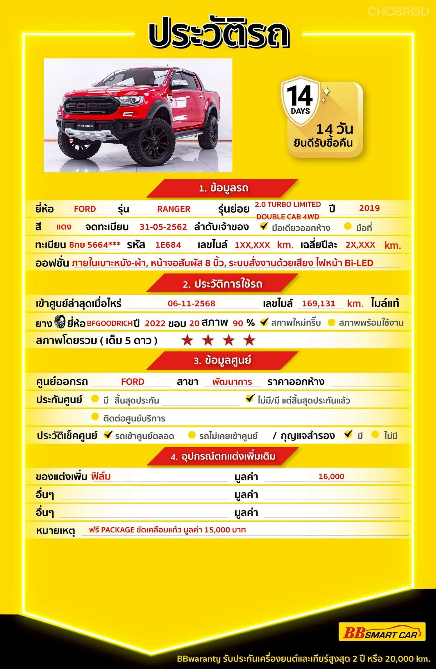 มีการรับประกันจากดีลเลอร์ (6 เดือน) มีบริการช่วยเหลือฉุกเฉินบนท้องถนน 24 ชม. จากดีลเลอร์