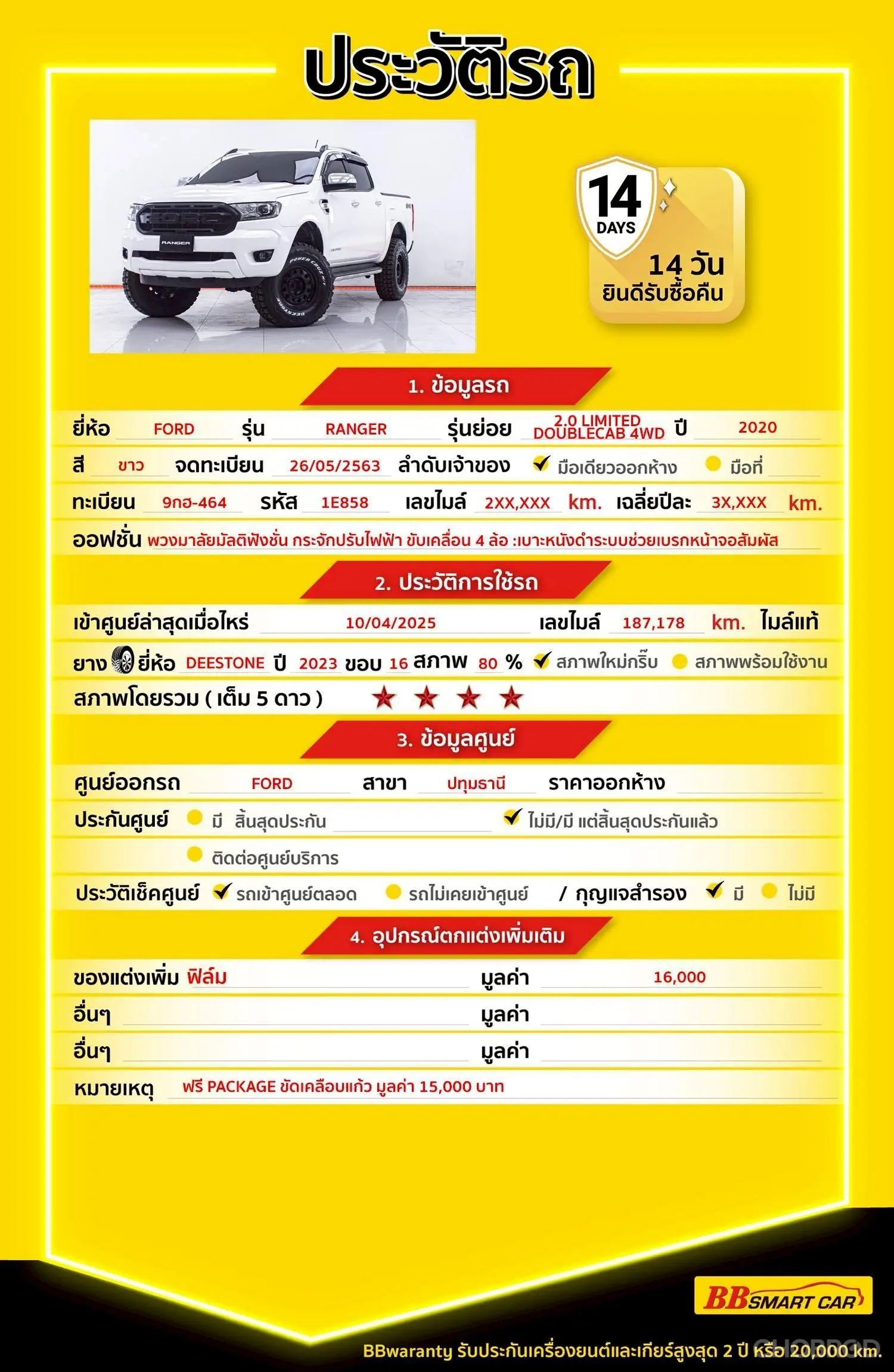 มีการรับประกันจากดีลเลอร์ (6 เดือน) มีบริการช่วยเหลือฉุกเฉินบนท้องถนน 24 ชม. จากดีลเลอร์