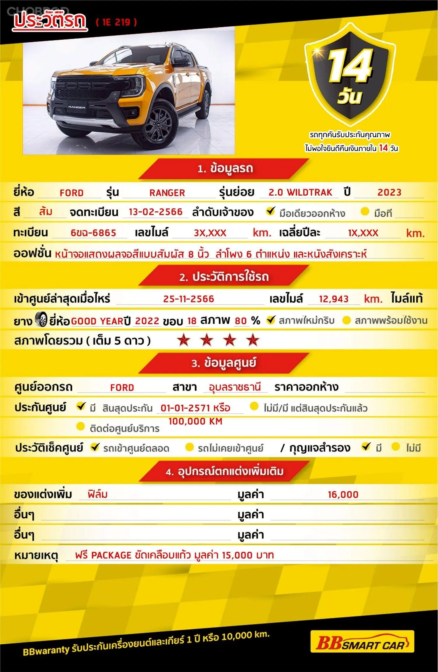FORD RANGER 2.0 WILDTRAK DBL CAB HI-RIDER AT 2023 ออกรถ 0 บาท จัดได้ 899,000 Line:@bbsmartcar 🔥จอง 199 บาท ส่งบัตรประชาชน รู้ผลพิจารณาภายใน 30 นาที ไม่ผ่านคืนเงินจองทุกกรณี 🔥ซื้อรถกับ BB พร้อมให้คำปรึกษา แก้ทุกปัญหา ให้ทุกเรื่อง บริการ call center 24 ชม. 🔥BB Care Plus รับประกันหลังการขาย สูงสุด 2 ปี หรือ 20,000 km.. 🔥มีรถให้เลือกมากกว่า 1,800 คัน สาขา 1 สี่แยกมไหสวรรย์ ใกล้เดอะมอลล์ท่าพระ รหัสรถ 1E219 ราคา 879,000 บาท ผ่อนเพียง 14,884 บาท Brand. : FORD Year. : 2023 Model. : RANGER Grade. : 2.0 WILDTRAK DBL CAB HI-RIDER Engine. : 2000 CC Type. : ดีเซล Gearbox : AT Color. : เหลือง Mileage. : 31,XXX KM. (ซื้อสด ราคานี้ยังไม่รวมค่าดำเนินการ 10,000 บ.) 🚩 Price. 879,000 บาท ยอดจัด : 889,000 บาท เงินดาวน์ : 0 บาท ประกันภัย : ฟรีประกันภัย 1 ปี ค่าดำเนินการ : 10,000 บาท รวมออกรถ : 0 บาท ผ่อน 36 งวด = 28,634 บาท ผ่อน 48 งวด = 22,029 บาท ผ่อน 60 งวด = 18,303 บาท ผ่อน 72 งวด = 16,374 บาท ผ่อน 84 งวด = 14,884 บาท เงื่อนไขเป็นไปตามที่ไฟแนนซ์กำหนด โปรโมชั่นพิเศษ สำหรับลูกค้าเครดิตดีลือกรับเรทดอกเบี้ยพิเศษ 📍36 งวด = 1.29 % 📍48 งวด = 1.99 % 📍60 งวด = 2.39 % 📍72 งวด = 3.59 % 🔥 เงื่อนไข โปรโมชั่น ดอกเบี้ยเริ่มต้น 1.29% ตลอดอายุสัญญา - ยอดจัดไฟแนนซ์ 300,000-600,000 บาท - ผ่อนสูงสุด 72 เดือน - เป็นลูกค้าประวัติดี พนักงานประจำเงินเดือน 20,000 ขึ้นไป - ค่าดำเนินการแคมเปญ 20,000 บาท (รวมในยอดจัดได้) 🎗Car Hightlight รถสวยๆ วันนี้ขอแนะนำ FORD RANGER 2.0 WILDTRAK DBL CAB HI-RIDER AT 2023 จุดเด่นออฟชั่น 1 : หน้าจอแสดงผลจอสีแบบสัมผัส Multi-Touch ขนาด 10.1 นิ้ว 2 : หน้าจอแสดงผลบนหน้าปัดแบบสีขนาด 8 นิ้ว 3 : ระบบปรับอากาศแบบอัตโนมัติแยกอิสรถซ้าย-ขวา 🎗ภายใน เบาะหนัง และหนังสังเคราะห์ เบาะนั่งคนขับปรับ 6 ทิศทาง และด้านผู้โดยสารตอนหน้า 4 ทิศทาง หน้าจอแสดงผลจอสีแบบสัมผัส Multi-Touch ขนาด 10.1 นิ้ว รองรับ Wireless Apple CarPlay และ Android Auto ระบบเชื่อมต่อบลูทูธ และระบบสั่งงานด้วยเสียง SYNC 4A ระบบ FordPass Connect ช่องต่อ USB 2 จุด พร้อมช่องไฟ 12V 2 ช่อง ลำโพง 6 ตำแหน่ง หน้าจอแสดงผลบนหน้าปัดแบบสีขนาด 8 นิ้ว กุญแจรีโมทอัจฉริยะ พร้อมปุ่มสตาร์ทรถอัตโนมัติ กระจกมองหลังแบบปรับลดแสงอัตโนมัติ พร้อมช่องต่อ USB ระบบปรับอากาศแบบอัตโนมัติแยกอิสรถซ้าย-ขวา ระบบปรับอากาศสำหรับผู้โดยสารตอนหลัง 🎗ภายนอก กระจกมองข้าง ปรับและพับด้วยไฟฟ้า พร้อมไฟเลี้ยวในตัว มือเปิดประตูภายนอก สีเดียวกับตัวรถ ล้ออัลลอย (18 นิ้ว) ไฟ Daytime Running Lights (LED) ไฟท้ายแบบ LED ตัวรถสีเหลือง โดดเด่นเป็นที่จับต้องทุกสายตา ไม่มีชนหนักแน่นอนค่ะ 🎗ความคุ้มค่า สำหรับคันนี้หากเปรียบเทียบราคากับคุณภาพ คันนี้ถือว่าคุ้มค่ามากค่ะ ผ่อนสบายๆก็มีรถขับได้ รถดีมีคุณภาพแบบนี้รีบตัดสินใจซื้อได้เลราคานี้มาไวไปไวนะคะ ⭐️การรับประกันหลังการขาย BB Care Plus สูงสุด 2 ปี หรือ 20,000 km. ด้วยช่างที่ผ่านการอบรมจากศูนย์ชั้นนำของประเทศ 🎉Special offer เฉพาะ บีบีสมาร์ทคาร์ ที่นี่ที่เดี