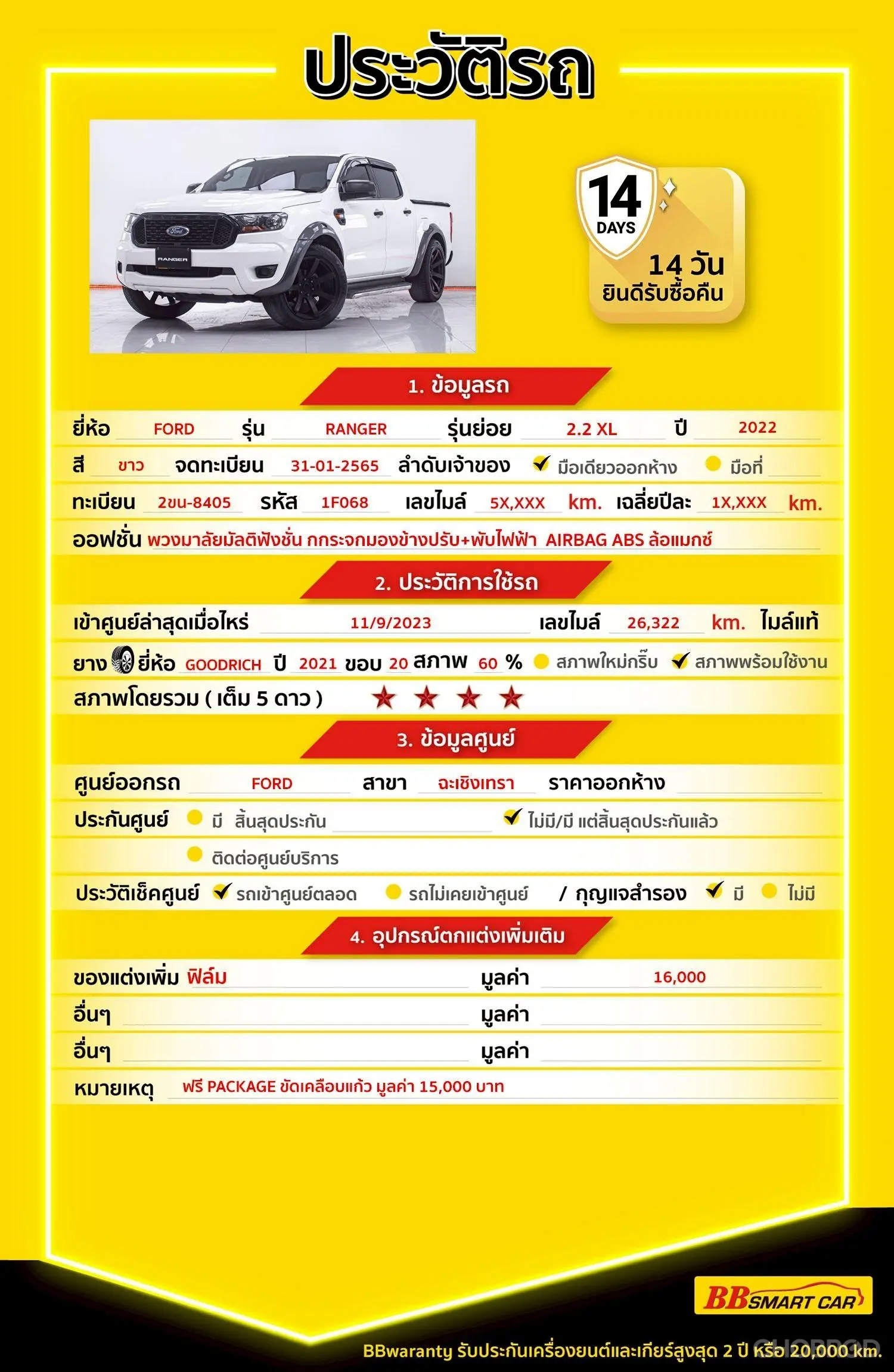 มีการรับประกันจากดีลเลอร์ (6 เดือน) มีบริการช่วยเหลือฉุกเฉินบนท้องถนน 24 ชม. จากดีลเลอร์