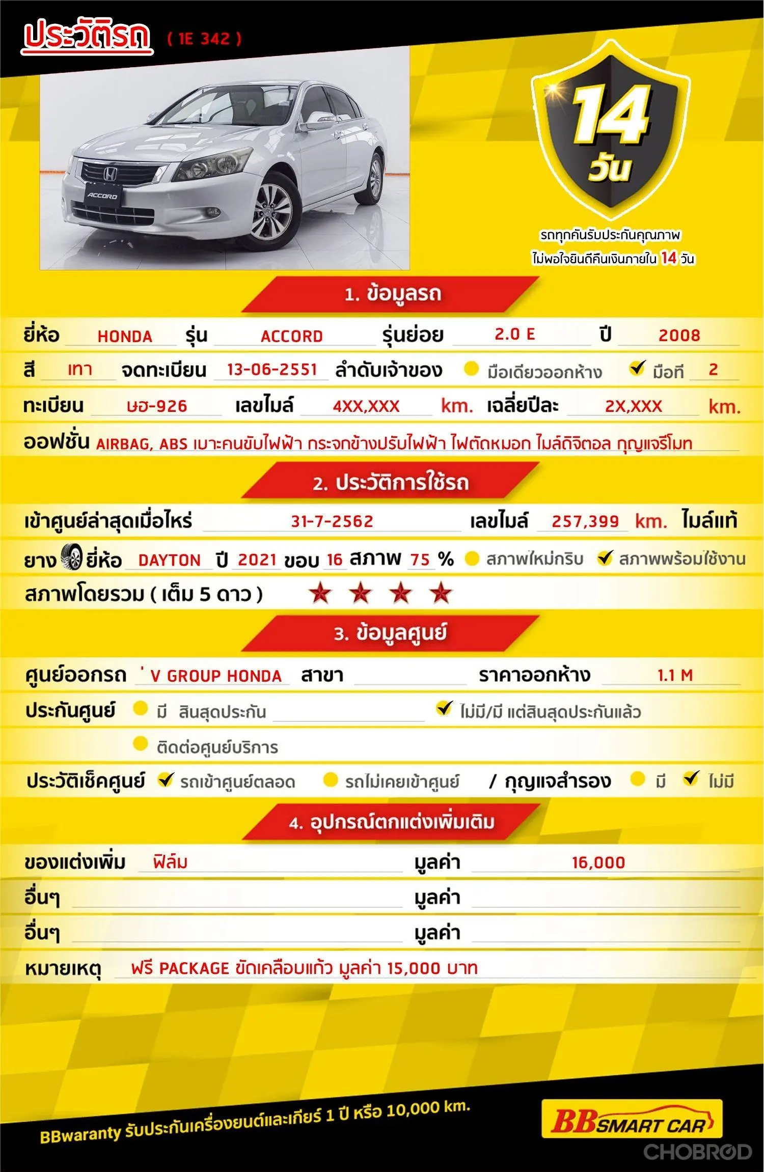 HONDA ACCORD 2.0 E AT 2008 ออกรถ 0 บาท จัดได้ 164,000 Line:***********แสดงข้อมูล 🔥จอง 199 บาท ส่งบัตรประชาชน รู้ผลพิจารณาภายใน 30 นาที ไม่ผ่านคืนเงินจองทุกกรณี 🔥ซื้อรถกับ BB พร้อมให้คำปรึกษา แก้ทุกปัญหา ให้ทุกเรื่อง บริการ call center 24 ชม. 🔥BB Care Plus รับประกันหลังการขาย สูงสุด 2 ปี หรือ 20,000 km.. 🔥มีรถให้เลือกมากกว่า 1,800 คัน สาขา 1 สี่แยกมไหสวรรย์ ใกล้เดอะมอลล์ท่าพระ รหัสรถ 1E342 ราคา 144,000 บาท ผ่อนเพียง 3,388 บาท Brand. : HONDA Year. : 2008 Model. : ACCORD Grade. : 2.0 E Engine. : 2000 CC Type. : เบนซิน Gearbox : AT Color. : เทา Mileage. : 404,XXX KM. (ซื้อสด ราคานี้ยังไม่รวมค่าดำเนินการ 10,000 บ.) 🚩 Price. 144,000 บาท ยอดจัด : 154,000 บาท เงินดาวน์ : 0 บาท ประกันภัย : ฟรีประกันภัย 1 ปี ค่าดำเนินการ : 10,000 บาท รวมออกรถ : 0 บาท ผ่อน 36 งวด = 5,538 บาท ผ่อน 48 งวด = 4,394 บาท ผ่อน 60 งวด = 3,776 บาท ผ่อน 72 งวด = 3,388 บาท เงื่อนไขเป็นไปตามที่ไฟแนนซ์กำหนด โปรโมชั่นพิเศษ สำหรับลูกค้าเครดิตดีลือกรับเรทดอกเบี้ยพิเศษ 📍36 งวด = 1.29 % 📍48 งวด = 1.99 % 📍60 งวด = 2.39 % 📍72 งวด = 3.59 % 🔥 เงื่อนไข โปรโมชั่น ดอกเบี้ยเริ่มต้น 1.29% ตลอดอายุสัญญา - ยอดจัดไฟแนนซ์ 300,000-600,000 บาท - ผ่อนสูงสุด 72 เดือน - เป็นลูกค้าประวัติดี พนักงานประจำเงินเดือน 20,000 ขึ้นไป - ค่าดำเนินการแคมเปญ 20,000 บาท (รวมในยอดจัดได้) 🎗Car Hightlight รถสวยๆ วันนี้ขอแนะนำ HONDA ACCORD 2.0 E AT 2008 จุดเด่นออฟชั่น 1 : วิทยุ, CD, USB, AUX 2 : แอร์ Digital, แอร์หลัง 3 : AIRBAG, ABS 🎗ภายใน เบาะหนัง เบาะคนขับไฟฟ้า เบาะคู่หน้าไฟฟ้า ไมล์ดิจิตอล พวงมาลัย Multi-Function พวงมาลัย Power Cruise Control, Central Lock กุญแจรีโมท 🎗ภายนอก กระจกไฟฟ้า กระจกข้างปรับไฟฟ้า พร้อมไฟเลี้ยวในตัว ไฟตัดหมอก ล้อแมกซ์ขอบ 16 นิ้ว มือเปิดประตูภายนอก สีเดียวกับตัวรถ 🎗ความคุ้มค่า สำหรับคันนี้หากเปรียบเทียบราคากับคุณภาพ คันนี้ถือว่าคุ้มค่ามากค่ะ ผ่อนสบายๆก็มีรถขับได้ รถดีมีคุณภาพแบบนี้รีบตัดสินใจซื้อได้เลราคานี้มาไวไปไวนะคะ ⭐️การรับประกันหลังการขาย BB Care Plus สูงสุด 2 ปี หรือ 20,000 km. ด้วยช่างที่ผ่านการอบรมจากศูนย์ชั้นนำของประเทศ 🎉Special offer เฉพาะ บีบีสมาร์ทคาร์ ที่นี่ที่เดียว ⭐ดอกเบี้ยเริ่มต้น 1.29% มีไฟแนนซ์รองรับหลายที่ค่ะ ⭐ฟรี!! แพคเก็จ ขัดเคลือบแก้ว มูลค่า 15,000 บาท ทุกคัน ⭐อนุมัติไว 30 นาที นำเอกสารมาให้ครบรับรถกลับบ้านทันทีค่ะ ⭐BB Care Plus รับประกันหลังการขาย สูงสุด 2 ปี หรือ 20,000 km. ⭐มี 6 สาขา ในกรุงเทพและปริมณฑลใกล้บ้านท่าน ⭐รถทุกคันผ่านตรวจสอบ Inspection เรียบร้อยแล้วค่ะ ผ่าน 5 ดาวทุกคันค่ะ ⭐เซลล์ทุกท่านเป็นมืออาชีพพร้อมให้บริการทุกท่านแน่นอนค่ะ เลือกข้อเสนอที่ให้คุณมากกว่าที่อื่น เพราะเราเล็งเห็นแล้ว ที่บีบีสมาร์ทคาร์ ให้คุณได้มากกว่าที่อื่นแน่นอนครับ มาที่เดียวจบทุกปัญหา หลากหลายรุ่นให้เลือกกับบริการที่คุณต้องประทับใจแน่นอนครับ
