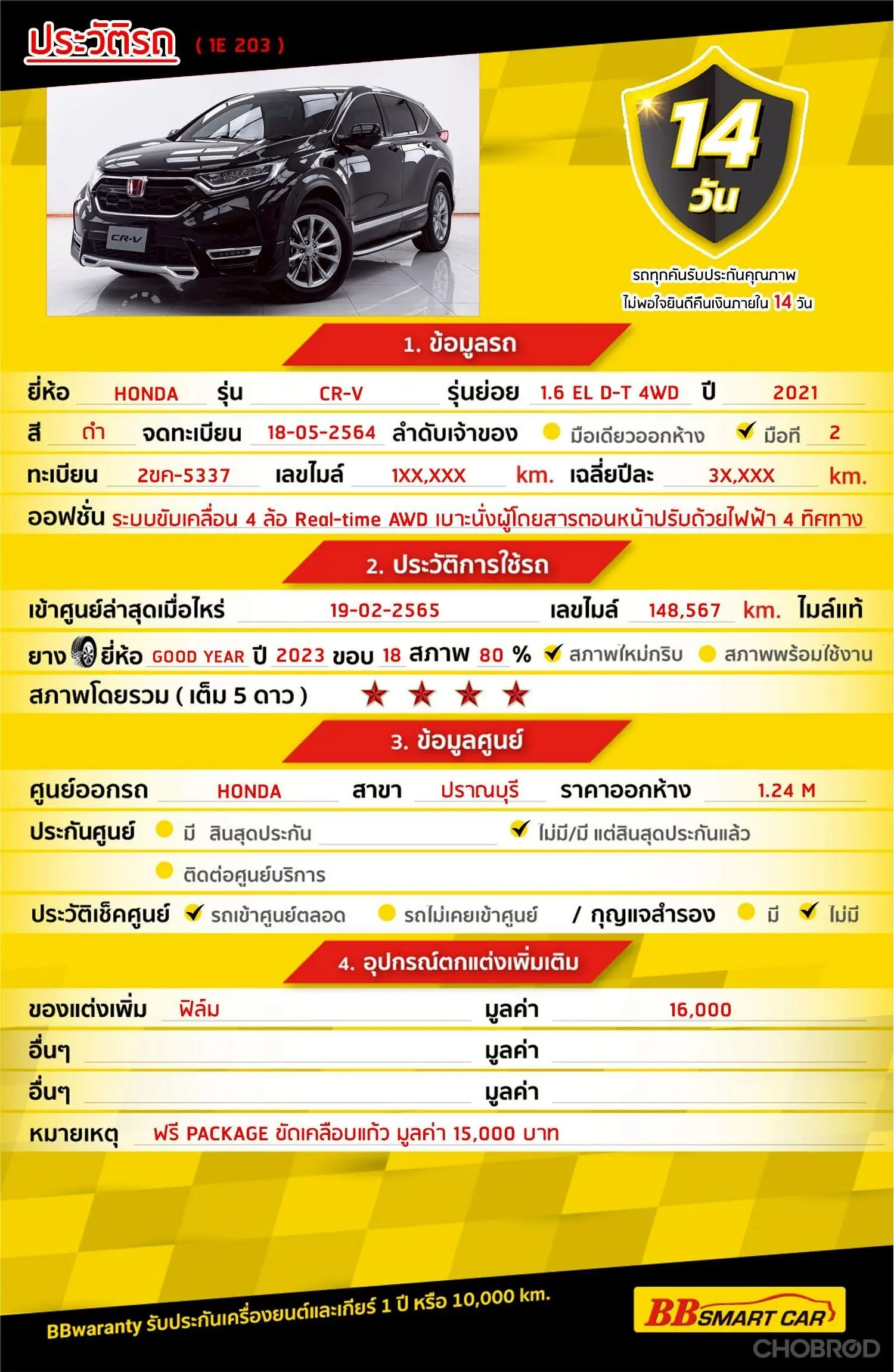 HONDA CR-V 1.6 EL D-T 4WD AT 2021 ออกรถ 0 บาท จัดได้ 619,000 Line:@**********แสดงข้อมูล 🔥จอง 199 บาท ส่งบัตรประชาชน รู้ผลพิจารณาภายใน 30 นาที ไม่ผ่านคืนเงินจองทุกกรณี 🔥ซื้อรถกับ BB พร้อมให้คำปรึกษา แก้ทุกปัญหา ให้ทุกเรื่อง บริการ call center 24 ชม. 🔥BB Care Plus รับประกันหลังการขาย สูงสุด 2 ปี หรือ 20,000 km.. 🔥มีรถให้เลือกมากกว่า 1,800 คัน สาขา 1 สี่แยกมไหสวรรย์ ใกล้เดอะมอลล์ท่าพระ รหัสรถ 1E203 ราคา 599,000 บาท ผ่อนเพียง 10,196 บาท Brand. : HONDA Year. : 2021 Model. : CR-V Grade. : 1.6 EL D-T 4WD Engine. : 1600 CC Type. : ดีเซล Gearbox : AT Color. : ดำ Mileage. : 158,XXX KM. (ซื้อสด ราคานี้ยังไม่รวมค่าดำเนินการ 10,000 บ.) 🚩 Price. 599,000 บาท ยอดจัด : 609,000 บาท เงินดาวน์ : 0 บาท ประกันภัย : ฟรีประกันภัย 1 ปี ค่าดำเนินการ : 10,000 บาท รวมออกรถ : 0 บาท ผ่อน 36 งวด = 18,801 บาท ผ่อน 48 งวด = 14,276 บาท ผ่อน 60 งวด = 12,538 บาท ผ่อน 72 งวด = 11,217 บาท ผ่อน 84 งวด = 10,196 บาท เงื่อนไขเป็นไปตามที่ไฟแนนซ์กำหนด โปรโมชั่นพิเศษ สำหรับลูกค้าเครดิตดีลือกรับเรทดอกเบี้ยพิเศษ 📍36 งวด = 1.29 % 📍48 งวด = 1.99 % 📍60 งวด = 2.39 % 📍72 งวด = 3.59 % 🔥 เงื่อนไข โปรโมชั่น ดอกเบี้ยเริ่มต้น 1.29% ตลอดอายุสัญญา - ยอดจัดไฟแนนซ์ 300,000-600,000 บาท - ผ่อนสูงสุด 72 เดือน - เป็นลูกค้าประวัติดี พนักงานประจำเงินเดือน 20,000 ขึ้นไป - ค่าดำเนินการแคมเปญ 20,000 บาท (รวมในยอดจัดได้) 🎗Car Hightlight รถสวยๆ วันนี้ขอแนะนำ HONDA CR-V 1.6 EL D-T 4WD AT ดีเซล สีดำ 2021 จุดเด่นออฟชั่น 1 : ระบบขับเคลื่อน 4 ล้อ Real-time AWD 2 : เบาะนั่งผู้โดยสารตอนหน้าปรับด้วยไฟฟ้า 4 ทิศทาง 3 : ล้ออัลลอย ขนาด 18 นิ้ว พร้อมยาง 235/60 R18 🎗ภายใน ภายในห้องห้องโดยสาร ตกแต่งด้วยวัสดุลายไม้ และ สีดำ Piano Black เบาะนั่งผู้โดยสารตอนหน้าปรับด้วยไฟฟ้า 4 ทิศทาง ระบบปรับอากาศแบบอัตโนมัติ แยกอิสระซ้าย-ขวา i-Dual Zone พวงมาลัยตกแต่งด้วยวัสดุสีเงินเมทัลลิก ระบบนำทาง Navigation System ช่องเชื่อมต่อ USB 4 ตำแหน่ง ระบบตรวจจับความเหนื่อยล้าของผู้ขับขี่ Driver Attention Monitor ระบบเตือนเมื่อมีรถอยู่ในมุมอับสายตา Honda LaneWatch เครื่องยนต์ดีเซล i-DTEC Commonrail 4 สูบแถวเรียง ขนาด 1.6 ลิตร 🎗ภายนอก ระบบปรับไฟหน้า สูง-ต่ำแบบอัตโนมัติ ระบบเปิด-ปิด ไฟหน้าแบบอัตโนมัติ ระบบปัดน้ำฝนแบบอัตโนมัติ 🎗ความคุ้มค่า สำหรับคันนี้หากเปรียบเทียบราคากับคุณภาพ คันนี้ถือว่าคุ้มค่ามากค่ะ ผ่อนสบายๆก็มีรถขับได้ รถดีมีคุณภาพแบบนี้รีบตัดสินใจซื้อได้เลราคานี้มาไวไปไวนะคะ ⭐️การรับประกันหลังการขาย BB Care Plus สูงสุด 2 ปี หรือ 20,000 km. ด้วยช่างที่ผ่านการอบรมจากศูนย์ชั้นนำของประเทศ 🎉Special offer เฉพาะ บีบีสมาร์ทคาร์ ที่นี่ที่เดียว ⭐ดอกเบี้ยเริ่มต้น 1.29% มีไฟแนนซ์รองรับหลายที่ค่ะ ⭐ฟรี!! แพคเก็จ ขัดเคลือบแก้ว มูลค่า 15,000 บาท ทุกคัน ⭐อนุมัติไว 30 นาที นำเอกสารมาให้ครบรับรถกลับบ้านทันทีค่ะ ⭐BB Care Plus รับประกันหลังการขาย สูงสุด 2 ปี หรือ 20,000 km. ⭐มี 6 สาขา ในกรุงเทพและปริมณ