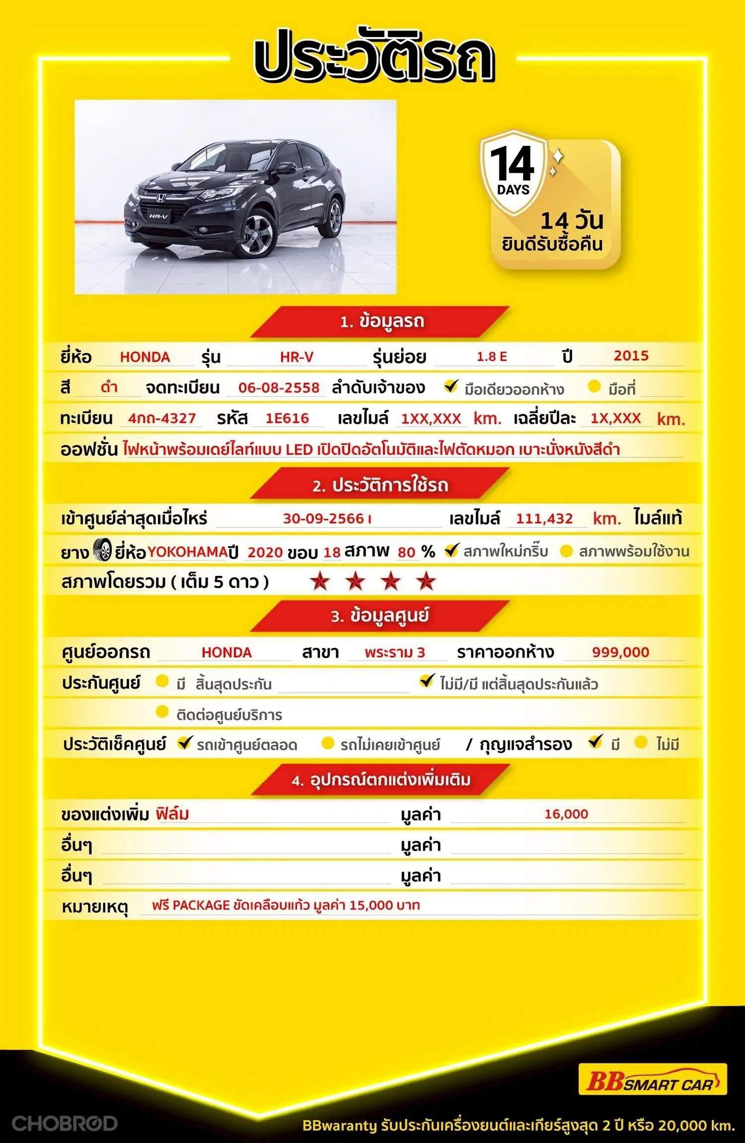 HONDA HR-V 1.8 E AT 2015 ออกรถ 0 บาท 379,000 Line:***********แสดงข้อมูล 🔥จอง 199 บาท ส่งบัตรประชาชน รู้ผลพิจารณาภายใน 30 นาที ไม่ผ่านคืนเงินจองทุกกรณี 🔥ซื้อรถกับ BB พร้อมให้คำปรึกษา แก้ทุกปัญหา ให้ทุกเรื่อง บริการ call center 24 ชม. 🔥BB Care Plus รับประกันหลังการขาย สูงสุด 2 ปี หรือ 20,000 km.. 🔥มีรถให้เลือกมากกว่า 1,800 คัน สาขา 1 สี่แยกมไหสวรรย์ ใกล้เดอะมอลล์ท่าพระ รหัสรถ 1E616 ราคา 359,000 บาท ผ่อนเพียง 6,638 บาท Brand. : HONDA Year. : 2015 Model. : HR-V Grade. : 1.8 E Engine. : 1800 CC Type. : เบนซิน Gearbox : AT Color. : เทา Mileage. : 132,XXX KM. (ซื้อสด ราคานี้ยังไม่รวมค่าดำเนินการ 10,000 บ.) 🚩 Price. 359,000 บาท ยอดจัด : 369,000 บาท เงินดาวน์ : 0 บาท ประกันภัย : ฟรีประกันภัย 1 ปี ค่าดำเนินการ : 10,000 บาท รวมออกรถ : 0 บาท ผ่อน 36 งวด = 12,247 บาท ผ่อน 48 งวด = 9,506 บาท ผ่อน 60 งวด = 7,927 บาท ผ่อน 72 งวด = 7,125 บาท ผ่อน 84 งวด = 6,638 บาท เงื่อนไขเป็นไปตามที่ไฟแนนซ์กำหนด โปรโมชั่นพิเศษ สำหรับลูกค้าเครดิตดีลือกรับเรทดอกเบี้ยพิเศษ 📍36 งวด = 1.29 % 📍48 งวด = 1.99 % 📍60 งวด = 2.39 % 📍72 งวด = 3.59 % 🔥 เงื่อนไข โปรโมชั่น ดอกเบี้ยเริ่มต้น 1.29% ตลอดอายุสัญญา - ยอดจัดไฟแนนซ์ 300,000-600,000 บาท - ผ่อนสูงสุด 72 เดือน - เป็นลูกค้าประวัติดี พนักงานประจำเงินเดือน 20,000 ขึ้นไป - ค่าดำเนินการแคมเปญ 20,000 บาท (รวมในยอดจัดได้) 🎗Car Hightlight รถสวยๆ วันนี้ขอแนะนำ HONDA HR-V 1.8 E AT เบนซิน 2015 จุดเด่นออฟชั่น 1 : ไฟหน้าพร้อมเดย์ไลท์แบบ LED เปิดปิดอัตโนมัติและไฟตัดหมอก - เบาะนั่งหนังสีดำ - พวงมาลัยมัลติฟังก์ชั่นหุ้มหนังพร้อม Paddle Shift และปุ่มควบคุม Cruise Control - อินโฟเทนเมนต์พร้อมหน้าจอขนาด 7 นิ้ว รองรับคำสั่งเสียงของ SIRI และการเชื่อมต่อ HDMI - ลำโพง 6 ตำแหน่ง - กล้องมองหลัง 3 ระดับ - ระบบขับเคลื่อนอัตโนมัติ Cruise Control 🎗ภายใน Honda HR-V 2015 ใช้เครื่องยนต์เบนซิน i-VTEC ขนาด 1,800 ซีซี ให้กำลัง 141 แรงม้า แรงบิด 172 นิวตันเมตร จับคู่เกียร์อัตโนมัติ CVT รองรับการใช้น้ำมัน E85 ระบบเบรกเป็นดิสก์เบรกทั้งหมด 4 ล้อ หยุดได้มั่นใจกว่า 🎗ภายนอก ตัวรถสีเทามาพร้อม ไฟหน้าพร้อมเดย์ไลท์แบบ LED รถสวยสภาพพร้อมใช้งานไม่มีชนหนักแน่นอนค่ะ 🎗ความคุ้มค่า สำหรับคันนี้หากเปรียบเทียบราคากับคุณภาพ คันนี้ถือว่าคุ้มค่ามากค่ะ ผ่อนสบายๆก็มีรถขับได้ รถดีมีคุณภาพแบบนี้รีบตัดสินใจซื้อได้เลราคานี้มาไวไปไวนะคะ ⭐️การรับประกันหลังการขาย BB Care Plus สูงสุด 2 ปี หรือ 20,000 km. ด้วยช่างที่ผ่านการอบรมจากศูนย์ชั้นนำของประเทศ 🎉Special offer เฉพาะ บีบีสมาร์ทคาร์ ที่นี่ที่เดียว ⭐ดอกเบี้ยเริ่มต้น 1.29% มีไฟแนนซ์รองรับหลายที่ค่ะ ⭐ฟรี!! แพคเก็จ ขัดเคลือบแก้ว มูลค่า 15,000 บาท ทุกคัน ⭐อนุมัติไว 30 นาที นำเอกสารมาให้ครบรับรถกลับบ้านทันทีค่ะ ⭐BB Care Plus รับประกันหลังการขาย สูงสุด 2 ปี หรือ 20,000 km. ⭐มี 6 สาขา ในกรุงเทพและปริมณฑลใกล้บ้านท่าน ⭐รถทุกคันผ่านตรวจสอบ Inspection เรียบร้