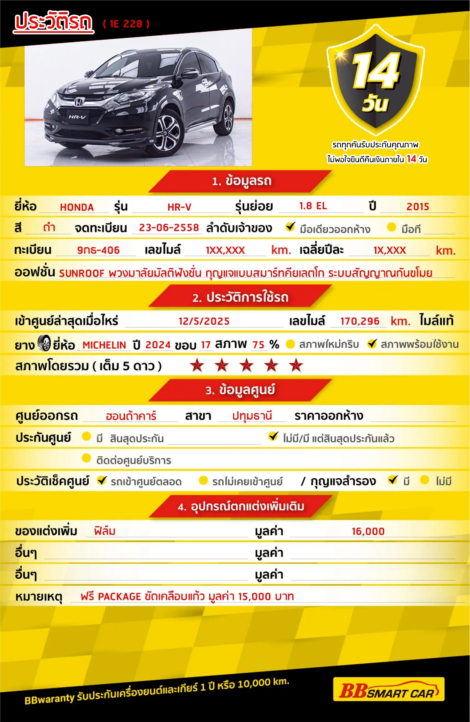 HONDA HR-V 1.8 EL AT 2015 ออกรถ 0 บาท จัดได้ 364,000 Line:@**********แสดงข้อมูล 🔥จอง 199 บาท ส่งบัตรประชาชน รู้ผลพิจารณาภายใน 30 นาที ไม่ผ่านคืนเงินจองทุกกรณี 🔥ซื้อรถกับ BB พร้อมให้คำปรึกษา แก้ทุกปัญหา ให้ทุกเรื่อง บริการ call center 24 ชม. 🔥BB Care Plus รับประกันหลังการขาย สูงสุด 2 ปี หรือ 20,000 km.. 🔥มีรถให้เลือกมากกว่า 1,800 คัน สาขา 1 สี่แยกมไหสวรรย์ ใกล้เดอะมอลล์ท่าพระ รหัสรถ 1E228 ราคา 344,000 บาท ผ่อนเพียง 6,369 บาท Brand. : HONDA Year. : 2015 Model. : HR-V Grade. : 1.8 EL Engine. : 1800 CC Type. : เบนซิน Gearbox : AT Color. : ดำ Mileage. : 176,XXX KM. (ซื้อสด ราคานี้ยังไม่รวมค่าดำเนินการ 10,000 บ.) 🚩 Price. 344,000 บาท ยอดจัด : 354,000 บาท เงินดาวน์ : 0 บาท ประกันภัย : ฟรีประกันภัย 1 ปี ค่าดำเนินการ : 10,000 บาท รวมออกรถ : 0 บาท ผ่อน 36 งวด = 11,750 บาท ผ่อน 48 งวด = 9,120 บาท ผ่อน 60 งวด = 7,604 บาท ผ่อน 72 งวด = 6,836 บาท ผ่อน 84 งวด = 6,369 บาท เงื่อนไขเป็นไปตามที่ไฟแนนซ์กำหนด โปรโมชั่นพิเศษ สำหรับลูกค้าเครดิตดีลือกรับเรทดอกเบี้ยพิเศษ 📍36 งวด = 1.29 % 📍48 งวด = 1.99 % 📍60 งวด = 2.39 % 📍72 งวด = 3.59 % 🔥 เงื่อนไข โปรโมชั่น ดอกเบี้ยเริ่มต้น 1.29% ตลอดอายุสัญญา - ยอดจัดไฟแนนซ์ 300,000-600,000 บาท - ผ่อนสูงสุด 72 เดือน - เป็นลูกค้าประวัติดี พนักงานประจำเงินเดือน 20,000 ขึ้นไป - ค่าดำเนินการแคมเปญ 20,000 บาท (รวมในยอดจัดได้) 🎗Car Hightlight รถสวยๆ วันนี้ขอแนะนำ HONDA HR-V 1.8 EL AT 2015 จุดเด่นออฟชั่น พวงมาลัยไฟฟ้า EPS ไฟ Daytime Running Lights แบบ LED ไฟท้ายแบบ LED ระบบปิดไฟหน้า แบบอัตโนมัติ กระจกมองข้างสีเดียวกับตัวรถ กระจกมองข้าง ปรับและพับด้วยไฟฟ้า พร้อมไฟเลี้ยวในตัว 🎗ภายใน ภายในห้องโดยสารโทนสีดำ เบาะนั่งแบบสปอร์ตหุ้มด้วยหนังสีดำ ปุ่มสตาร์ทเครื่องยนต์ Push Start Button ระบบกุญแจ Honda Smart Key System ระบบปรับอากาศแบบอัตโนมัติ พร้อมแผงควบคุมแบบสัมผัส พวงมาลัยปรับได้ 4 ทิศทาง (ขึ้น-ลง-เข้า-ออก) พวงมาลัยหุ้มหนัง กระจกหน้าต่างไฟฟ้า ขึ้น-ลง One Touch ฝั่งคนขับ มาตรวัดเรืองแสง ปรับเปลี่ยนได้ 7 สี พร้อมจอ LCD ปุ่ม ECON 🎗ภายนอก มือเปิดประตูภายนอก สีเดียวกับตัวรถ ระบบปัดน้ำฝนด้านหน้า – ด้านหลัง กระจังหน้าโครเมียมรมดำ ชายกันชนหน้า – ชายกันชนหลัง สีดำ ชายด้านข้างตัวรถ สีดำ 🎗ความคุ้มค่า สำหรับคันนี้หากเปรียบเทียบราคากับคุณภาพ คันนี้ถือว่าคุ้มค่ามากค่ะ ผ่อนสบายๆก็มีรถขับได้ รถดีมีคุณภาพแบบนี้รีบตัดสินใจซื้อได้เลราคานี้มาไวไปไวนะคะ ⭐️การรับประกันหลังการขาย BB Care Plus สูงสุด 2 ปี หรือ 20,000 km. ด้วยช่างที่ผ่านการอบรมจากศูนย์ชั้นนำของประเทศ 🎉Special offer เฉพาะ บีบีสมาร์ทคาร์ ที่นี่ที่เดียว ⭐ดอกเบี้ยเริ่มต้น 1.29% มีไฟแนนซ์รองรับหลายที่ค่ะ ⭐ฟรี!! แพคเก็จ ขัดเคลือบแก้ว มูลค่า 15,000 บาท ทุกคัน ⭐อนุมัติไว 30 นาที นำเอกสารมาให้ครบรับรถกลับบ้านทันทีค่ะ ⭐BB Care Plus รับประกันหลังการขาย สูงสุด 2 ปี หรือ 20,000 km. ⭐มี 6 สาขา ในกรุ