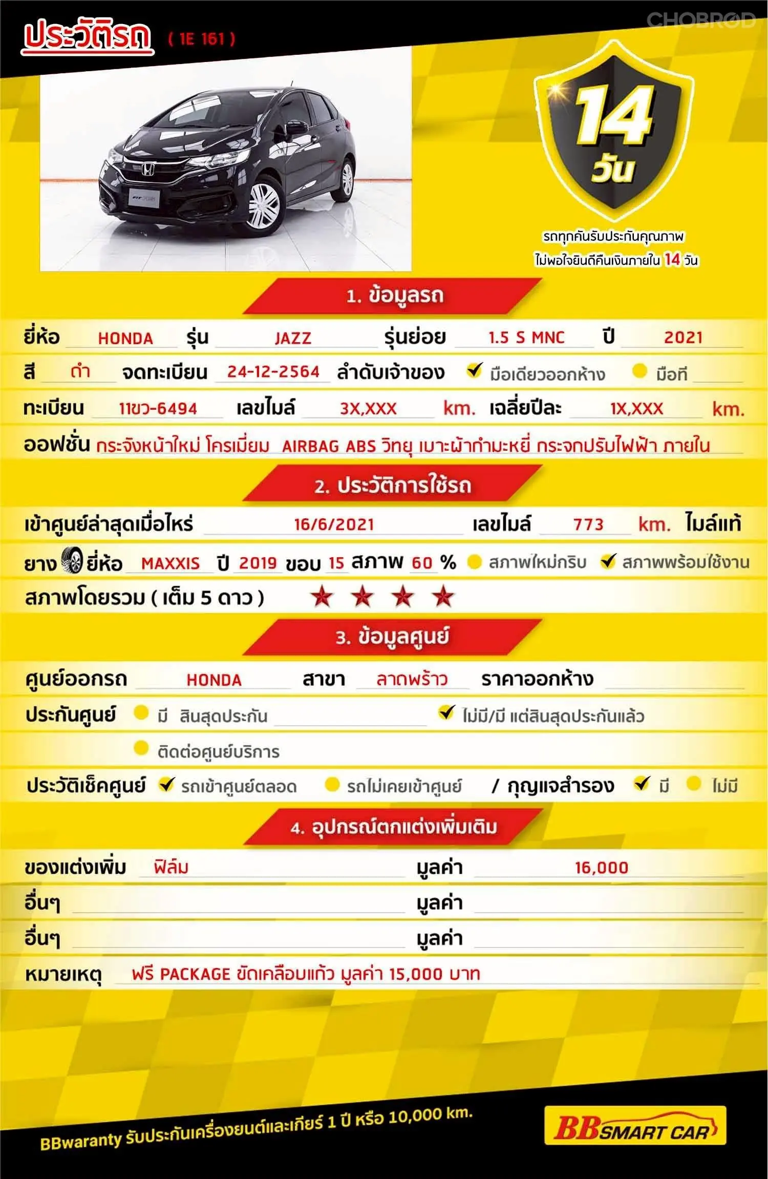 HONDA JAZZ 1.5 S MNC AT 2021 ออกรถ 0 บาท จัดได้ 399,000 Line:@**********แสดงข้อมูล 🔥จอง 199 บาท ส่งบัตรประชาชน รู้ผลพิจารณาภายใน 30 นาที ไม่ผ่านคืนเงินจองทุกกรณี 🔥ซื้อรถกับ BB พร้อมให้คำปรึกษา แก้ทุกปัญหา ให้ทุกเรื่อง บริการ call center 24 ชม. 🔥BB Care Plus รับประกันหลังการขาย สูงสุด 2 ปี หรือ 20,000 km.. 🔥มีรถให้เลือกมากกว่า 1,800 คัน สาขา 1 สี่แยกมไหสวรรย์ ใกล้เดอะมอลล์ท่าพระ รหัสรถ 1E161 ราคา 379,000 บาท ผ่อนเพียง 6,512 บาท Brand. : HONDA Year. : 2021 Model. : JAZZ Grade. : 1.5 S MNC Engine. : 1500 CC Type. : เบนซิน Gearbox : AT Color. : ดำ Mileage. : 33,XXX KM. (ซื้อสด ราคานี้ยังไม่รวมค่าดำเนินการ 10,000 บ.) 🚩 Price. 379,000 บาท ยอดจัด : 389,000 บาท เงินดาวน์ : 0 บาท ประกันภัย : ฟรีประกันภัย 1 ปี ค่าดำเนินการ : 10,000 บาท รวมออกรถ : 0 บาท ผ่อน 36 งวด = 12,530 บาท ผ่อน 48 งวด = 9,640 บาท ผ่อน 60 งวด = 8,009 บาท ผ่อน 72 งวด = 7,165 บาท ผ่อน 84 งวด = 6,512 บาท เงื่อนไขเป็นไปตามที่ไฟแนนซ์กำหนด โปรโมชั่นพิเศษ สำหรับลูกค้าเครดิตดีลือกรับเรทดอกเบี้ยพิเศษ 📍36 งวด = 1.29 % 📍48 งวด = 1.99 % 📍60 งวด = 2.39 % 📍72 งวด = 3.59 % 🔥 เงื่อนไข โปรโมชั่น ดอกเบี้ยเริ่มต้น 1.29% ตลอดอายุสัญญา - ยอดจัดไฟแนนซ์ 300,000-600,000 บาท - ผ่อนสูงสุด 72 เดือน - เป็นลูกค้าประวัติดี พนักงานประจำเงินเดือน 20,000 ขึ้นไป - ค่าดำเนินการแคมเปญ 20,000 บาท (รวมในยอดจัดได้) 🎗Car Hightlight รถสวยๆ วันนี้ขอแนะนำ HONDA JAZZ 1.5 S MNC AT เบนซิน 2021 จุดเด่นออฟชั่น 1 : กระจังหน้าใหม่ โครเมี่ยม 2 : กระจกปรับไฟฟ้า ภายใน 3 : เบาะผ้ากำมะหยี่ 🎗ภายใน AIRBAG ABS วิทยุ 🎗ภายนอก ตัวรถสีดำมาพร้อมกระจังหน้าใหม่ โครเมี่ยม 🎗ความคุ้มค่า สำหรับคันนี้หากเปรียบเทียบราคากับคุณภาพ คันนี้ถือว่าคุ้มค่ามากค่ะ ผ่อนสบายๆก็มีรถขับได้ รถดีมีคุณภาพแบบนี้รีบตัดสินใจซื้อได้เลราคานี้มาไวไปไวนะคะ ⭐️การรับประกันหลังการขาย BB Care Plus สูงสุด 2 ปี หรือ 20,000 km. ด้วยช่างที่ผ่านการอบรมจากศูนย์ชั้นนำของประเทศ 🎉Special offer เฉพาะ บีบีสมาร์ทคาร์ ที่นี่ที่เดียว ⭐ดอกเบี้ยเริ่มต้น 1.29% มีไฟแนนซ์รองรับหลายที่ค่ะ ⭐ฟรี!! แพคเก็จ ขัดเคลือบแก้ว มูลค่า 15,000 บาท ทุกคัน ⭐อนุมัติไว 30 นาที นำเอกสารมาให้ครบรับรถกลับบ้านทันทีค่ะ ⭐BB Care Plus รับประกันหลังการขาย สูงสุด 2 ปี หรือ 20,000 km. ⭐มี 6 สาขา ในกรุงเทพและปริมณฑลใกล้บ้านท่าน ⭐รถทุกคันผ่านตรวจสอบ Inspection เรียบร้อยแล้วค่ะ ผ่าน 5 ดาวทุกคันค่ะ ⭐เซลล์ทุกท่านเป็นมืออาชีพพร้อมให้บริการทุกท่านแน่นอนค่ะ