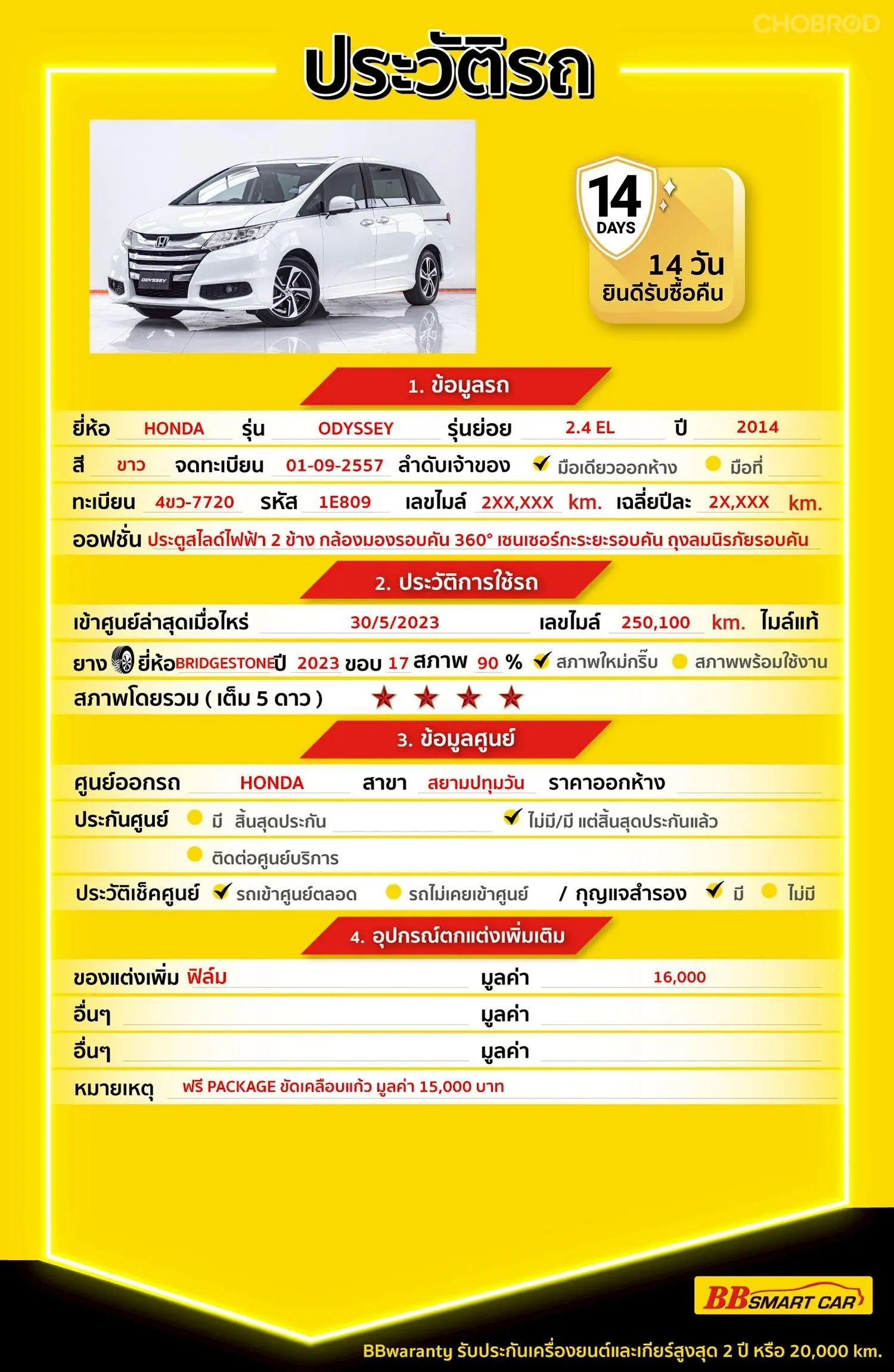HONDA ODYSSEY 2.4 EL AT 2014 ออกรถ 0 บาท จัดได้ 629,000 Line:@bbsmartcar *** Highlight *** ODYSSEY 2.4 EL จดทะเบียน ปี13จด14 หรูหราระดับผู้บริหาร นุ่ม เงียบ สบายทุกที่นั่ง สมกับรถครอบครัวระดับพรีเมียม วิ่งเพียง 299,302 กม รถศูนย์แท้จาก HONDA สยามปทุมวัน ประวัติดี ไร้อุบัติเหตุ ประหยัดจากราคาป้ายแดงได้ถึง 2 ล้านกว่าบาท 💎รับประกันไมล์แท้ 100% กรณีตรวจพบการกรอไมล์ ยินดีคืนเงินเต็มจำนวน 💎รับประกันโครงสร้างรถ ไม่เคยประสบอุบัติเหตุหนัก พลิกคว่ำ น้ำท่วม หรือไฟไหม้ โครงสร้างและแชสซีอยู่ในสภาพสมบูรณ์ สติกเกอร์และแผ่นเพลทครบถ้วน 💎BB Care Plus รับประกันหลังการขายสูงสุด 2 ปี หรือ 20,000 km. 💎ไม่พอใจ ยินดีคืนเงินภายใน 14 วัน 🔥คลิ๊กที่ลิงก์เพื่อดู วิดีโอคันนี้,ประวัติรถ,รูปภาพภายนอกและรูปภายใน https://www.bbsmartcar.com/web-php/index.php/site/cardetail/202601134B354EFD2BFE 🔥เรามีรถรุ่นนี้ให้เลือกชมอีก 57 คัน https://www.bbsmartcar.com/web-php/index.php/site/car?name_brand=HONDA&gear=01&finance=08&search=one 🔥มีรถให้เลือกมากกว่า 1,800 คัน https://www.bbsmartcar.com/web-php/index.php/site/home NO. 1E809 Brand. : HONDA Year. : 2014 Model. : ODYSSEY Grade. : 2.4 EL Engine. : 2400 CC Type. : เบนซิน Gearbox : AT Color. : สีขาว Mileage. : 299,XXX KM. (ซื้อสด ราคานี้ยังไม่รวมค่าดำเนินการ 10,000 บ.) เงินดาวน์ : 0 บาท ประกันภัย : ฟรีประกันภัย 1 ปี ค่าดำเนินการ : 10,000 บาท รวมออกรถ : 0 บาท ผ่อน 72 งวด = 11,953 บาท ผ่อน 84 งวด = 11,135 บาท จุดเด่นออฟชั่น 1 : เครื่องยนต์และระบบขับเคลื่อน เครื่องยนต์เบนซิน 2.0 ลิตร ระบบขับเคลื่อนแบบ Sport Hybrid i-MMD 2 : ระบบเครื่องเสียง 8–11 ลำโพง (ขึ้นกับปี) ระบบปรับอากาศอัตโนมัติ แยก 3 โซน 3 : กล้องมองรอบคัน 360° เซนเซอร์กะระยะรอบคัน 🎗ภายใน เบาะหนังแท้ + เบาะนั่งแถว 2 แบบ Captain Seat (Ottoman Seat + ที่วางขา) เบาะคนขับปรับไฟฟ้า + Memory Seat พวงมาลัยมัลติฟังก์ชัน + Paddle Shift หน้าจอ MID + Head-Up Display (บางรุ่นย่อย) จอสัมผัสกลางขนาด 8 นิ้ว (รองรับ Apple CarPlay / Android Auto) ถุงลมนิรภัยรอบคัน (6 ใบ) Sunroof (บางล็อต) Adaptive Cruise Control (ACC) Collision Mitigation Braking System (CMBS) Lane Keeping Assist System (LKAS) Road Departure Mitigation (RDM) Auto High-Beam (AHB) 🎗ภายนอก ไฟหน้า LED พร้อมไฟ Daytime Running Light ไฟท้าย LED ประตูสไลด์ไฟฟ้า 2 ข้าง ฝาท้ายไฟฟ้า (Hands-Free Power Tailgate) กระจกมองข้างปรับ-พับไฟฟ้า + ไฟเลี้ยวในตัว ล้ออัลลอยขนาด 17 🎗ความคุ้มค่า สำหรับคันนี้หากเปรียบเทียบราคากับคุณภาพ คันนี้ถือว่าคุ้มค่ามากค่ะ ผ่อนสบายๆก็มีรถขับได้ รถดีมีคุณภาพแบบนี้รีบตัดสินใจซื้อได้เลราคานี้มาไวไปไวนะคะ ⭐️การรับประกันหลังการขาย BB Care Plus สูงสุด 2 ปี หรือ 20,000 km. ด้วยช่างที่ผ่านการอบรมจากศูนย์ชั้นนำของประเทศ 🎉Special offer เฉพาะ บีบีสมาร์ทคาร์ ที่นี่ที่เดียว ⭐ดอกเบี้ยเริ่มต้น 1.29% มีไฟแนนซ์รองรับหลายที่ค่ะ ⭐ฟรี!! แพคเก็จ ขัดเคลือบแก้ว มูลค่า 15,000 บาท ทุกคัน ⭐อนุมัติไว 30 นาที นำเอกสารมาให้ครบรับรถกลับบ้านทันทีค่ะ ⭐มี 6 สาขา ในกรุงเทพและปริมณฑลใกล้บ้านท่าน ⭐รถทุกคันผ่านตรวจสอบ Inspection เรียบร้อยแล้วค่ะ ผ่าน 5 ดาว