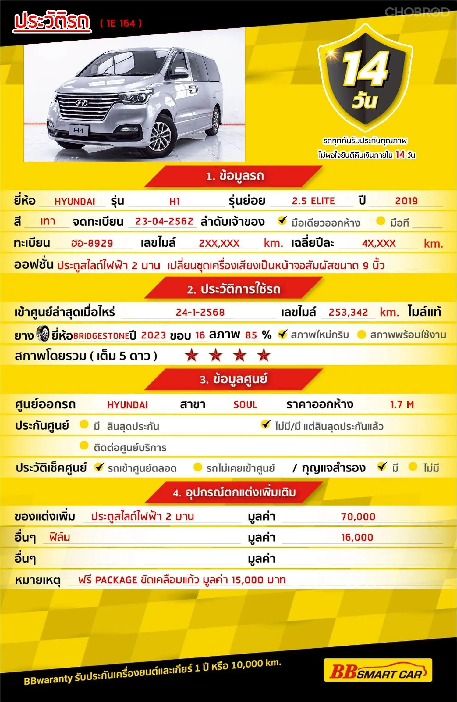 HYUNDAI H1 2.5 ELITE AT 2019 ออกรถ 0 บาท จัดได้ 739,000 บ. Line:***********แสดงข้อมูล 🔥จอง 199 บาท ส่งบัตรประชาชน รู้ผลพิจารณาภายใน 30 นาที ไม่ผ่านคืนเงินจองทุกกรณี 🔥ซื้อรถกับ BB พร้อมให้คำปรึกษา แก้ทุกปัญหา ให้ทุกเรื่อง บริการ call center 24 ชม. 🔥BB Care Plus รับประกันหลังการขาย สูงสุด 2 ปี หรือ 20,000 km.. 🔥มีรถให้เลือกมากกว่า 1,800 คัน สาขา 1 สี่แยกมไหสวรรย์ ใกล้เดอะมอลล์ท่าพระ รหัสรถ 1E164 ราคา 719,000 บาท ผ่อนเพียง 12,724 บาท Brand. : HYUNDAI Year. : 2019 Model. : H1 Grade. : 2.5 ELITE Engine. : 2500 CC Type. : ดีเซล Gearbox : AT Color. : เทา Mileage. : 256,XXX KM. (ซื้อสด ราคานี้ยังไม่รวมค่าดำเนินการ 10,000 บ.) 🚩 Price. 719,000 บาท ยอดจัด : 729,000 บาท เงินดาวน์ : 0 บาท ประกันภัย : ฟรีประกันภัย 1 ปี ค่าดำเนินการ : 10,000 บาท รวมออกรถ : 0 บาท ผ่อน 36 งวด = 24,066 บาท ผ่อน 48 งวด = 18,649 บาท ผ่อน 60 งวด = 15,529 บาท ผ่อน 72 งวด = 13,947 บาท ผ่อน 84 งวด = 12,724 บาท เงื่อนไขเป็นไปตามที่ไฟแนนซ์กำหนด โปรโมชั่นพิเศษ สำหรับลูกค้าเครดิตดีลือกรับเรทดอกเบี้ยพิเศษ 📍36 งวด = 1.29 % 📍48 งวด = 1.99 % 📍60 งวด = 2.39 % 📍72 งวด = 3.59 % 🔥 เงื่อนไข โปรโมชั่น ดอกเบี้ยเริ่มต้น 1.29% ตลอดอายุสัญญา - ยอดจัดไฟแนนซ์ 300,000-600,000 บาท - ผ่อนสูงสุด 72 เดือน - เป็นลูกค้าประวัติดี พนักงานประจำเงินเดือน 20,000 ขึ้นไป - ค่าดำเนินการแคมเปญ 20,000 บาท (รวมในยอดจัดได้) 🎗Car Hightlight รถสวยๆ วันนี้ขอแนะนำ HYUNDAI H1 2.5 ELITE AT 2019 จุดเด่นออฟชั่น 1 : ความเปลี่ยนแปลงของ Hyundai H-1 Elite FE เมื่อเทียบกับรุ่น Elite NS เปลี่ยนชุดเครื่องเสียงเป็นหน้าจอสัมผัสขนาด 9 นิ้ว รองรับการเชื่อมต่อ Bluetooth ตัดโลโก้ Elite บริเวณฝากระโปรงหลัง ราคาเท่าเดิม ผลิตจำนวนจำกัด 2 : ภายในตกแต่งด้วยวัสดุลายไม้ พวงมาลัยปรับได้ 4 ทิศทาง (ขึ้น-ลง-เข้า-ออก) สวิตซ์ควบคุมเครื่องเสียงบนพวงมาลัย ช่องชาร์จไฟ 12V 2 ตำแหน่ง ช่องชาร์จไฟ USB 2 ตำแหน่ง สำหรับผู้โดยสารตอนหลัง มาตรวัดแบบ SuperVision Meters หน้าจอแสดงข้อมูลการขับขี่ MID ระบบปรับอากาศแบบอัตโนมัติ ช่องแอร์สำหรับผู้โดยสารตอนหลัง บนเพดาน ปุ่มควบคุมระบบปรับอากาศแยกส่วน สำหรับผู้โดยสารตอนหลัง กระจกหน้าต่างไฟฟ้าคู่หน้า ขึ้น-ลง One Touch ฝั่งคนขับ กระจกหน้าต่าง พร้อมระบบป้องกันการหนีบฝั่งคนขับ Protection Jam กุญแจรีโมทแบบพับเก็บได้ ช่องเสียบกุญแจเรืองแสง กล่องเก็บแว่นตา แผงบังแดดพร้อมกระจกแต่งหน้า และ ไฟส่องสว่าง ชุดเครื่องเสียงหน้าจอระบบสัมผัส ขนาด 9 นิ้ว ระบบเชื่อมต่อไร้สาย Bluetooth ช่องเชื่อมต่อ USB / AUX ลำโพง 6 ตำแหน่ง เบาะนั่ง 11 ตำแหน่ง (2 + 3 + 3 + 3) เบาะนั่งแถวที่ 2 สามารถปรับหมุนได้ 180 องศา ของแต่งเพิ่มเติม ประตูสไลด์ไฟฟ้า 2 บาน มูลค่ารวมกว่า 70 K 🎗ภายใน เครื่องยนต์และระบบส่งกำลัง Engine & Drivetrain เครื่องยนต์รหัส D4CB ดีเซล 4 สูบ DOHC 16 วาล์ว ขนาด 2.5 ลิตร 2,497 ซีซี กระบอกสูบ x ระยะช่วงชัก 91.0 x 96.0 มิลลิเมตร อัตราส่วนกำลังอัด 16.4 : 1 จ่ายเชื้อเพลิงแบบ Co