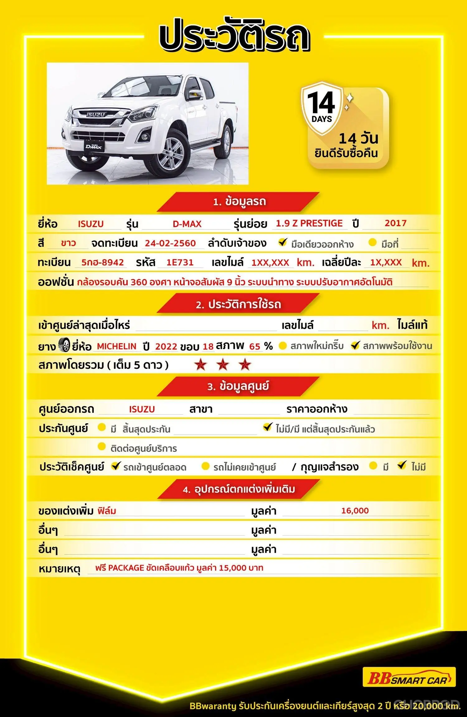 มีการรับประกันจากดีลเลอร์ (6 เดือน) มีบริการช่วยเหลือฉุกเฉินบนท้องถนน 24 ชม. จากดีลเลอร์