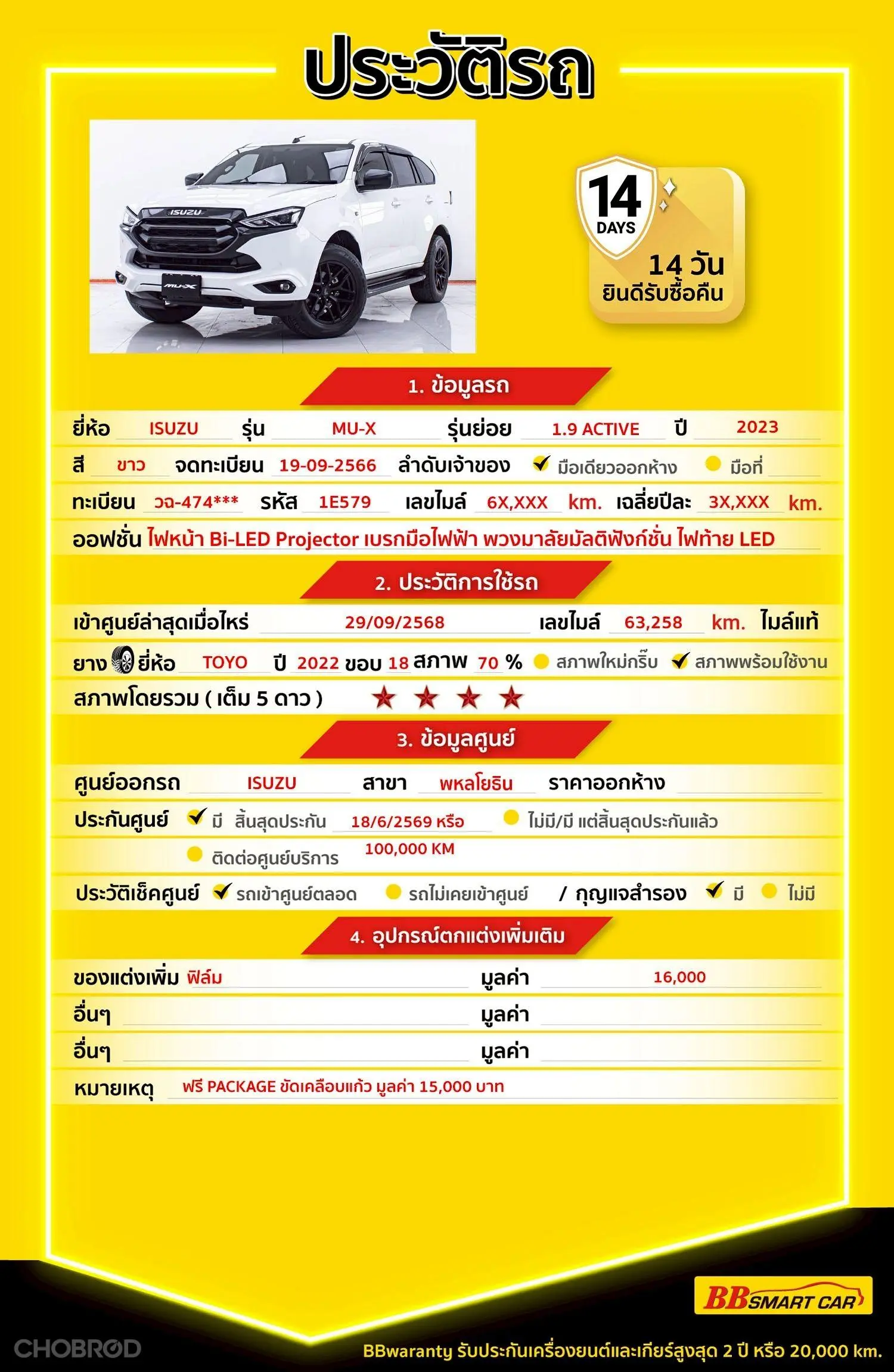 ISUZU MU-X 1.9 ACTIVE AT 2023 ออกรถ 0 บาท จัดได้ 889,000 Line:@bbsmartcar 🔥จอง 199 บาท ส่งบัตรประชาชน รู้ผลพิจารณาภายใน 30 นาที ไม่ผ่านคืนเงินจองทุกกรณี 🔥ซื้อรถกับ BB พร้อมให้คำปรึกษา แก้ทุกปัญหา ให้ทุกเรื่อง บริการ call center 24 ชม. 🔥BB Care Plus รับประกันหลังการขาย สูงสุด 2 ปี หรือ 20,000 km.. 🔥มีรถให้เลือกมากกว่า 1,800 คัน สาขา 1 สี่แยกมไหสวรรย์ ใกล้เดอะมอลล์ท่าพระ รหัสรถ 1E579 ราคา 869,000 บาท ผ่อนเพียง 14,214 บาท Brand. : ISUZU Year. : 2023 Model. : MU-X Grade. : 1.9 ACTIVE Engine. : 1900 CC Type. : ดีเซล Gearbox : AT Color. : ขาว Mileage. : 65,XXX KM. (ซื้อสด ราคานี้ยังไม่รวมค่าดำเนินการ 10,000 บ.) 🚩 Price. 869,000 บาท ยอดจัด : 879,000 บาท เงินดาวน์ : 0 บาท ประกันภัย : ฟรีประกันภัย 1 ปี ค่าดำเนินการ : 10,000 บาท รวมออกรถ : 0 บาท ผ่อน 36 งวด = 26,211 บาท ผ่อน 48 งวด = 19,902 บาท ผ่อน 60 งวด = 17,480 บาท ผ่อน 72 งวด = 15,638 บาท ผ่อน 84 งวด = 14,214 บาท เงื่อนไขเป็นไปตามที่ไฟแนนซ์กำหนด โปรโมชั่นพิเศษ สำหรับลูกค้าเครดิตดีลือกรับเรทดอกเบี้ยพิเศษ 📍36 งวด = 1.29 % 📍48 งวด = 1.99 % 📍60 งวด = 2.39 % 📍72 งวด = 3.59 % 🔥 เงื่อนไข โปรโมชั่น ดอกเบี้ยเริ่มต้น 1.29% ตลอดอายุสัญญา - ยอดจัดไฟแนนซ์ 300,000-600,000 บาท - ผ่อนสูงสุด 72 เดือน - เป็นลูกค้าประวัติดี พนักงานประจำเงินเดือน 20,000 ขึ้นไป - ค่าดำเนินการแคมเปญ 20,000 บาท (รวมในยอดจัดได้) 🎗Car Hightlight รถสวยๆ วันนี้ขอแนะนำ ISUZU MU-X 1.9 ACTIVE AT 2023 จุดเด่นออฟชั่น 1 : ไฟหน้า Bi-LED Projector ดีไซน์แบบ Arrow Signature หรูหรา ลุคไดนามิค ส่องสว่างกว้างไกล พร้อมไฟตัดหมอก LED 2 : ระบบเปิด-ปิดประตูท้ายด้วยไฟฟ้า พร้อมระบบ Jam Protection กุญแจ ISUZU Genius Entry สตาร์ทเครื่องยนต์ด้วย Remote Engine Start และใช้เปิด-ปิดประตูท้ายไฟฟ้า 3 : เบรกมือไฟฟ้า และระบบ Auto Brake Hold ระบบช่วยหยุดอยู่กับที่โดยไม่ต้องเหยียบเบรกค้างไว้ และปลดเบรกอัตโนมัติเมื่อแตะคันเร่ง 🎗ภายใน พวงมาลัยมัลติฟังก์ชั่น พร้อม Sequential Paddle Shift เปลี่ยนเกียร์ได้เพียงปลายนิ้ว / เบาะนั่งดีไซน์หรูสี Saddle Brown ตัดเย็บด้วยวัสดุพิเศษ โอบกระชับ พร้อมเทคโนโลยี COOLMAX ช่วยลดการสะสมความร้อน / เบาะคู่หน้าปรับไฟฟ้า ฝั่งคนขับปรับได้ 8 ทิศทาง และเบาะฝั่งผู้โดยสารปรับได้ 4 ทิศทาง / บบความบันเทิง ISUZU Ultimate Entertainment หน้าจอ Infotainment Display ขนาดใหญ่ 9 นิ้ว รองรับ Apple CarPlay และ Android Auto แบบไร้สาย (เฉพาะสมาร์ทโฟนรุ่นที่รองรับการใช้งาน) พร้อมลำโพง 8 จุด / ระบบปรับอากาศอัตโนมัติแบบ Dual Zone แยกอิสระซ้าย-ขวา พร้อมฟิลเตอร์กรองฝุ่น PM 2.5 / Charging Station รองรับการใช้งาน Power Socket 220V และช่องต่อ DC 12V Powe / ไฟท้าย LED ดีไซน์แบบ Winglet Signature เพิ่มมิติมุมมองให้โดดเด่นด้วยโคมไฟ 3-Line LED 🎗ภายนอก มือเปิดประตูภายนอก สีเดียวกับตัวรถ กระจกมองข้างปรับ-พับด้วยไฟฟ้า พร้อมไฟเลี้ยว ไฟ Daytime Running Light ไฟตัดหมอกหลัง ไฟตัดหมอกคู่หน้า ไฟท้ายแบบ LED ล้อแมกซ์ขอบขนาด 18 นิ้ว เสาอากาศแบบสั้น 🎗ความคุ้มค่า สำหรับคันนี้หากเปรียบเทียบราคากับคุณภาพ คัน
