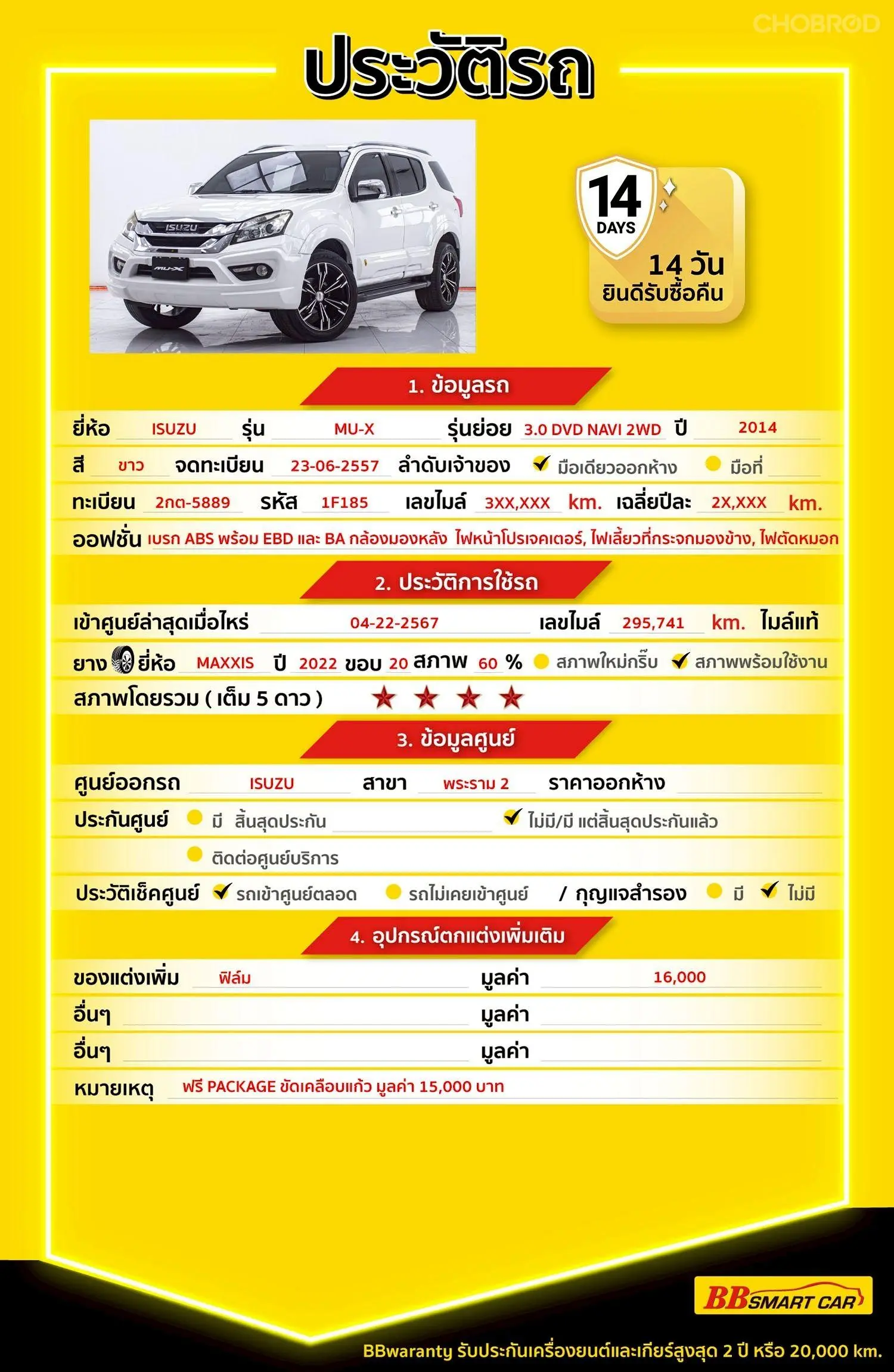 ISUZU MU-X 3.0 DVD NAVI 2WD AT 2014 ออกรถ 0 บาท จัดได้ 509,000 บ. Line:@******แสดงข้อมูล 🔥มีรถให้เลือกมากกว่า 1,800 คัน 🔥รถทุกคันผ่านตรวจสอบ Inspection เรียบร้อยแล้วค่ะ ผ่าน 5 ดาวทุกคันค่ะ 🔥ซื้อรถกับ BB พร้อมให้คำปรึกษา แก้ทุกปัญหา ให้ทุกเรื่อง บริการ call center 24 ชม. 🔥BB Care Plus รับประกันหลังการขาย สูงสุด 2 ปี หรือ 20,000 km. 🔥ฟรี!! แพคเก็จ ขัดเคลือบแก้ว มูลค่า 15,000 บาท ทุกคัน 🔥มี 6 สาขา ในกรุงเทพและปริมณฑลใกล้บ้านท่าน สาขา 1 สี่แยกมไหสวรรย์ ใกล้เดอะมอลล์ท่าพระ รหัสรถ 1F185 ราคา 489,000 บาท ผ่อนเพียง 8,977 บาท Brand. : ISUZU Year. : 2014 Model. : MU-X Grade. : 3.0 DVD NAVI 2WD Engine. : 3000 CC Type. : ดีเซล Gearbox : AT Color. : ขาว Mileage. : 315,XXX KM. (ซื้อสด ราคานี้ยังไม่รวมค่าดำเนินการ 10,000 บ.) 🚩 Price. 489,000 บาท ยอดจัด : 499,000 บาท เงินดาวน์ : 0 บาท ประกันภัย : ค่าดำเนินการ : 10,000 บาท รวมออกรถ : 0 บาท ผ่อน 36 งวด =16,563 บาท ผ่อน 48 งวด =12,854 บาท ผ่อน 60 งวด =10,718 บาท ผ่อน 72 งวด = 9,636 บาท ผ่อน 84 งวด = 8,977 บาท เงื่อนไขเป็นไปตามที่ไฟแนนซ์กำหนด โปรโมชั่นพิเศษ สำหรับลูกค้าเครดิตดีลือกรับเรทดอกเบี้ยพิเศษ 📍36 งวด = 1.29 % 📍48 งวด = 1.99 % 📍60 งวด = 2.39 % 📍72 งวด = 3.59 % 🔥 เงื่อนไข โปรโมชั่น ดอกเบี้ยเริ่มต้น 1.29% ตลอดอายุสัญญา - ยอดจัดไฟแนนซ์ 300,000-600,000 บาท - ผ่อนสูงสุด 72 เดือน - เป็นลูกค้าประวัติดี พนักงานประจำเงินเดือน 20,000 ขึ้นไป - ค่าดำเนินการแคมเปญ 20,000 บาท (รวมในยอดจัดได้) 🎗Car Hightlight รถสวยๆ วันนี้ขอแนะนำ ISUZU MU-X 3.0 DVD NAVI 2WD AT 2014 จุดเด่นออฟชั่น 1 : เครื่องยนต์: ดีเซลคอมมอนเรล 4 สูบ DOHC 16 วาล์ว พร้อม VGS เทอร์โบและอินเตอร์คูลเลอร์ 2 : รหัสเครื่องยนต์: 4JJ1-TCX ความจุ: 2,999 ซีซี กำลังสูงสุด: 177 แรงม้า (130 กิโลวัตต์) ที่ 3,600 รอบ/นาที 3 : แรงบิดสูงสุด: 380 นิวตัน-เมตร ที่ 1,800 - 2,800 รอบ/นาที เกียร์: อัตโนมัติ 5 สปีด พร้อม REV TRONIC การขับเคลื่อน: รุ่นยอดนิยมจะเป็น 4x2 หรือ 4x4 (Terrain Command) 🎗ภายใน * เบาะหนัง, เบาะคนขับปรับไฟฟ้า, จอ Touch Screen พร้อมระบบนำทาง (Navi), พวงมาลัยมัลติฟังก์ชัน * ความบันเทิง: เครื่องเสียงวิทยุ/CD/MP3/USB, จอเพดาน (บางรุ่น), ลำโพง 8 ตัว * ถุงลมนิรภัยคู่หน้า (Airbags) * เบรก ABS พร้อม EBD และ BA * ระบบควบคุมการทรงตัว (บางรุ่น) * กล้องมองหลัง * ระบบกุญแจ Immobilizer 🎗ภายนอก * ไฟหน้าโปรเจคเตอร์, ไฟเลี้ยวที่กระจกมองข้าง, ไฟตัดหมอก * ล้อ MAXXIS ปี 22 ขอบ 20 * กระจกมองข้าง ปรับและพับด้วยไฟฟ้า พร้อมไฟเลี้ยวในตัว * ระบบปัดน้ำฝนด้านหน้า – ด้านหลัง * ไฟ Daytime Running Lights (LED)