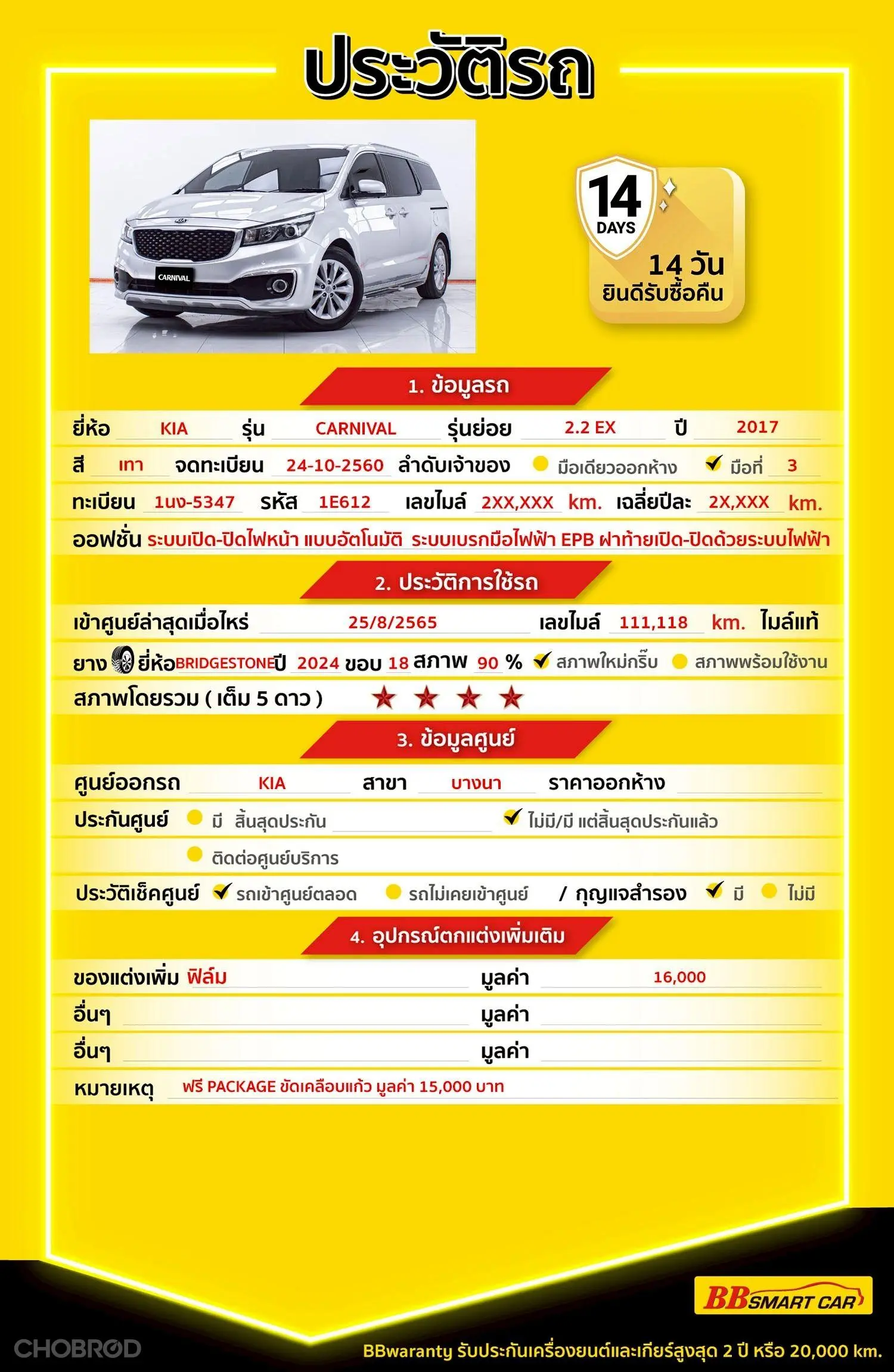 KIA GRAND CARNIVAL 2.2 EX AT 2017 ออกรถ 0 บาท จัดได้ 644,000 บ. Line:***********แสดงข้อมูล 🔥จอง 199 บาท ส่งบัตรประชาชน รู้ผลพิจารณาภายใน 30 นาที ไม่ผ่านคืนเงินจองทุกกรณี 🔥ซื้อรถกับ BB พร้อมให้คำปรึกษา แก้ทุกปัญหา ให้ทุกเรื่อง บริการ call center 24 ชม. 🔥BB Care Plus รับประกันหลังการขาย สูงสุด 2 ปี หรือ 20,000 km.. 🔥มีรถให้เลือกมากกว่า 1,800 คัน สาขา 1 สี่แยกมไหสวรรย์ ใกล้เดอะมอลล์ท่าพระ รหัสรถ 1E612 ราคา 624,000 บาท ผ่อนเพียง 11,406 บาท Brand. : KIA Year. : 2017 Model. : GRAND CARNIVAL Grade. : 2.2 EX Engine. : 2200 CC Type. : ดีเซล Gearbox : AT Color. : เทา Mileage. : 217,XXX KM. (ซื้อสด ราคานี้ยังไม่รวมค่าดำเนินการ 10,000 บ.) 🚩 Price. 624,000 บาท ยอดจัด : 634,000 บาท เงินดาวน์ : 0 บาท ประกันภัย : ฟรีประกันภัย 1 ปี ค่าดำเนินการ : 10,000 บาท รวมออกรถ : 0 บาท ผ่อน 36 งวด = 21,043 บาท ผ่อน 48 งวด = 16,332 บาท ผ่อน 60 งวด = 13,619 บาท ผ่อน 72 งวด = 12,243 บาท ผ่อน 84 งวด = 11,406 บาท เงื่อนไขเป็นไปตามที่ไฟแนนซ์กำหนด โปรโมชั่นพิเศษ สำหรับลูกค้าเครดิตดีลือกรับเรทดอกเบี้ยพิเศษ 📍36 งวด = 1.29 % 📍48 งวด = 1.99 % 📍60 งวด = 2.39 % 📍72 งวด = 3.59 % 🔥 เงื่อนไข โปรโมชั่น ดอกเบี้ยเริ่มต้น 1.29% ตลอดอายุสัญญา - ยอดจัดไฟแนนซ์ 300,000-600,000 บาท - ผ่อนสูงสุด 72 เดือน - เป็นลูกค้าประวัติดี พนักงานประจำเงินเดือน 20,000 ขึ้นไป - ค่าดำเนินการแคมเปญ 20,000 บาท (รวมในยอดจัดได้) 🎗Car Hightlight รถสวยๆ วันนี้ขอแนะนำ KIA GRAND CARNIVAL 2.2 EX AT 2017 จุดเด่นออฟชั่น 1 : ล้ออัลลอย 18 นิ้ว พร้อมยาง 235/60 R18 2 : ระบบเปิด-ปิดไฟหน้า แบบอัตโนมัติ Auto Light 3 : ไฟตัดหมอกหน้า แบบ LED 🎗ภายใน พวงมาลัยหุ้มด้วยหนัง ตกแต่งด้วยลายไม้ ระบบอุ่นพวงมาลัย ระบบปรับอากาศแบบอัตโนมัติ สวิตซ์ควบคุมระบบปรับอากาศด้านหลังแบบดิจิตอล บนหลังคา ระบบฟอกอากาศ Cluster Ionizer ระบบไล่ฝ้ากระจกบังลมหน้าอัตโนมัติ Auto Defog เบาะนั่งผู้โดยสารคู่หน้า ปรับด้วยไฟฟ้า 8 ทิศทาง เบาะนั่งคนขับปรับดันหลังด้วยไฟฟ้า 4 ทิศทาง Lumbar Support เบาะนั่งคู่หน้าพร้อมระบบอุ่น Heated Seat สวิตซ์ปรับเลื่อนตำแหน่งเบาะผู้โดยสารตอนหน้า ด้านข้างเบาะ ม่านบังแดดด้านข้าง ประตูสไลด์ซ้าย-ขวา ม่านบังแดดหน้าต่างด้านข้าง เบาะนั่งแถวที่ 3 – 4 ระบบเครื่องเสียงหน้าจอระบบสัมผัส Touchscreen ขนาด 8 นิ้ว 🎗ภายนอก ไฟส่องสว่าง Pocket Light ที่มือเปิดประตูด้านนอก ไฟท้ายแบบ LED ขอบหน้าต่างภายนอกตัวรถแบบโครเมียม กรอบไฟตัดหมอกหน้าแบบโครเมียม แร็คหลังคา แบบ Built-in กระจกมองข้างพับเก็บ – กางออก แบบอัตโนมัติ กระจกมองหลัง แบบปรับลดแสงอัตโนมัติ 🎗ความคุ้มค่า สำหรับคันนี้หากเปรียบเทียบราคากับคุณภาพ คันนี้ถือว่าคุ้มค่ามากค่ะ ผ่อนสบายๆก็มีรถขับได้ รถดีมีคุณภาพแบบนี้รีบตัดสินใจซื้อได้เลยราคานี้มาไวไปไวนะคะ ⭐️การรับประกันหลังการขาย BB Care Plus สูงสุด 2 ปี หรือ 20,000 km. ด้วยช่างที่ผ่านการอบรมจากศูนย์ชั้นนำของประเทศ 🎉Special offer เฉพาะ บีบีสมาร์ทค