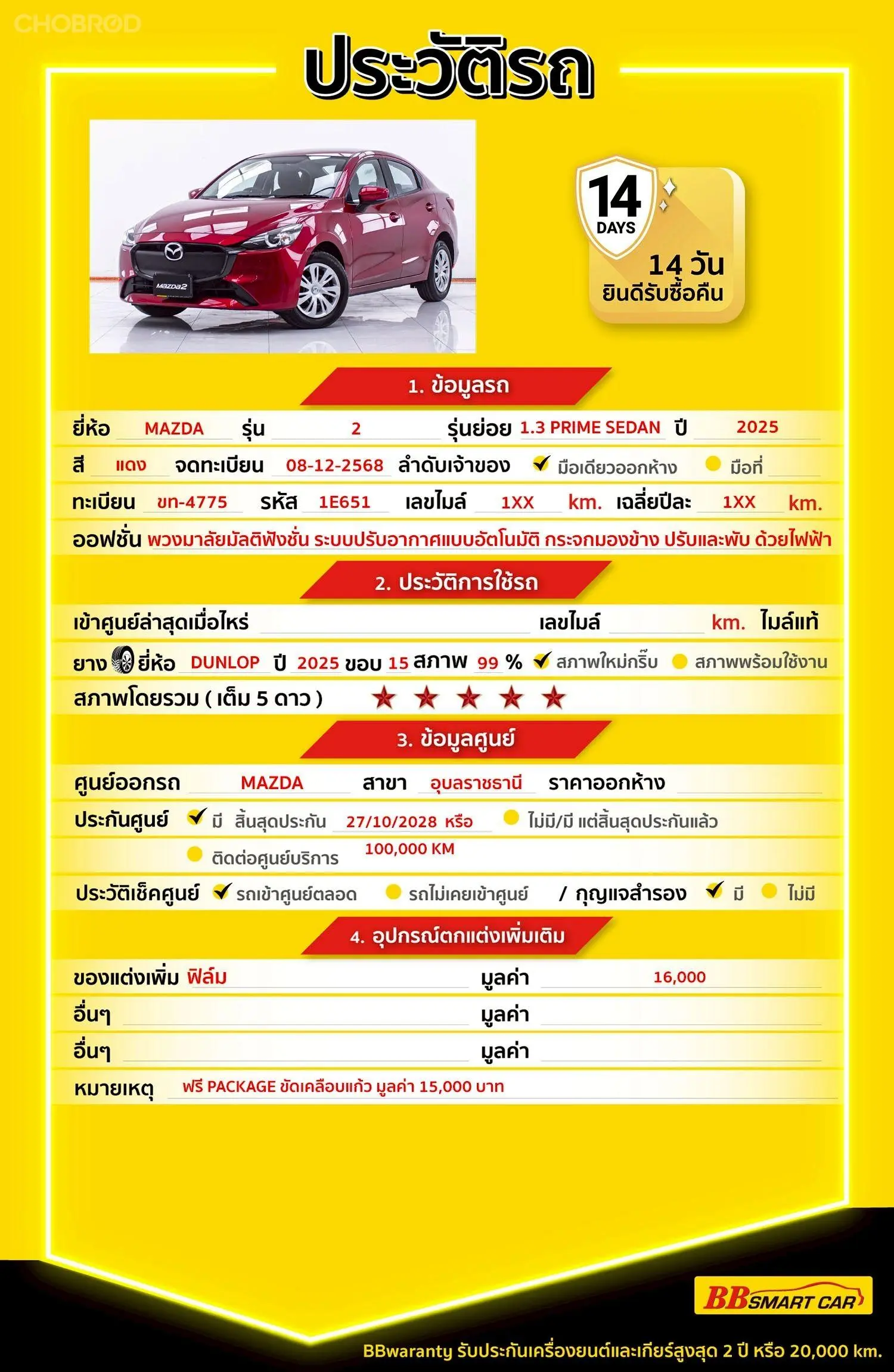 MAZDA 2 1.3 PRIME SEDAN AT 2025 ออกรถ 0 บาท 469,000 บ. Line : @bbsmartcar 🔥มีรถให้เลือกมากกว่า 1,800 คัน 🔥รถทุกคันผ่านตรวจสอบ Inspection เรียบร้อยแล้วค่ะ ผ่าน 5 ดาวทุกคันค่ะ 🔥ซื้อรถกับ BB พร้อมให้คำปรึกษา แก้ทุกปัญหา ให้ทุกเรื่อง บริการ call center 24 ชม. 🔥BB Care Plus รับประกันหลังการขาย สูงสุด 2 ปี หรือ 20,000 km. 🔥ฟรี!! แพคเก็จ ขัดเคลือบแก้ว มูลค่า 15,000 บาท ทุกคัน 🔥มี 6 สาขา ในกรุงเทพและปริมณฑลใกล้บ้านท่าน สาขา 1 สี่แยกมไหสวรรย์ ใกล้เดอะมอลล์ท่าพระ รหัสรถ 1E651 ราคา 449,000 บาท ผ่อนเพียง 7,685 บาท Brand. : MAZDA Year. : 2025 Model. : 2 Grade. : 1.3 PRIME SEDAN Engine. :1300 CC Type. : เบนซิน Gearbox : AT Color. : แดง Mileage. : 1XX KM. (ซื้อสด ราคานี้ยังไม่รวมค่าดำเนินการ 10,000 บ.) 🚩 Price. 449,000 บาท ยอดจัด : 459,000 บาท เงินดาวน์ : 0 บาท ประกันภัย : ค่าดำเนินการ : 10,000 บาท รวมออกรถ : 0 บาท ผ่อน 36 งวด = 14,170 บาท ผ่อน 48 งวด = 10,760 บาท ผ่อน 60 งวด = 9,450 บาท ผ่อน 72 งวด = 8,454 บาท ผ่อน 84 งวด = 7,685 บาท เงื่อนไขเป็นไปตามที่ไฟแนนซ์กำหนด โปรโมชั่นพิเศษ สำหรับลูกค้าเครดิตดีลือกรับเรทดอกเบี้ยพิเศษ 📍36 งวด = 1.29 % 📍48 งวด = 1.99 % 📍60 งวด = 2.39 % 📍72 งวด = 3.59 % 🔥 เงื่อนไข โปรโมชั่น ดอกเบี้ยเริ่มต้น 1.29% ตลอดอายุสัญญา - ยอดจัดไฟแนนซ์ 300,000-600,000 บาท - ผ่อนสูงสุด 72 เดือน - เป็นลูกค้าประวัติดี พนักงานประจำเงินเดือน 20,000 ขึ้นไป - ค่าดำเนินการแคมเปญ 20,000 บาท (รวมในยอดจัดได้) 🎗Car Hightlight รถสวยๆ วันนี้ขอแนะนำ MAZDA 2 1.3 PRIME SEDAN AT 2025 จุดเด่นออฟชั่น 1 : ระบบกุญแจ Smart Keyless Entry 2 : พวงมาลัยมัลติฟังชั่น 3 : กระจกมองข้าง ปรับและพับ ด้วยไฟฟ้า 🎗ภายใน ระบบเปิด-ปิดไฟหน้าอัตโนมัติ ระบบปัดน้ำฝนแบบอัตโนมัติ Rain Sensor เบาะนั่งหุ้มด้วยผ้า สีน้ำตาล แดชบอร์ดหน้า วัสดุสีดำเงา Piano Black กรอบช่องแอร์ สีเงิน / สีบรอนซ์ เบาะนั่งด้านหลัง แยกพับอิสระ 60 : 40 ระบบปรับอากาศแบบอัตโนมัติ ปุ่มควบคุมกลาง Center Commander ระบบสั่งงานด้วยเสียง Voice Recognition ลำโพง 6 ตำแหน่ง เซนเซอร์กะระยะช่วยจอดด้านหลัง 4 ตำแหน่ง 🎗ภายนอก กระจกมองข้างสีเดียวกับตัวรถ กระจกมองข้าง ปรับและพับด้วยไฟฟ้า พร้อมไฟเลี้ยวในตัว มือเปิดประตูภายนอก สีเดียวกับตัวรถ ไฟหน้า LED (มัลติรีเฟลกเตอร์) ไฟท้ายแบบ LED ล้อแม็ก (15") ตัวรถสีแดงโดดเด่นไม่เหมือนใคร ไม่มีน้ำท่วม ไม่มีชนหนักแน่นอนค่ะ 🎗ความคุ้มค่า สำหรับคันนี้หากเปรียบเทียบราคากับคุณภาพ คันนี้ถือว่าคุ้มค่ามากค่ะ ผ่อนสบายๆก็มีรถขับได้ รถดีมีคุณภาพแบบนี้รีบตัดสินใจซื้อได้เลราคานี้มาไวไปไวนะคะ