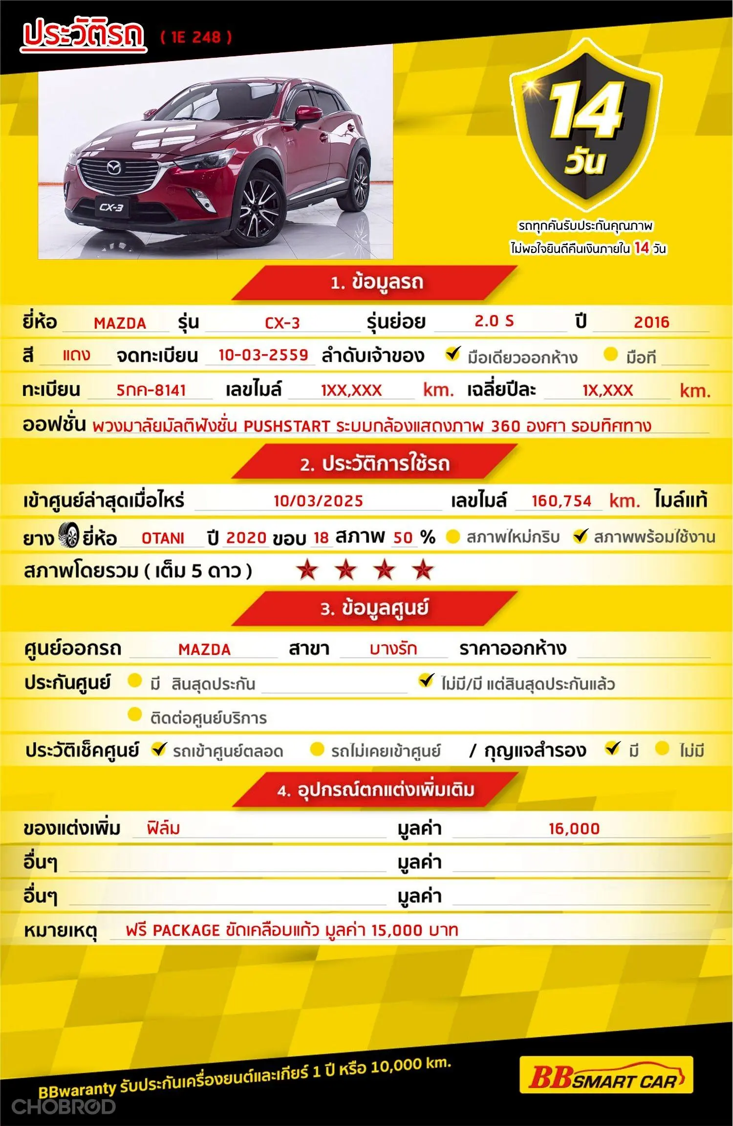 MAZDA CX-3 2.0 S AT 2016 ออกรถ 0 บาท จัดได้ 409,000 Line:@**********แสดงข้อมูล 🔥จอง 199 บาท ส่งบัตรประชาชน รู้ผลพิจารณาภายใน 30 นาที ไม่ผ่านคืนเงินจองทุกกรณี 🔥ซื้อรถกับ BB พร้อมให้คำปรึกษา แก้ทุกปัญหา ให้ทุกเรื่อง บริการ call center 24 ชม. 🔥BB Care Plus รับประกันหลังการขาย สูงสุด 2 ปี หรือ 20,000 km.. 🔥มีรถให้เลือกมากกว่า 1,800 คัน สาขา 1 สี่แยกมไหสวรรย์ ใกล้เดอะมอลล์ท่าพระ รหัสรถ 1E248 ราคา 309,000 บาท ผ่อนเพียง 5,738 บาท Brand. : MAZDA Year. : 2016 Model. : CX-3 Grade. : 2.0 S Engine. : 2000 CC Type. : เบนซิน Gearbox : AT Color. : แดง Mileage. : 165,XXX KM. (ซื้อสด ราคานี้ยังไม่รวมค่าดำเนินการ 10,000 บ.) 🚩 Price. 309,000 บาท ยอดจัด : 319,000 บาท เงินดาวน์ : 0 บาท ประกันภัย : ฟรีประกันภัย 1 ปี ค่าดำเนินการ : 10,000 บาท รวมออกรถ : 0 บาท ผ่อน 36 งวด = 10,588 บาท ผ่อน 48 งวด = 8,218 บาท ผ่อน 60 งวด = 6,852 บาท ผ่อน 72 งวด = 6,160 บาท ผ่อน 84 งวด = 5,738 บาท เงื่อนไขเป็นไปตามที่ไฟแนนซ์กำหนด โปรโมชั่นพิเศษ สำหรับลูกค้าเครดิตดีลือกรับเรทดอกเบี้ยพิเศษ 📍36 งวด = 1.29 % 📍48 งวด = 1.99 % 📍60 งวด = 2.39 % 📍72 งวด = 3.59 % 🔥 เงื่อนไข โปรโมชั่น ดอกเบี้ยเริ่มต้น 1.29% ตลอดอายุสัญญา - ยอดจัดไฟแนนซ์ 300,000-600,000 บาท - ผ่อนสูงสุด 72 เดือน - เป็นลูกค้าประวัติดี พนักงานประจำเงินเดือน 20,000 ขึ้นไป - ค่าดำเนินการแคมเปญ 20,000 บาท (รวมในยอดจัดได้) 🎗Car Hightlight รถสวยๆ วันนี้ขอแนะนำ MAZDA CX-3 2.0 S AT เบนซิน 2016 จุดเด่นออฟชั่น 1 : พวงมาลัยมัลติฟังชั่น 2 : PUSHSTART 3 : ระบบไฟหน้า Adaptive LED Headlamps 🎗ภายใน * ระบบเตือนเมื่อรถเบี่ยงออกนอกเลน * ระบบช่วยหยุดรถอัตโนมัติ * ระบบควบคุมความเร็วอัตโนมัติแบบแปรผัน (MRCC) * ระบบเตือนการชนด้านหน้า และ ช่วยเบรก * ระบบช่วยหยุดรถอัตโนมัติด้านหน้า-หลัง * ระบบกล้องแสดงภาพ 360 องศา รอบทิศทาง * เซนเซอร์กะระยะช่วยจอดด้านหน้า 4 ตำแหน่ง 🎗ภายนอก * กระจังหน้าดีไซน์ใหม่ * ไฟท้าย led 🎗ความคุ้มค่า สำหรับคันนี้หากเปรียบเทียบราคากับคุณภาพ คันนี้ถือว่าคุ้มค่ามากค่ะ ผ่อนสบายๆก็มีรถขับได้ รถดีมีคุณภาพแบบนี้รีบตัดสินใจซื้อได้เลราคานี้มาไวไปไวนะคะ ⭐️การรับประกันหลังการขาย BB Care Plus สูงสุด 2 ปี หรือ 20,000 km. ด้วยช่างที่ผ่านการอบรมจากศูนย์ชั้นนำของประเทศ 🎉Special offer เฉพาะ บีบีสมาร์ทคาร์ ที่นี่ที่เดียว ⭐ดอกเบี้ยเริ่มต้น 1.29% มีไฟแนนซ์รองรับหลายที่ค่ะ ⭐ฟรี!! แพคเก็จ ขัดเคลือบแก้ว มูลค่า 15,000 บาท ทุกคัน ⭐อนุมัติไว 30 นาที นำเอกสารมาให้ครบรับรถกลับบ้านทันทีค่ะ ⭐BB Care Plus รับประกันหลังการขาย สูงสุด 2 ปี หรือ 20,000 km. ⭐มี 6 สาขา ในกรุงเทพและปริมณฑลใกล้บ้านท่าน ⭐รถทุกคันผ่านตรวจสอบ Inspection เรียบร้อยแล้วค่ะ ผ่าน 5 ดาวทุกคันค่ะ ⭐เซลล์ทุกท่านเป็นมืออาชีพพร้อมให้บริการทุกท่านแน่นอนค่ะ