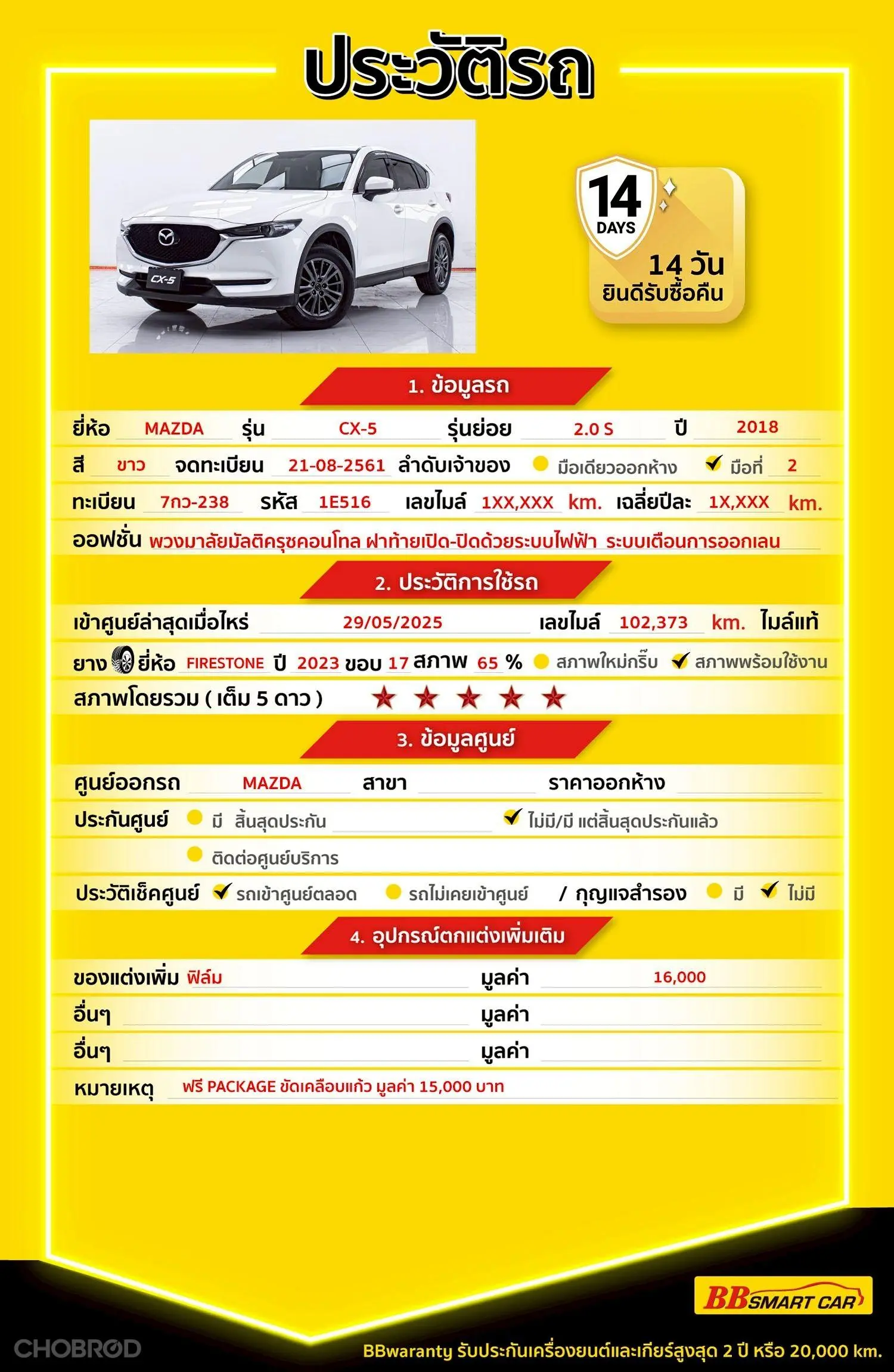 MAZDA CX-5 2.0 S AT 2018 ออกรถ 0 บาท จัดได้ 489,000 บ. Line : ***********แสดงข้อมูล 🔥จอง 199 บาท ส่งบัตรประชาชน รู้ผลพิจารณาภายใน 30 นาที ไม่ผ่านคืนเงินจองทุกกรณี 🔥ซื้อรถกับ BB พร้อมให้คำปรึกษา แก้ทุกปัญหา ให้ทุกเรื่อง บริการ call center 24 ชม. 🔥BB Care Plus รับประกันหลังการขาย สูงสุด 2 ปี หรือ 20,000 km.. 🔥มีรถให้เลือกมากกว่า 1,800 คัน สาขา 1 สี่แยกมไหสวรรย์ ใกล้เดอะมอลล์ท่าพระ รหัสรถ 1E516 ราคา 469,000 บาท ผ่อนเพียง 8,020 บาท Brand. : MAZDA Year. : 2018 Model. : CX-5 Grade. : 2.0 S Engine. : 2000 CC Type. : เบนซิน Gearbox : AT Color. : ขาว Mileage. : 110,XXX KM. (ซื้อสด ราคานี้ยังไม่รวมค่าดำเนินการ 10,000 บ.) 🚩 Price. 469,000 บาท ยอดจัด : 479,000 บาท เงินดาวน์ : 0 บาท ประกันภัย : ฟรีประกันภัย 1 ปี ค่าดำเนินการ : 10,000 บาท รวมออกรถ : 0 บาท ผ่อน 36 งวด = 14,787 บาท ผ่อน 48 งวด = 11,229 บาท ผ่อน 60 งวด = 9,862 บาท ผ่อน 72 งวด = 8,822 บาท ผ่อน 84 งวด = 8,020 บาท เงื่อนไขเป็นไปตามที่ไฟแนนซ์กำหนด โปรโมชั่นพิเศษ สำหรับลูกค้าเครดิตดีลือกรับเรทดอกเบี้ยพิเศษ 📍36 งวด = 1.29 % 📍48 งวด = 1.99 % 📍60 งวด = 2.39 % 📍72 งวด = 3.59 % 🔥 เงื่อนไข โปรโมชั่น ดอกเบี้ยเริ่มต้น 1.29% ตลอดอายุสัญญา - ยอดจัดไฟแนนซ์ 300,000-600,000 บาท - ผ่อนสูงสุด 72 เดือน - เป็นลูกค้าประวัติดี พนักงานประจำเงินเดือน 20,000 ขึ้นไป - ค่าดำเนินการแคมเปญ 20,000 บาท (รวมในยอดจัดได้) 🎗Car Hightlight รถสวยๆ วันนี้ขอแนะนำ MAZDA CX-5 2.0 S AT 2018 จุดเด่นออฟชั่น 1 : พวงมาลัยมัลติครุซคอนโทล 2 : ฝาท้ายเปิด-ปิดด้วยระบบไฟฟ้า Power Tailgate 3 : ระบบเตือนการออกเลน 🎗ภายใน เบาะหนังแท้ เบรค ABS Airbag กระจกมองข้างปรับไฟฟ้า กุญแจรีโมท-สัญญานกันขโมย พวงมาลัย Multifunction พวงมาลัยเพาเวอร์ กระจกไฟฟ้า แอร์ AUTO Cruise Control วิทยุ - CD จอ LCD เล่น DVD เบรกมือไฟฟ้า แอร์ 🎗ภายนอก ไฟเลี้ยวกระจกมองข้าง กล้องส่องหลัง ไฟตัดหมอก ไฟโปรเจคเตอร์ ไฟซีนอน 🎗ความคุ้มค่า สำหรับคันนี้หากเปรียบเทียบราคากับคุณภาพ คันนี้ถือว่าคุ้มค่ามากค่ะ ผ่อนสบายๆก็มีรถขับได้ รถดีมีคุณภาพแบบนี้รีบตัดสินใจซื้อได้เลราคานี้มาไวไปไวนะคะ ⭐️การรับประกันหลังการขาย BB Care Plus สูงสุด 2 ปี หรือ 20,000 km. ด้วยช่างที่ผ่านการอบรมจากศูนย์ชั้นนำของประเทศ 🎉Special offer เฉพาะ บีบีสมาร์ทคาร์ ที่นี่ที่เดียว ⭐ดอกเบี้ยเริ่มต้น 1.29% มีไฟแนนซ์รองรับหลายที่ค่ะ ⭐ฟรี!! แพคเก็จ ขัดเคลือบแก้ว มูลค่า 15,000 บาท ทุกคัน ⭐อนุมัติไว 30 นาที นำเอกสารมาให้ครบรับรถกลับบ้านทันทีค่ะ ⭐BB Care Plus รับประกันหลังการขาย สูงสุด 2 ปี หรือ 20,000 km. ⭐มี 6 สาขา ในกรุงเทพและปริมณฑลใกล้บ้านท่าน ⭐รถทุกคันผ่านตรวจสอบ Inspection เรียบร้อยแล้วค่ะ ผ่าน 5 ดาวทุกคันค่ะ ⭐เซลล์ทุกท่านเป็นมืออาชีพพร้อมให้บริการทุกท่านแน่นอนค่ะ เลือกข้อเสนอที่ให้คุณมากกว่าที่อื่น เพราะเราเล็งเห็นแล้ว ที่บีบีสมาร์ทคาร์ ให้คุณได้มากกว่าที่อื่นแน่นอนครับ มาที่เดียวจบทุกปัญหา หลากหลายรุ