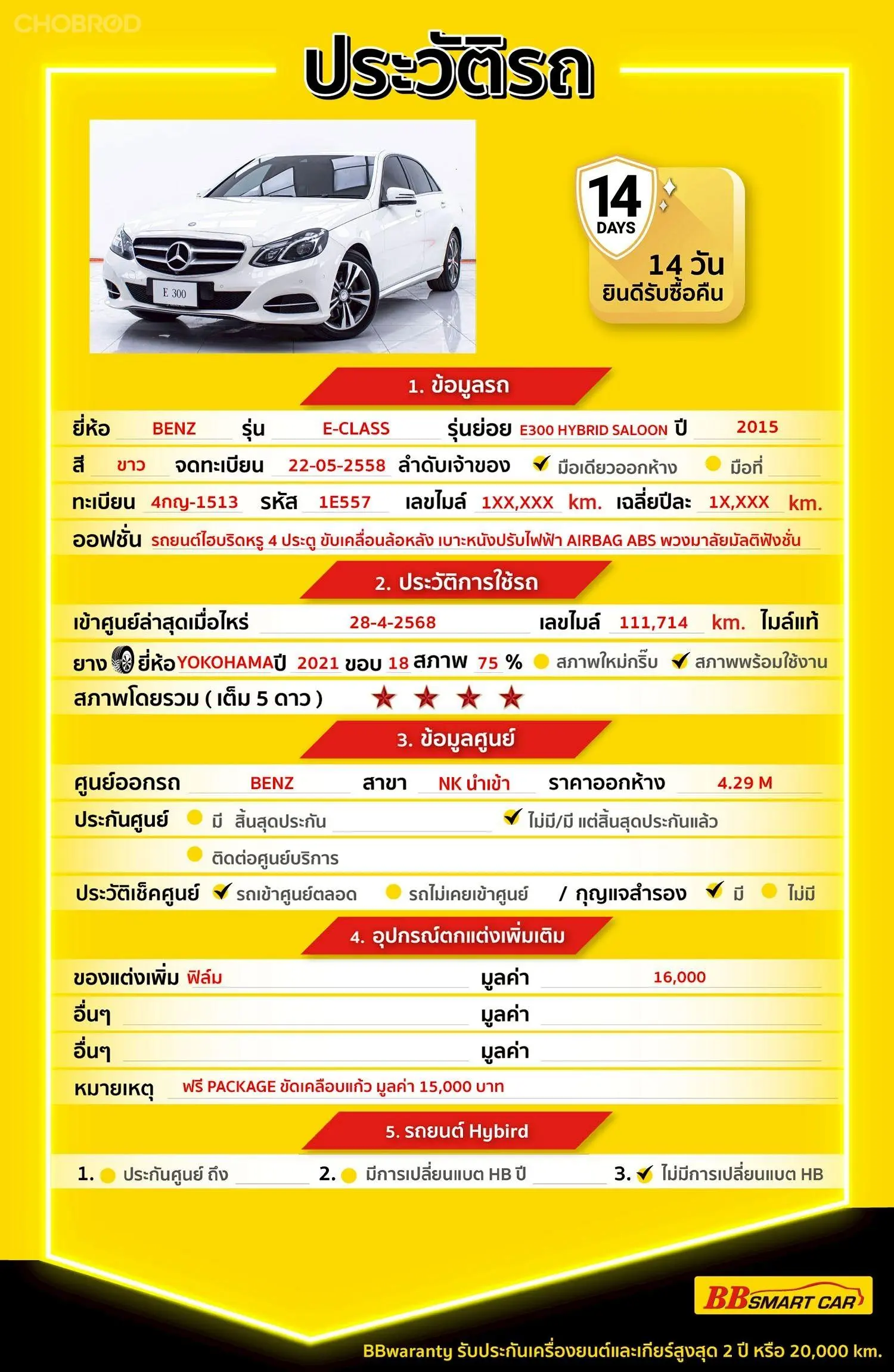BENZ E-CLASS E300 HYBRID SALOON 2.1 AT 2015 ออกรถ 0 บาท จัดได้ 549,000 บ. Line : ***********แสดงข้อมูล 🔥จอง 199 บาท ส่งบัตรประชาชน รู้ผลพิจารณาภายใน 30 นาที ไม่ผ่านคืนเงินจองทุกกรณี 🔥ซื้อรถกับ BB พร้อมให้คำปรึกษา แก้ทุกปัญหา ให้ทุกเรื่อง บริการ call center 24 ชม. 🔥BB Care Plus รับประกันหลังการขาย สูงสุด 2 ปี หรือ 20,000 km.. 🔥มีรถให้เลือกมากกว่า 1,800 คัน สาขา 1 สี่แยกมไหสวรรย์ ใกล้เดอะมอลล์ท่าพระ รหัสรถ 1E557 ราคา 529,000 บาท ผ่อนเพียง 9,696 บาท Brand. : BENZ Year. : 2015 Model. : E-CLASS Grade. : E300 HYBRID SALOON 2.1 Engine. : 2100 CC Type. : ดีเซล+ไฟฟ้า Gearbox : AT Color. : ขาว Mileage. : 117,XXX KM. (ซื้อสด ราคานี้ยังไม่รวมค่าดำเนินการ 10,000 บ.) 🚩 Price. 529,000 บาท ยอดจัด : 539,000 บาท เงินดาวน์ : 0 บาท ประกันภัย : ฟรีประกันภัย 1 ปี ค่าดำเนินการ : 10,000 บาท รวมออกรถ : 0 บาท ผ่อน 36 งวด = 17,889 บาท ผ่อน 48 งวด = 13,884 บาท ผ่อน 60 งวด = 11,577 บาท ผ่อน 72 งวด = 10,408 บาท ผ่อน 84 งวด = 9,696 บาท เงื่อนไขเป็นไปตามที่ไฟแนนซ์กำหนด โปรโมชั่นพิเศษ สำหรับลูกค้าเครดิตดีลือกรับเรทดอกเบี้ยพิเศษ 📍36 งวด = 1.29 % 📍48 งวด = 1.99 % 📍60 งวด = 2.39 % 📍72 งวด = 3.59 % 🔥 เงื่อนไข โปรโมชั่น ดอกเบี้ยเริ่มต้น 1.29% ตลอดอายุสัญญา - ยอดจัดไฟแนนซ์ 300,000-600,000 บาท - ผ่อนสูงสุด 72 เดือน - เป็นลูกค้าประวัติดี พนักงานประจำเงินเดือน 20,000 ขึ้นไป - ค่าดำเนินการแคมเปญ 20,000 บาท (รวมในยอดจัดได้) 🎗Car Hightlight รถสวยๆ วันนี้ขอแนะนำ BENZ E-CLASS E300 HYBRID SALOON 2.1 AT 2015 จุดเด่นออฟชั่น 1 : รถยนต์ไฮบริดหรู 4 ประตู ขับเคลื่อนล้อหลัง มาพร้อมเครื่องยนต์ดีเซล 2.2 ลิตร เทอร์โบชาร์จ และมอเตอร์ไฟฟ้าให้กำลังรวม 204 แรงม้า แรงบิดสูงสุด 500 นิวตันเมตร (เฉพาะเครื่องยนต์) และมีแรงบิดจากมอเตอร์ไฟฟ้าอีก 280 นิวตันเมตร อัตราเร่ง \(0-100\) กม./ชม. อยู่ที่ 7.4 วินาที และอัตราสิ้นเปลืองเฉลี่ยอยู่ที่ประมาณ \(4.1\) ลิตร/100 กม. (หรือประมาณ \(24.39\) กม./ลิตร) 2 : เกียร์อัตโนมัติ 7 จังหวะ 7G-Tronic 3 : เบาะหนังปรับไฟฟ้า พวงมาลัยมัลติฟังชั่น 🎗ภายใน AIRBAG ABS 🎗ภายนอก มือเปิดประตูภายนอก สีเดียวกับตัวรถ ไฟหน้าแบบ LED เปิด-ปิดอัตโนมัติ กระจกมองข้างปรับไฟฟ้า พร้อมไฟเลี้ยว ไฟตัดหมอกหลัง ไฟตัดหมอกคู่หน้า ไฟท้ายแบบ LED ล้อแม็กซ์ขอบขนาด 18 นิ้ว 🎗ความคุ้มค่า สำหรับคันนี้หากเปรียบเทียบราคากับคุณภาพ คันนี้ถือว่าคุ้มค่ามากค่ะ ผ่อนสบายๆก็มีรถขับได้ รถดีมีคุณภาพแบบนี้รีบตัดสินใจซื้อได้เลราคานี้มาไวไปไวนะคะ ⭐️การรับประกันหลังการขาย BB Care Plus สูงสุด 2 ปี หรือ 20,000 km. ด้วยช่างที่ผ่านการอบรมจากศูนย์ชั้นนำของประเทศ 🎉Special offer เฉพาะ บีบีสมาร์ทคาร์ ที่นี่ที่เดียว ⭐ดอกเบี้ยเริ่มต้น 1.29% มีไฟแนนซ์รองรับหลายที่ค่ะ ⭐ฟรี!! แพคเก็จ ขัดเคลือบแก้ว มูลค่า 15,000 บาท ทุกคัน ⭐อนุมัติไว 30 นาที นำเอกสารมาให้ครบรับรถกลับบ้านทันทีค่ะ ⭐BB Care Plus รับประกันหลังการขาย สูงสุด 2 ปี หรือ 20,000 km. ⭐มี 6 สาขา ในกรุงเทพและปริมณฑ