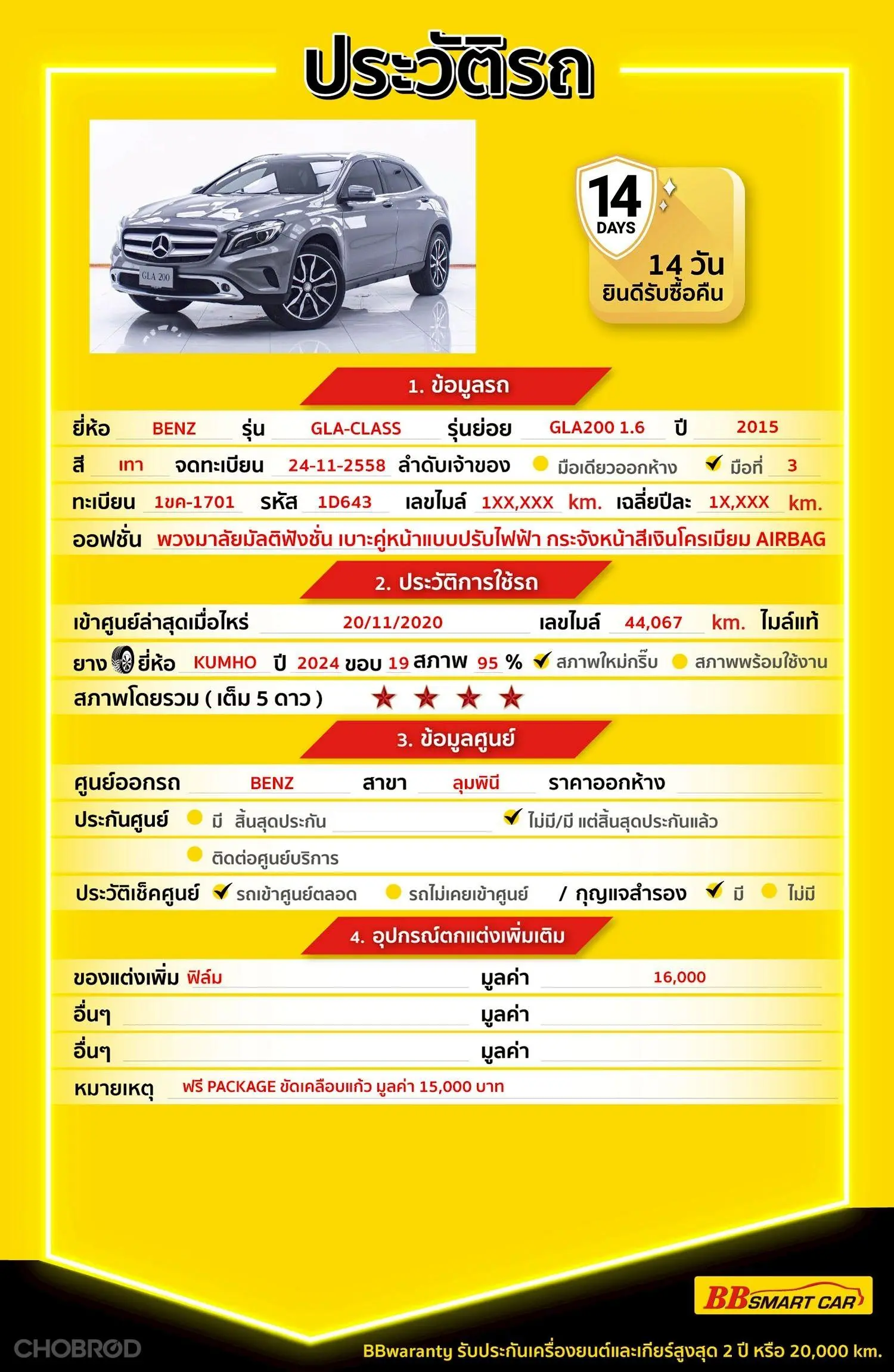 MERCEDES-BENZ GLA-CLASS GLA200 1.6 AT 2015 ออกรถ 0 บาท จัดได้ 494,000 บ. Line:***********แสดงข้อมูล 🔥จอง 199 บาท ส่งบัตรประชาชน รู้ผลพิจารณาภายใน 30 นาที ไม่ผ่านคืนเงินจองทุกกรณี 🔥ซื้อรถกับ BB พร้อมให้คำปรึกษา แก้ทุกปัญหา ให้ทุกเรื่อง บริการ call center 24 ชม. 🔥BB Care Plus รับประกันหลังการขาย สูงสุด 2 ปี หรือ 20,000 km.. 🔥มีรถให้เลือกมากกว่า 1,800 คัน สาขา 1 สี่แยกมไหสวรรย์ ใกล้เดอะมอลล์ท่าพระ รหัสรถ 1D643 ราคา 474,000 บาท ผ่อนเพียง 8,708 บาท Brand. : MERCEDES-BENZ Year. : 2015 Model. : GLA-CLASS Grade. : GLA200 1.6 Engine. : 1600 CC Type. : เบนซิน Gearbox : AT Color. : เทา Mileage. : 101,XXX KM. (ซื้อสด ราคานี้ยังไม่รวมค่าดำเนินการ 10,000 บ.) 🚩 Price. 474,000 บาท ยอดจัด : 484,000 บาท เงินดาวน์ : 0 บาท ประกันภัย : ฟรีประกันภัย 1 ปี ค่าดำเนินการ : 10,000 บาท รวมออกรถ : 0 บาท ผ่อน 36 งวด = 16,064 บาท ผ่อน 48 งวด = 12,468 บาท ผ่อน 60 งวด = 10,396 บาท ผ่อน 72 งวด = 9,346 บาท ผ่อน 84 งวด = 8,708 บาท เงื่อนไขเป็นไปตามที่ไฟแนนซ์กำหนด โปรโมชั่นพิเศษ สำหรับลูกค้าเครดิตดีลือกรับเรทดอกเบี้ยพิเศษ 📍36 งวด = 1.29 % 📍48 งวด = 1.99 % 📍60 งวด = 2.39 % 📍72 งวด = 3.59 % 🔥 เงื่อนไข โปรโมชั่น ดอกเบี้ยเริ่มต้น 1.29% ตลอดอายุสัญญา - ยอดจัดไฟแนนซ์ 300,000-600,000 บาท - ผ่อนสูงสุด 72 เดือน - เป็นลูกค้าประวัติดี พนักงานประจำเงินเดือน 20,000 ขึ้นไป - ค่าดำเนินการแคมเปญ 20,000 บาท (รวมในยอดจัดได้) 🎗Car Hightlight รถสวยๆ วันนี้ขอแนะนำ MERCEDES-BENZ GLA-CLASS GLA200 1.6 AT 2015 จุดเด่นออฟชั่น 1 : ไฟ Daytime Running Light เป็นแบบ LED 2 : กระจังหน้าสีเงินโครเมียม ดูหรูหรา 3 : มาครบทั้งพวงมาลัย Multifunction, 🎗ภายใน GLA 200 แบบเบนซินแถวเรียง 4 สูบ 1.6 ลิตร ให้กำลัง 156 แรงม้าที่ 5,300 รอบ/นาที อัตราเร่ง 0-100กม./ชม. ใน 8.8 วินาที แผงคอนโซลกลาง และแผงคอนโซลหน้า รวมไปถึงจอ Freestand โดยใช้วัสดุหุ้มเบาะทรงสปอร์ตเป็นแบบหนังผสมผ้าสีดำเทา ออปชั่น มาครบทั้งพวงมาลัย Multifunction, ระบบปรับอากาศ Thermatic, เบาะคู่หน้าแบบปรับไฟฟ้า พร้อมตัวดันหลัง และมีหน่วยความจำถึง 3 ค่า เบาะตอนหลังสามารถพับปรับได้ 1/3 , 2/3 🎗ภายนอก ตัวรถสีเทามาพร้อมไฟ Daytime Running Light เป็นแบบ LED 🎗ความคุ้มค่า สำหรับคันนี้หากเปรียบเทียบราคากับคุณภาพ คันนี้ถือว่าคุ้มค่ามากค่ะ ผ่อนสบายๆก็มีรถขับได้ รถดีมีคุณภาพแบบนี้รีบตัดสินใจซื้อได้เลราคานี้มาไวไปไวนะคะ ⭐️การรับประกันหลังการขาย BB Care Plus สูงสุด 2 ปี หรือ 20,000 km. ด้วยช่างที่ผ่านการอบรมจากศูนย์ชั้นนำของประเทศ 🎉Special offer เฉพาะ บีบีสมาร์ทคาร์ ที่นี่ที่เดียว ⭐ดอกเบี้ยเริ่มต้น 1.29% มีไฟแนนซ์รองรับหลายที่ค่ะ ⭐ฟรี!! แพคเก็จ ขัดเคลือบแก้ว มูลค่า 15,000 บาท ทุกคัน ⭐อนุมัติไว 30 นาที นำเอกสารมาให้ครบรับรถกลับบ้านทันทีค่ะ ⭐BB Care Plus รับประกันหลังการขาย สูงสุด 2 ปี หรือ 20,000 km. ⭐มี 6 สาขา ในกรุงเทพและปริมณฑลใกล้บ้านท่าน ⭐รถทุกคันผ่านตรวจสอบ Inspection เรียบร้อยแล้วค่ะ ผ่าน 5 ดาวทุกคันค่ะ ⭐เซลล์ทุกท่านเป็นมืออาชีพพร้อมใ