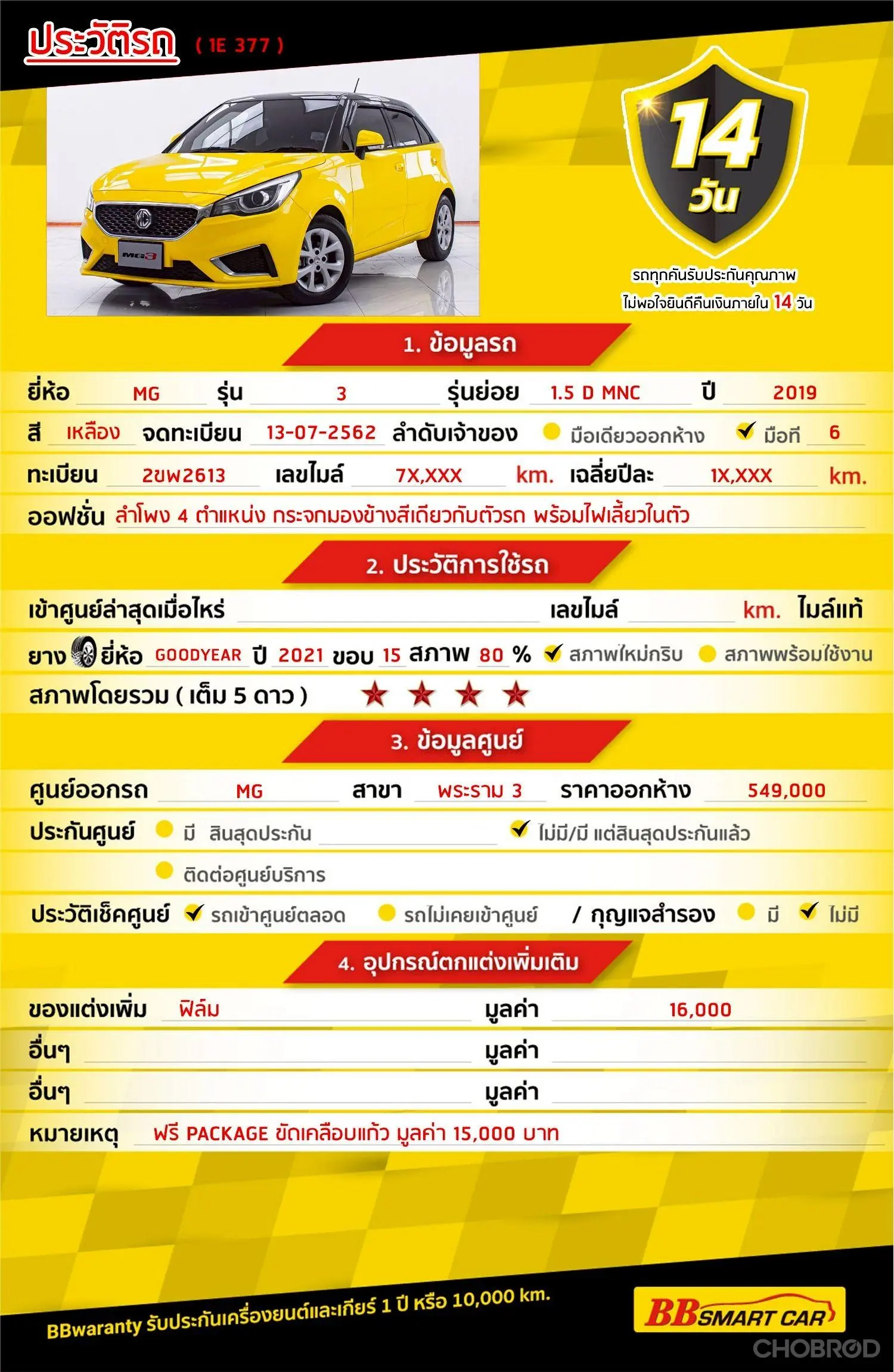 MG 3 1.5 D MNC AT 2019 ออกรถ 0 บาท จัดได้ 169,000 บ. Line:@bbsmartcar 🔥จอง 199 บาท ส่งบัตรประชาชน รู้ผลพิจารณาภายใน 30 นาที ไม่ผ่านคืนเงินจองทุกกรณี 🔥ซื้อรถกับ BB พร้อมให้คำปรึกษา แก้ทุกปัญหา ให้ทุกเรื่อง บริการ call center 24 ชม. 🔥BB Care Plus รับประกันหลังการขาย สูงสุด 2 ปี หรือ 20,000 km.. 🔥มีรถให้เลือกมากกว่า 1,800 คัน สาขา 1 สี่แยกมไหสวรรย์ ใกล้เดอะมอลล์ท่าพระ รหัสรถ 1E377 ราคา 149,000 บาท ผ่อนเพียง 2,947 บาท Brand. : MG Year. : 2019 Model. : 3 Grade. : 1.5 D MNC Engine. : 1500 CC Type. : เบนซิน+LPG Gearbox : AT Color. : เหลือง-ดำ Mileage. : 75,XXX KM. (ซื้อสด ราคานี้ยังไม่รวมค่าดำเนินการ 10,000 บ.) 🚩 Price. 149,000 บาท ยอดจัด : 159,000 บาท เงินดาวน์ : 0 บาท ประกันภัย : ฟรีประกันภัย 1 ปี ค่าดำเนินการ : 10,000 บาท รวมออกรถ : 0 บาท ผ่อน 36 งวด = 5,258 บาท ผ่อน 48 งวด = 4,076 บาท ผ่อน 60 งวด = 3,545 บาท ผ่อน 72 งวด = 3,143 บาท ผ่อน 84 งวด = 2,947 บาท เงื่อนไขเป็นไปตามที่ไฟแนนซ์กำหนด โปรโมชั่นพิเศษ สำหรับลูกค้าเครดิตดีลือกรับเรทดอกเบี้ยพิเศษ 📍36 งวด = 1.29 % 📍48 งวด = 1.99 % 📍60 งวด = 2.39 % 📍72 งวด = 3.59 % 🔥 เงื่อนไข โปรโมชั่น ดอกเบี้ยเริ่มต้น 1.29% ตลอดอายุสัญญา - ยอดจัดไฟแนนซ์ 300,000-600,000 บาท - ผ่อนสูงสุด 72 เดือน - เป็นลูกค้าประวัติดี พนักงานประจำเงินเดือน 20,000 ขึ้นไป - ค่าดำเนินการแคมเปญ 20,000 บาท (รวมในยอดจัดได้) 🎗Car Hightlight รถสวยๆ วันนี้ขอแนะนำ MG 3 1.5 D MNC AT 2019 จุดเด่นออฟชั่น 1 : ไฟ Daytime Running Lights แบบ LED 2 : ล้ออัลลอย ขนาด 15 นิ้ว 3 : เครื่องยนต์เบนซิน 1.5 ลิตร 112 แรงม้า 150 นิวตันเมตร เกียร์อัตโนมัติ 4 จังหวะ พร้อม Manual Mode 🎗ภายใน ระบบปัดน้ำฝนด้านหน้า แบบปรับตั้งหน่วงเวลาได้ เบาะนั่งคนขับ ปรับด้วยมือ 6 ทิศทาง ระบบปรับอากาศสวิตซ์แบบอิเล็กทรอนิค แผงบังแดดคู่หน้า พร้อมกระจกแต่งหน้า ลำโพง 4 ตำแหน่ง เข็มขัดนิรภัยคู่หน้า แบบดึงรั้งกลับพร้อมผ่อนแรงอัตโนมัติ สัญญาณกะระยะถอยจอดด้านหลัง 🎗ภายนอก ไฟ Daytime Running Lights แบบ LED กระจกมองข้างสีเดียวกับตัวรถ พร้อมไฟเลี้ยวในตัว มือเปิดประตูภายนอก สีเดียวกับตัวรถ 🎗ความคุ้มค่า สำหรับคันนี้หากเปรียบเทียบราคากับคุณภาพ คันนี้ถือว่าคุ้มค่ามากค่ะ ผ่อนสบายๆก็มีรถขับได้ รถดีมีคุณภาพแบบนี้รีบตัดสินใจซื้อได้เลราคานี้มาไวไปไวนะคะ ⭐️การรับประกันหลังการขาย BB Care Plus สูงสุด 2 ปี หรือ 20,000 km. ด้วยช่างที่ผ่านการอบรมจากศูนย์ชั้นนำของประเทศ 🎉Special offer เฉพาะ บีบีสมาร์ทคาร์ ที่นี่ที่เดียว ⭐ดอกเบี้ยเริ่มต้น 1.29% มีไฟแนนซ์รองรับหลายที่ค่ะ ⭐ฟรี!! แพคเก็จ ขัดเคลือบแก้ว มูลค่า 15,000 บาท ทุกคัน ⭐อนุมัติไว 30 นาที นำเอกสารมาให้ครบรับรถกลับบ้านทันทีค่ะ ⭐BB Care Plus รับประกันหลังการขาย สูงสุด 2 ปี หรือ 20,000 km. ⭐มี 6 สาขา ในกรุงเทพและปริมณฑลใกล้บ้านท่าน ⭐รถทุกคันผ่านตรวจสอบ Inspection เรียบร้อยแล้วค่ะ ผ่าน 5 ดาวทุกคันค่ะ ⭐เซลล์ทุกท่านเป็นมืออาชีพพร้อมให้บริการทุก