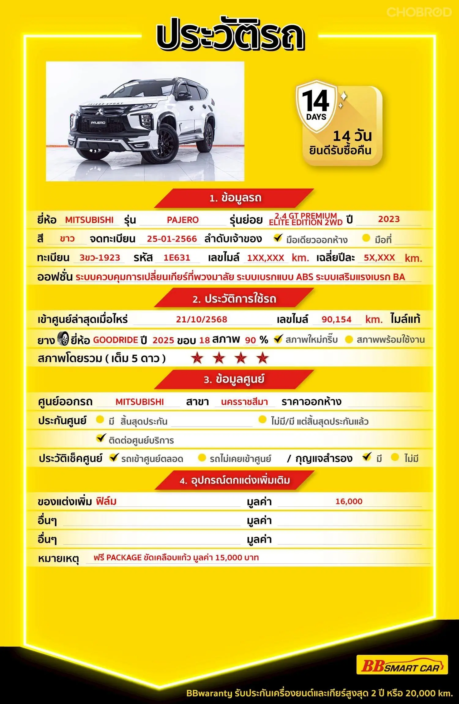 MITSUBISHI PAJERO 2.4 GT PREMIUM ELITE EDITION 4WD AT 2023 ออกรถ 0 บาท 1,114,000 Line:***********แสดงข้อมูล 🔥จอง 199 บาท ส่งบัตรประชาชน รู้ผลพิจารณาภายใน 30 นาที ไม่ผ่านคืนเงินจองทุกกรณี 🔥ซื้อรถกับ BB พร้อมให้คำปรึกษา แก้ทุกปัญหา ให้ทุกเรื่อง บริการ call center 24 ชม. 🔥BB Care Plus รับประกันหลังการขาย สูงสุด 2 ปี หรือ 20,000 km.. 🔥มีรถให้เลือกมากกว่า 1,800 คัน สาขา 1 สี่แยกมไหสวรรย์ ใกล้เดอะมอลล์ท่าพระ รหัสรถ 1E631 ราคา 1,094,000 บาท ผ่อนเพียง 18,483 บาท Brand. : MITSUBISHI Year. : 2023 Model. : PAJERO Grade. : 2.4 GT PREMIUM ELITE EDITION 4WD Engine. : 2400 CC Type. : ดีเซล Gearbox : AT Color. : ขาว-ดำ Mileage. : 100,XXX KM. (ซื้อสด ราคานี้ยังไม่รวมค่าดำเนินการ 10,000 บ.) 🚩 Price. 1,094,000 บาท ยอดจัด : 1,104,000 บาท เงินดาวน์ : 0 บาท ประกันภัย : ฟรีประกันภัย 1 ปี ค่าดำเนินการ : 10,000 บาท รวมออกรถ : 0 บาท ผ่อน 36 งวด = 35,559 บาท ผ่อน 48 งวด = 27,357 บาท ผ่อน 60 งวด = 22,730 บาท ผ่อน 72 งวด = 20,334 บาท ผ่อน 84 งวด = 18,483 บาท เงื่อนไขเป็นไปตามที่ไฟแนนซ์กำหนด โปรโมชั่นพิเศษ สำหรับลูกค้าเครดิตดีลือกรับเรทดอกเบี้ยพิเศษ 📍36 งวด = 1.29 % 📍48 งวด = 1.99 % 📍60 งวด = 2.39 % 📍72 งวด = 3.59 % 🔥 เงื่อนไข โปรโมชั่น ดอกเบี้ยเริ่มต้น 1.29% ตลอดอายุสัญญา - ยอดจัดไฟแนนซ์ 300,000-600,000 บาท - ผ่อนสูงสุด 72 เดือน - เป็นลูกค้าประวัติดี พนักงานประจำเงินเดือน 20,000 ขึ้นไป - ค่าดำเนินการแคมเปญ 20,000 บาท (รวมในยอดจัดได้) 🎗Car Hightlight รถสวยๆ วันนี้ขอแนะนำ MITSUBISHI PAJERO 2.4 GT PREMIUM ELITE EDITION 4WD AT ดีเซล 2023 จุดเด่นออฟชั่น 1 : ขับเคลื่อน 2 ล้อหลัง (2WD) เครื่องยนต์ดีเซล 2.4 ลิตร เกียร์อัตโนมัติ 8 จังหวะ พร้อมโหมดการขับขี่แบบสปอร์ต (Sport Mode) และระบบ INC (Idle Neutral Control). รุ่นนี้มาพร้อมกับระบบเกียร์อัจฉริยะ 8 สปีด 2 : ระบบควบคุมการเปลี่ยนเกียร์ที่พวงมาลัย ระบบเบรกแบบ ABS พร้อมระบบกระจายแรงเบรกแบบอิเล็กทรอนิกส์ EBD ประตูท้ายเปิด-ปิดด้วยไฟฟ้า พร้อมระบบแฮนด์ฟรี 🎗ภายใน ระบบเบรก ABS พร้อมระบบกระจายแรงเบรก EBD, ระบบ Brake Auto Hold, จุดยึดเบาะเด็ก ISOFIX, ช่องจ่ายไฟ AC 220V เสริมความปลอดภัย ด้วยถุงลมนิรภัย 7 ตำแหน่ง ครอบคลุมถึงผู้โดยสารแถวที่ 3 ช่วยลดความรุ่นแรงที่เกิดจากการชนทั้งด้านหน้าและด้านข้าง ทำงานร่วมกับเข็มขัดนิรภัยแบบดึงกลับอัตโนมัติ 2 ทิศทาง พร้อมระบบผ่อนแรง 🎗ภายนอก กระจังหน้ารถสีดำ กระจังหน้ารถสีดำ สัญลักษณ์ “PAJERO SPORT” บนฝากระโปรงหน้า ชุดตกแต่งใต้กันชนหน้า-หลัง สีดำ สปอยเลอร์หลังสีดำ ราวหลังคาสีดำ ไฟหน้ารมดำโปรเจคเตอร์ แบบ Bi-LED พร้อมระบบปรับระดับลำแสงไฟหน้าอัตโนมัติ เสาอากาศสีดำ แบบ Shark Fin สัญลักษณ์ “Elite Edition” บนประตูฝาท้าย ปลายท่อไอเสียสเตนเลส สัญลักษณ์ “PAJERO SPORT” เหนือกล่องเก็บ 🎗ความคุ้มค่า สำหรับคันนี้หากเปรียบเทียบราคากับคุณภาพ คันนี้ถือว่าคุ้มค่ามากค่ะ ผ่อนสบายๆก็มีรถขับได้ รถดีมีคุณภาพแบบนี้รีบตัดสินใจซื้อได้เลราคานี้มาไวไปไวนะคะ ⭐️การรับประกันหล