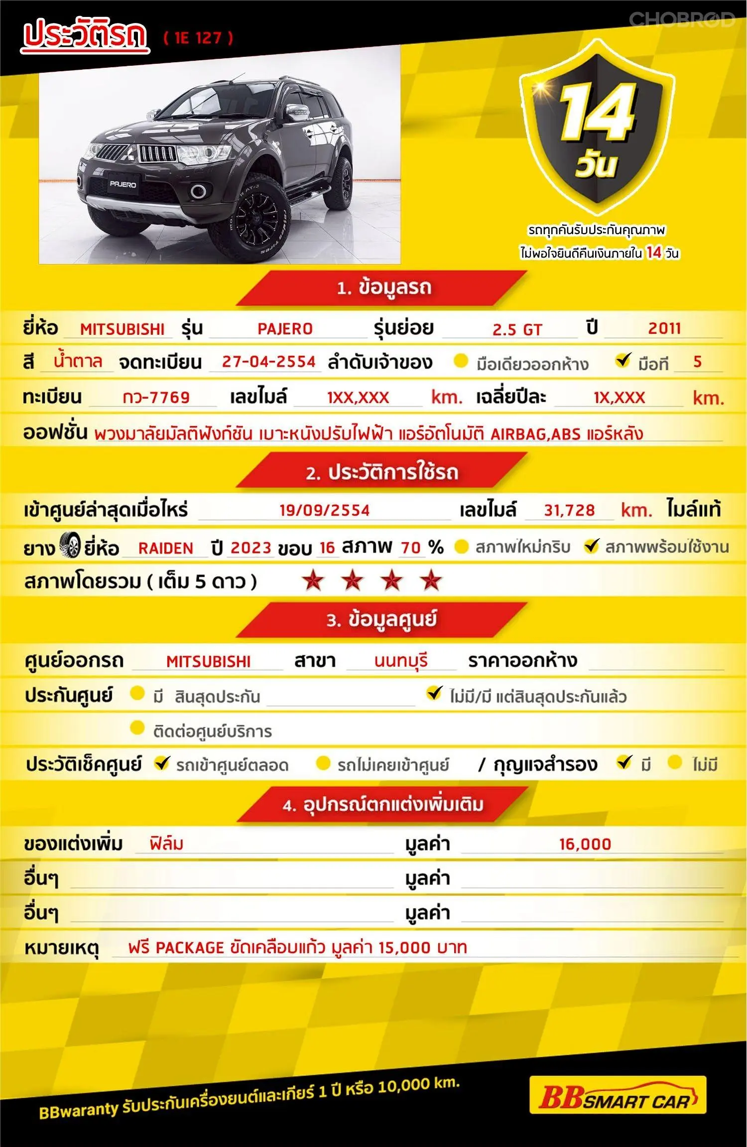 MITSUBISHI PAJERO 2.5 GT AT 2011 ออกรถ 0 บาท จัดได้ 370,000 Line:@**********แสดงข้อมูล 🔥จอง 199 บาท ส่งบัตรประชาชน รู้ผลพิจารณาภายใน 30 นาที ไม่ผ่านคืนเงินจองทุกกรณี 🔥ซื้อรถกับ BB พร้อมให้คำปรึกษา แก้ทุกปัญหา ให้ทุกเรื่อง บริการ call center 24 ชม. 🔥BB Care Plus รับประกันหลังการขาย สูงสุด 2 ปี หรือ 20,000 km.. 🔥มีรถให้เลือกมากกว่า 1,800 คัน สาขา 1 สี่แยกมไหสวรรย์ ใกล้เดอะมอลล์ท่าพระ รหัสรถ 1E127 ราคา 350,000 บาท ผ่อนเพียง 6,994 บาท Brand. : MITSUBISHI Year. : 2011 Model. : PAJERO Grade. : 2.5 GT Engine. : 2500 CC Type. : ดีเซล Gearbox : AT Color. : น้ำตาล Mileage. : 167,XXX KM. (ซื้อสด ราคานี้ยังไม่รวมค่าดำเนินการ 10,000 บ.) 🚩 Price. 350,000 บาท ยอดจัด : 360,000 บาท เงินดาวน์ : 0 บาท ประกันภัย : ฟรีประกันภัย 1 ปี ค่าดำเนินการ : 10,000 บาท รวมออกรถ : 0 บาท ผ่อน 36 งวด = 12,385 บาท ผ่อน 48 งวด = 9,710 บาท ผ่อน 60 งวด = 8,346 บาท ผ่อน 72 งวด = 7,437 บาท ผ่อน 84 งวด = 6,994 บาท เงื่อนไขเป็นไปตามที่ไฟแนนซ์กำหนด โปรโมชั่นพิเศษ สำหรับลูกค้าเครดิตดีลือกรับเรทดอกเบี้ยพิเศษ 📍36 งวด = 1.29 % 📍48 งวด = 1.99 % 📍60 งวด = 2.39 % 📍72 งวด = 3.59 % 🔥 เงื่อนไข โปรโมชั่น ดอกเบี้ยเริ่มต้น 1.29% ตลอดอายุสัญญา - ยอดจัดไฟแนนซ์ 300,000-600,000 บาท - ผ่อนสูงสุด 72 เดือน - เป็นลูกค้าประวัติดี พนักงานประจำเงินเดือน 20,000 ขึ้นไป - ค่าดำเนินการแคมเปญ 20,000 บาท (รวมในยอดจัดได้) 🎗Car Hightlight รถสวยๆ วันนี้ขอแนะนำ MITSUBISHI PAJERO 2.5 GT AT ดีเซล 2011 จุดเด่นออฟชั่น 1 : พวงมาลัยมัลติฟังก์ชัน 2 : เบาะหนังปรับไฟฟ้า 3 : แอร์อัตโนมัติ 🎗ภายใน AIRBAG,ABS,แอร์หลัง,จอแอนดรอยเชื่อมต่อบลูทูธ 🎗ภายนอก ตัวรถสีน้ำตาล รถสวยไม่มีชนหนักแน่นอนค่ะ 🎗ความคุ้มค่า สำหรับคันนี้หากเปรียบเทียบราคากับคุณภาพ คันนี้ถือว่าคุ้มค่ามากค่ะ ผ่อนสบายๆก็มีรถขับได้ รถดีมีคุณภาพแบบนี้รีบตัดสินใจซื้อได้เลราคานี้มาไวไปไวนะคะ ⭐️การรับประกันหลังการขาย BB Care Plus สูงสุด 2 ปี หรือ 20,000 km. ด้วยช่างที่ผ่านการอบรมจากศูนย์ชั้นนำของประเทศ 🎉Special offer เฉพาะ บีบีสมาร์ทคาร์ ที่นี่ที่เดียว ⭐ดอกเบี้ยเริ่มต้น 1.29% มีไฟแนนซ์รองรับหลายที่ค่ะ ⭐ฟรี!! แพคเก็จ ขัดเคลือบแก้ว มูลค่า 15,000 บาท ทุกคัน ⭐อนุมัติไว 30 นาที นำเอกสารมาให้ครบรับรถกลับบ้านทันทีค่ะ ⭐BB Care Plus รับประกันหลังการขาย สูงสุด 2 ปี หรือ 20,000 km. ⭐มี 6 สาขา ในกรุงเทพและปริมณฑลใกล้บ้านท่าน ⭐รถทุกคันผ่านตรวจสอบ Inspection เรียบร้อยแล้วค่ะ ผ่าน 5 ดาวทุกคันค่ะ ⭐เซลล์ทุกท่านเป็นมืออาชีพพร้อมให้บริการทุกท่านแน่นอนค่ะ