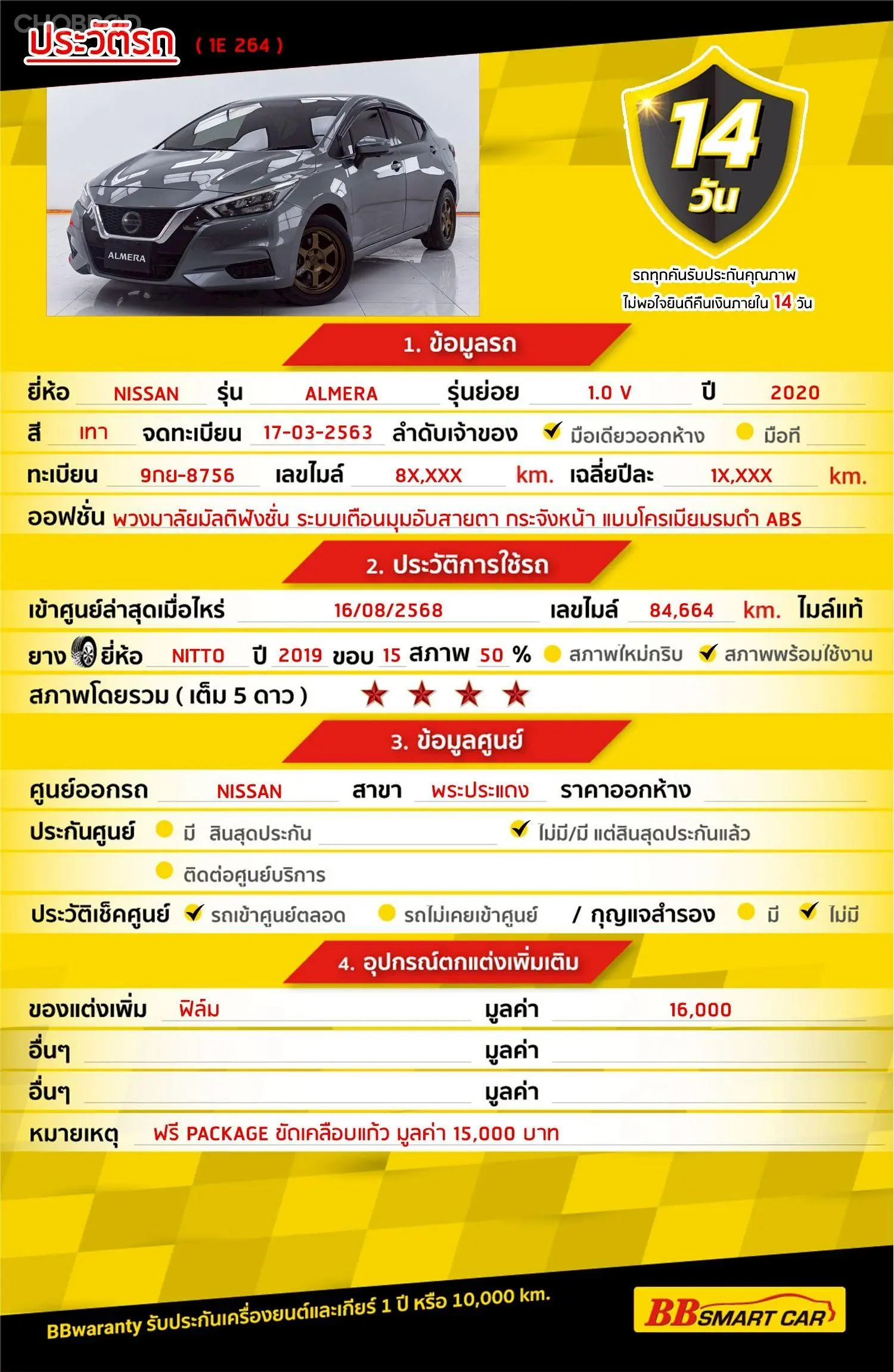 NISSAN ALMERA 1.0 V AT 2020 ออกรถ 0 บาท จัดได้ 344,000 Line:@**********แสดงข้อมูล 🔥จอง 199 บาท ส่งบัตรประชาชน รู้ผลพิจารณาภายใน 30 นาที ไม่ผ่านคืนเงินจองทุกกรณี 🔥ซื้อรถกับ BB พร้อมให้คำปรึกษา แก้ทุกปัญหา ให้ทุกเรื่อง บริการ call center 24 ชม. 🔥BB Care Plus รับประกันหลังการขาย สูงสุด 2 ปี หรือ 20,000 km.. 🔥มีรถให้เลือกมากกว่า 1,800 คัน สาขา 1 สี่แยกมไหสวรรย์ ใกล้เดอะมอลล์ท่าพระ รหัสรถ 1E264 ราคา 324,000 บาท ผ่อนเพียง 5,592 บาท Brand. : NISSAN Year. : 2020 Model. : ALMERA Grade. : 1.0 V Engine. : 1000 CC Type. : เบนซิน Gearbox : AT Color. : เทา Mileage. : 86,XXX KM. (ซื้อสด ราคานี้ยังไม่รวมค่าดำเนินการ 10,000 บ.) 🚩 Price. 324,000 บาท ยอดจัด : 334,000 บาท เงินดาวน์ : 0 บาท ประกันภัย : ฟรีประกันภัย 1 ปี ค่าดำเนินการ : 10,000 บาท รวมออกรถ : 0 บาท ผ่อน 36 งวด = 10,312 บาท ผ่อน 48 งวด = 7,829 บาท ผ่อน 60 งวด = 6,877 บาท ผ่อน 72 งวด = 6,151 บาท ผ่อน 84 งวด = 5,592 บาท เงื่อนไขเป็นไปตามที่ไฟแนนซ์กำหนด โปรโมชั่นพิเศษ สำหรับลูกค้าเครดิตดีลือกรับเรทดอกเบี้ยพิเศษ 📍36 งวด = 1.29 % 📍48 งวด = 1.99 % 📍60 งวด = 2.39 % 📍72 งวด = 3.59 % 🔥 เงื่อนไข โปรโมชั่น ดอกเบี้ยเริ่มต้น 1.29% ตลอดอายุสัญญา - ยอดจัดไฟแนนซ์ 300,000-600,000 บาท - ผ่อนสูงสุด 72 เดือน - เป็นลูกค้าประวัติดี พนักงานประจำเงินเดือน 20,000 ขึ้นไป - ค่าดำเนินการแคมเปญ 20,000 บาท (รวมในยอดจัดได้) 🎗Car Hightlight รถสวยๆ วันนี้ขอแนะนำ NISSAN ALMERA 1.0 V AT 2020 จุดเด่นออฟชั่น 1 : กระจังหน้า แบบโครเมียมรมดำ ไฟตัดหมอกคู่หน้า แบบ LED 2 : พวงมาลัยมัลติฟังชั่น 3 : ระบบเตือนมุมอับสายตา Blind Spot Warning ระบบเตือนเมื่อมีรถตัดผ่านขณะถอยหลัง RCTA 🎗ภายใน กุญแจ Smart Keyless Entry ปุ่มสตาร์ทเครื่องยนต์ Push Start Button ระบบปรับอากาศแบบอัตโนมัติ พร้อมจอแสดงผลดิจิตอล ชุดมาตรวัดแบบเรืองแสง Optitron กล้องมองภาพรอบทิศทาง 360 องศา AVM หน้าจอเครื่องเสียง ระบบสัมผัส Touchscreen ขนาด 8 นิ้ว เครื่องเสียง วิทยุ AM/FM ระบบเชื่อมต่อ Nissan CONNECT รองรับ Apple CarPlay ระบบเบรกป้องกันล้อล็อค ABS ระบบกระจายแรงเบรก EBD ระบบเสริมแรงเบรก BA 🎗ภายนอก กระจังหน้าแบบโครเมียม กันชนหน้า – หลัง สีเดียวกับตัวรถ ล้อแมกซ์ 15" ไฟหน้า-ท้าย ส่องสว่างแบบ LED 🎗ความคุ้มค่า สำหรับคันนี้หากเปรียบเทียบราคากับคุณภาพ คันนี้ถือว่าคุ้มค่ามากค่ะ ผ่อนสบายๆก็มีรถขับได้ รถดีมีคุณภาพแบบนี้รีบตัดสินใจซื้อได้เลราคานี้มาไวไปไวนะคะ ⭐️การรับประกันหลังการขาย BB Care Plus สูงสุด 2 ปี หรือ 20,000 km. ด้วยช่างที่ผ่านการอบรมจากศูนย์ชั้นนำของประเทศ 🎉Special offer เฉพาะ บีบีสมาร์ทคาร์ ที่นี่ที่เดียว ⭐ดอกเบี้ยเริ่มต้น 1.29% มีไฟแนนซ์รองรับหลายที่ค่ะ ⭐ฟรี!! แพคเก็จ ขัดเคลือบแก้ว มูลค่า 15,000 บาท ทุกคัน ⭐อนุมัติไว 30 นาที นำเอกสารมาให้ครบรับรถกลับบ้านทันทีค่ะ ⭐BB Care Plus รับประกันหลังการขาย สูงสุด 2 ปี หรือ 20,000 km. ⭐มี 6 สาขา ในกรุงเทพและปริมณฑลใกล้บ้านท่าน ⭐รถทุกคันผ่านตรวจสอบ Inspection เรียบร้