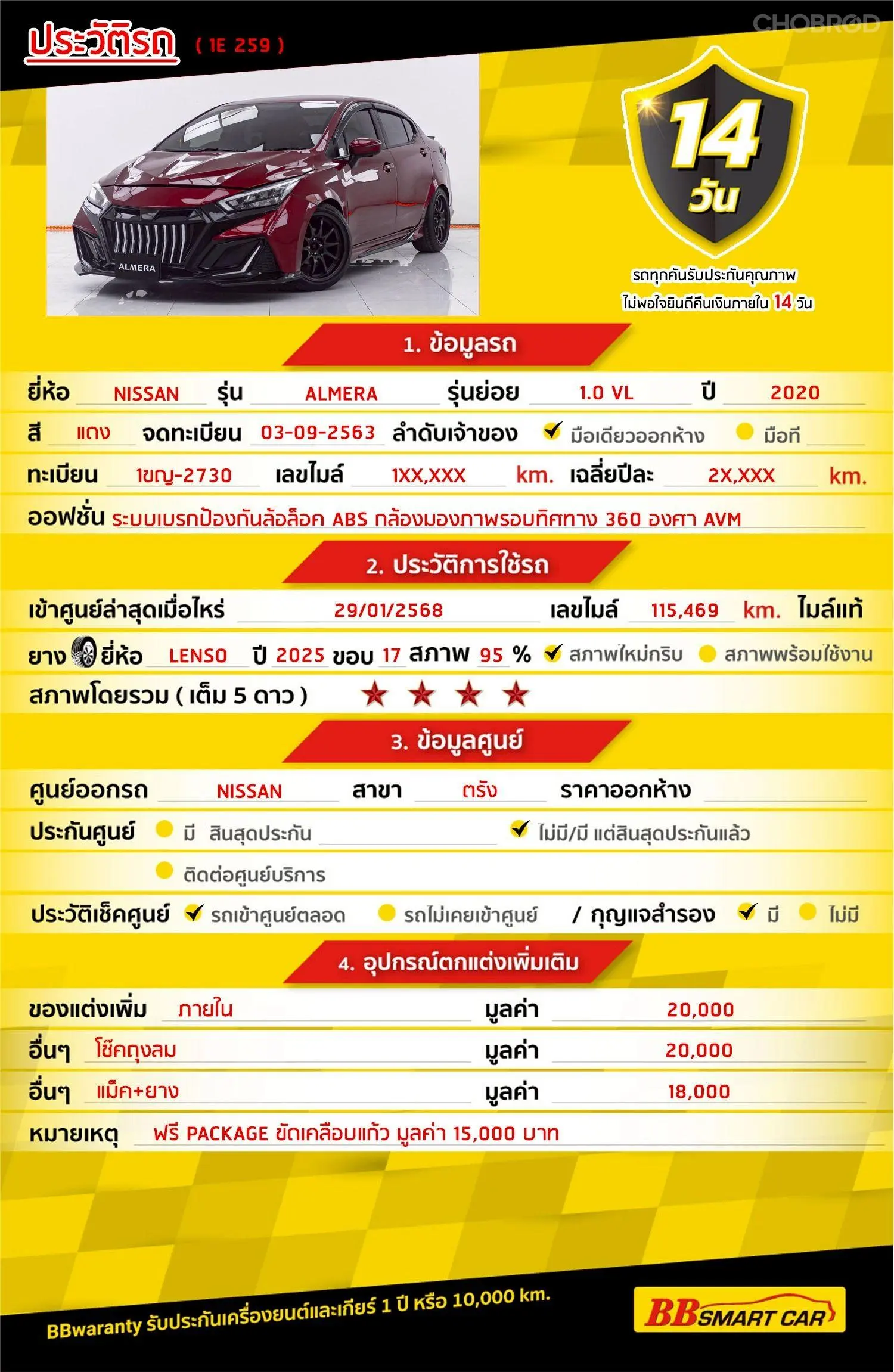 NISSAN ALMERA 1.0 VL AT 2020 ออกรถ 0 บาท จัดได้ 359,000 Line:@**********แสดงข้อมูล 🔥จอง 199 บาท ส่งบัตรประชาชน รู้ผลพิจารณาภายใน 30 นาที ไม่ผ่านคืนเงินจองทุกกรณี 🔥ซื้อรถกับ BB พร้อมให้คำปรึกษา แก้ทุกปัญหา ให้ทุกเรื่อง บริการ call center 24 ชม. 🔥BB Care Plus รับประกันหลังการขาย สูงสุด 2 ปี หรือ 20,000 km.. 🔥มีรถให้เลือกมากกว่า 1,800 คัน สาขา 1 สี่แยกมไหสวรรย์ ใกล้เดอะมอลล์ท่าพระ รหัสรถ 1E259 ราคา 339,000 บาท ผ่อนเพียง 5,843 บาท Brand. : NISSAN Year. : 2020 Model. : ALMERA Grade. : 1.0 VL Engine. : 1000 CC Type. : เบนซิน Gearbox : AT Color. : แดง Mileage. : 138,XXX KM. (ซื้อสด ราคานี้ยังไม่รวมค่าดำเนินการ 10,000 บ.) 🚩 Price. 339,000 บาท ยอดจัด : 349,000 บาท เงินดาวน์ : 0 บาท ประกันภัย : ฟรีประกันภัย 1 ปี ค่าดำเนินการ : 10,000 บาท รวมออกรถ : 0 บาท ผ่อน 36 งวด = 10,775 บาท ผ่อน 48 งวด = 8,181 บาท ผ่อน 60 งวด = 7,185 บาท ผ่อน 72 งวด = 6,429 บาท ผ่อน 84 งวด = 5,843 บาท เงื่อนไขเป็นไปตามที่ไฟแนนซ์กำหนด โปรโมชั่นพิเศษ สำหรับลูกค้าเครดิตดีลือกรับเรทดอกเบี้ยพิเศษ 📍36 งวด = 1.29 % 📍48 งวด = 1.99 % 📍60 งวด = 2.39 % 📍72 งวด = 3.59 % 🔥 เงื่อนไข โปรโมชั่น ดอกเบี้ยเริ่มต้น 1.29% ตลอดอายุสัญญา - ยอดจัดไฟแนนซ์ 300,000-600,000 บาท - ผ่อนสูงสุด 72 เดือน - เป็นลูกค้าประวัติดี พนักงานประจำเงินเดือน 20,000 ขึ้นไป - ค่าดำเนินการแคมเปญ 20,000 บาท (รวมในยอดจัดได้) 🎗Car Hightlight รถสวยๆ วันนี้ขอแนะนำ NISSAN ALMERA 1.0 VL AT เบนซิน จุดเด่นออฟชั่น 1 : กระจังหน้า แบบโครเมียมรมดำ ไฟตัดหมอกคู่หน้า แบบ LED 2 : ถุงลมนิรภัย 6 ตำแหน่ง (คู่หน้า-ด้านข้าง-ม่านนิรภัย) 3 : ระบบเตือนมุมอับสายตา Blind Spot Warning ระบบเตือนเมื่อมีรถตัดผ่านขณะถอยหลัง RCTA ของแต่งเพิ่มเติม ภายใน 20 K. ลำโพง 20 K. โช๊คถุงลม 20 K. แม็ค+ยาง 18 K. รวมมูลค่ากว่า 78 K 🎗ภายใน กุญแจ Smart Keyless Entry ปุ่มสตาร์ทเครื่องยนต์ Push Start Button ระบบปรับอากาศแบบอัตโนมัติ พร้อมจอแสดงผลดิจิตอล ชุดมาตรวัดแบบเรืองแสง Optitron กล้องมองภาพรอบทิศทาง 360 องศา AVM หน้าจอเครื่องเสียง ระบบสัมผัส Touchscreen ขนาด 8 นิ้ว เครื่องเสียง วิทยุ AM/FM ระบบเชื่อมต่อ Nissan CONNECT รองรับ Apple CarPlay ระบบเบรกป้องกันล้อล็อค ABS ระบบกระจายแรงเบรก EBD ระบบเสริมแรงเบรก BA 🎗ภายนอก กระจังหน้าแบบโครเมียม กันชนหน้า – หลัง สีเดียวกับตัวรถ 🎗ความคุ้มค่า สำหรับคันนี้หากเปรียบเทียบราคากับคุณภาพ คันนี้ถือว่าคุ้มค่ามากค่ะ ผ่อนสบายๆก็มีรถขับได้ รถดีมีคุณภาพแบบนี้รีบตัดสินใจซื้อได้เลราคานี้มาไวไปไวนะคะ ⭐️การรับประกันหลังการขาย BB Care Plus สูงสุด 2 ปี หรือ 20,000 km. ด้วยช่างที่ผ่านการอบรมจากศูนย์ชั้นนำของประเทศ 🎉Special offer เฉพาะ บีบีสมาร์ทคาร์ ที่นี่ที่เดียว ⭐ดอกเบี้ยเริ่มต้น 1.29% มีไฟแนนซ์รองรับหลายที่ค่ะ ⭐ฟรี!! แพคเก็จ ขัดเคลือบแก้ว มูลค่า 15,000 บาท ทุกคัน ⭐อนุมัติไว 30 นาที นำเอกสารมาให้ครบรับรถกลับบ้านทันทีค่ะ ⭐BB Care Plus รับประกันหลังการขาย สูงสุด 2 ปี หรือ 20,000 km. ⭐มี 6 สา