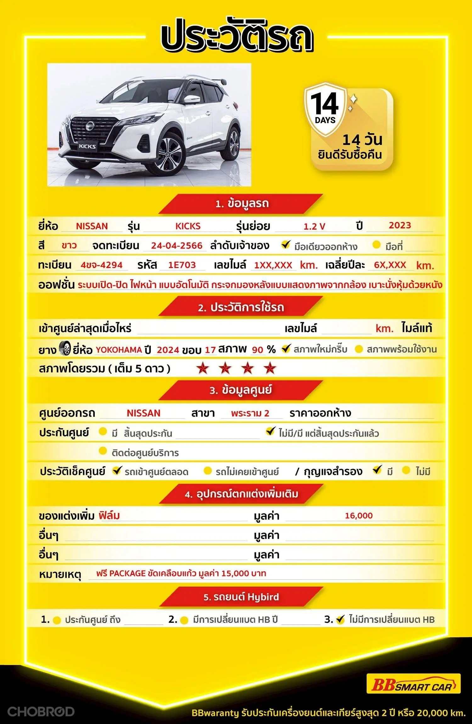 NISSAN KICKS 1.2 V AT 2023 ออกรถ 0 บาท จัดได้ 564,000 . Line : @**********แสดงข้อมูล 🔥จอง 199 บาท ส่งบัตรประชาชน รู้ผลพิจารณาภายใน 30 นาที ไม่ผ่านคืนเงินจองทุกกรณี 🔥ซื้อรถกับ BB พร้อมให้คำปรึกษา แก้ทุกปัญหา ให้ทุกเรื่อง บริการ call center 24 ชม. 🔥BB Care Plus รับประกันหลังการขาย สูงสุด 2 ปี หรือ 20,000 km.. 🔥มีรถให้เลือกมากกว่า 1,800 คัน สาขา 1 สี่แยกมไหสวรรย์ ใกล้เดอะมอลล์ท่าพระ รหัสรถ 1E703 ราคา 542,000 บาท ผ่อนเพียง 8,521 บาท Brand. : NISSAN Year. : 2023 Model. : KICKS Grade. : 1.2 V Engine. : 1200 CC Type. : เบนซิน+ไฟฟ้า Gearbox : AT Color. : ขาว Mileage. : 122,XXX KM. (ซื้อสด ราคานี้ยังไม่รวมค่าดำเนินการ 10,000 บ.) 🚩 Price. 542,000 บาท ยอดจัด : 554,000 บาท เงินดาวน์ : 0 บาท ประกันภัย : ฟรีประกันภัย 1 ปี ค่าดำเนินการ : 10,000 บาท รวมออกรถ : 0 บาท ผ่อน 36 งวด = 15,714 บาท ผ่อน 48 งวด = 11,932 บาท ผ่อน 60 งวด = 10,480 บาท ผ่อน 72 งวด = 9,375 บาท ผ่อน 84 งวด = 8,521 บาท เงื่อนไขเป็นไปตามที่ไฟแนนซ์กำหนด โปรโมชั่นพิเศษ สำหรับลูกค้าเครดิตดีลือกรับเรทดอกเบี้ยพิเศษ 📍36 งวด = 1.29 % 📍48 งวด = 1.99 % 📍60 งวด = 2.39 % 📍72 งวด = 3.59 % 🔥 เงื่อนไข โปรโมชั่น ดอกเบี้ยเริ่มต้น 1.29% ตลอดอายุสัญญา - ยอดจัดไฟแนนซ์ 300,000-600,000 บาท - ผ่อนสูงสุด 72 เดือน - เป็นลูกค้าประวัติดี พนักงานประจำเงินเดือน 20,000 ขึ้นไป - ค่าดำเนินการแคมเปญ 20,000 บาท (รวมในยอดจัดได้) 🎗Car Hightlight รถสวยๆ วันนี้ขอแนะนำ NISSAN KICKS 1.2 V AT 2023 จุดเด่นออฟชั่น 1 : ระบบเปิด-ปิด ไฟหน้า แบบอัตโนมัติ ไฟตัดหมอกคู่หน้า แบบ LED 2 : เบาะนั่งหุ้มด้วยหนัง สีดำ ภายในห้องโดยสาร ตกแต่งด้วยสีดำเงา Piano Black แผงประตูหุ้มด้วยหนัง สีดำ มือเปิดประตูภายในห้องโดยสาร โครเมียม 3 : กระจกมองหลังแบบแสดงภาพจากกล้อง Intelligent Rear View Monitor 🎗ภายใน หน้าจอเครื่องเสียง ระบบสัมผัส Touchscreen ขนาด 8 นิ้ว ระบบเชื่อมต่อไร้สาย Bluetooth,ระบบเชื่อมต่อ Nissan CONNECT ,รองรับระบบ Apple CarPlay / Android Auto , ช่องเสียบ AUX ลำโพง 6 ตำแหน่ง ระบบกล้องรอบคัน 360 องศา Around View Monitor ระบบตรวจจับวัตถุที่เคลื่อนไหวจากกล้องรอบคัน Moving Object Detection แผงทับทิม ตกแต่งฝาท้ายแบบยาว แผงบังแดด พร้อมไฟส่องสว่าง แผงปิดสัมภาระด้านท้าย ระบบไฟสูงอัตโนมัติ High Beam Assist ระบบควบคุมความเร็วอัตโนมัติแบบแปรผัน Intelligent Cruise Control ระบบเตือนมุมอับสายตา Blind Spot Warning ระบบเตือนรถตัดผ่านขณะถอยหลัง Rear Cross Traffic Alert ระบบเตือนเมื่อรถออกนอกเลน Lane Departure Warning 🎗ภายนอก กระจกมองข้างสีเดียวกับตัวรถ กระจกมองข้าง ปรับและพับด้วยไฟฟ้า พร้อมไฟเลี้ยวในตัว มือเปิดประตูภายนอก สีเดียวกับตัวรถ ระบบปัดน้ำฝนด้านหน้า – ด้านหลัง ไฟ Daytime Running Light ไฟท้ายแบบ LED เสาอากาศครีบฉลาม Shark Fin ฝาปิดท้ายควบคุมด้วยไฟฟ้า) ล้อแม็ก (17") 🎗ความคุ้มค่า สำหรับคันนี้หากเปรียบเทียบราคากับคุณภาพ คันนี้ถือว่าคุ้มค่ามากค่ะ ผ่อนสบายๆก็มีรถขับได้ รถดีมีคุณภาพแบบนี้รีบตัดสินใจซื้อได้เลราคานี้มาไวไปไวนะคะ ⭐️การรั