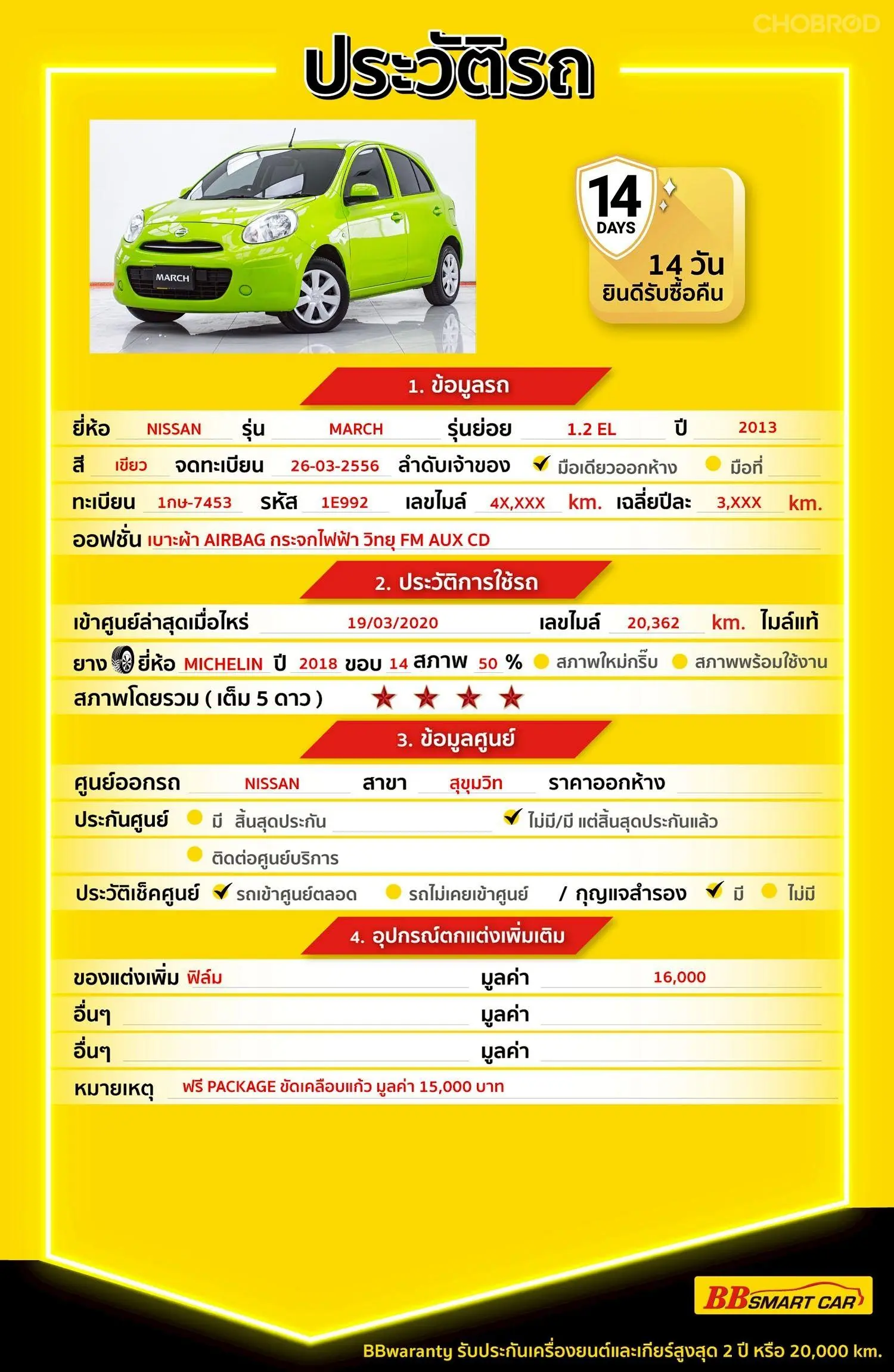 มีการรับประกันจากดีลเลอร์ (6 เดือน) มีบริการช่วยเหลือฉุกเฉินบนท้องถนน 24 ชม. จากดีลเลอร์