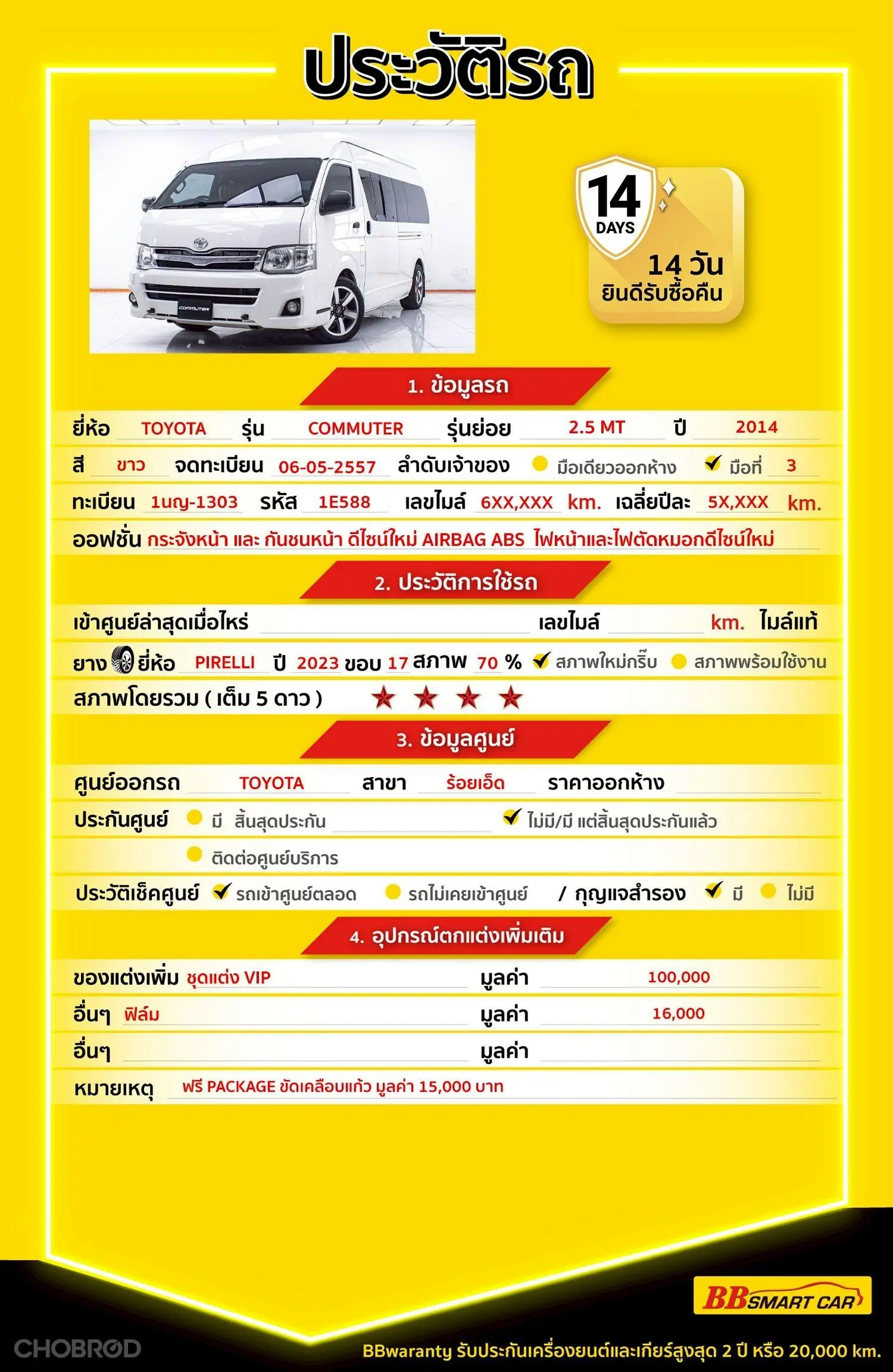 TOYOTA COMMUTER 2.5 MT 2014 ออกรถ 0 บาท จัดได้ 469,000 บ. Line : ***********แสดงข้อมูล 🔥จอง 199 บาท ส่งบัตรประชาชน รู้ผลพิจารณาภายใน 30 นาที ไม่ผ่านคืนเงินจองทุกกรณี 🔥ซื้อรถกับ BB พร้อมให้คำปรึกษา แก้ทุกปัญหา ให้ทุกเรื่อง บริการ call center 24 ชม. 🔥BB Care Plus รับประกันหลังการขาย สูงสุด 2 ปี หรือ 20,000 km.. 🔥มีรถให้เลือกมากกว่า 1,800 คัน สาขา 1 สี่แยกมไหสวรรย์ ใกล้เดอะมอลล์ท่าพระ รหัสรถ 1E588 ราคา 449,000 บาท ผ่อนเพียง 8,585 บาท Brand. : TOYOTA Year. : 2014 Model. : COMMUTER Grade. : 2.5 Engine. : 2500 CC Type. : ดีเซล Gearbox : MT Color. : ขาว Mileage. : 654,XXX KM. (ซื้อสด ราคานี้ยังไม่รวมค่าดำเนินการ 10,000 บ.) 🚩 Price. 449,000 บาท ยอดจัด : 459,000 บาท เงินดาวน์ : 0 บาท ประกันภัย : ฟรีประกันภัย 1 ปี ค่าดำเนินการ : 10,000 บาท รวมออกรถ : 0 บาท ผ่อน 36 งวด = 15,562 บาท ผ่อน 48 งวด = 12,151 บาท ผ่อน 60 งวด = 10,186 บาท ผ่อน 72 งวด = 9,191 บาท ผ่อน 84 งวด = 8,585 บาท เงื่อนไขเป็นไปตามที่ไฟแนนซ์กำหนด โปรโมชั่นพิเศษ สำหรับลูกค้าเครดิตดีลือกรับเรทดอกเบี้ยพิเศษ 📍36 งวด = 2.59 % 📍48 งวด = 2.89 % 📍60 งวด = 3.29 % 📍72 งวด = 4.49 % 🔥 เงื่อนไข โปรโมชั่น ดอกเบี้ยเริ่มต้น 2.59% ตลอดอายุสัญญา - ยอดจัดไฟแนนซ์ 300,000-600,000 บาท - ผ่อนสูงสุด 72 เดือน - เป็นลูกค้าประวัติดี - ค่าดำเนินการแคมเปญ 20,000 บาท (รวมในยอดจัดได้) 🎗Car Hightlight รถสวยๆ วันนี้ขอแนะนำ TOYOTA COMMUTER 2.5 MT 2014 จุดเด่นออฟชั่น 1 : กระจังหน้า และ กันชนหน้า ดีไซน์ใหม่ 2 : ไฟหน้า และ ไฟตัดหมอกดีไซน์ใหม่ 3 : เบาะโดยสารภายในสีเทาเข้มใหม่ พร้อมช่องทางเดินกว้างพิเศษ ของแต่งเพิ่มเติม ชุดแต่ง VIP มูลค่ากว่า100 K 🎗ภายใน AIRBAG ABS 🎗ภายนอก กระจังหน้าโครเมียม กันชนหน้า สีเดียวกับตัวรถ กันชนหลัง สีเดียวกับตัวรถ กระจกมองข้าง สีเดียวกับตัวรถ พร้อมไฟเลี้ยวในตัว ไฟหน้ามัลติรีเฟลกเตอร์ฮาโลเจน ไฟตัดหมอกคู่หน้า กระจกมองล้อด้านหลัง กระจกส่องด้านท้าย ล้อแมกซ์ขนาด 17 นิ้ว 🎗ความคุ้มค่า สำหรับคันนี้หากเปรียบเทียบราคากับคุณภาพ คันนี้ถือว่าคุ้มค่ามากค่ะ ผ่อนสบายๆก็มีรถขับได้ รถดีมีคุณภาพแบบนี้รีบตัดสินใจซื้อได้เลยราคานี้มาไวไปไวนะคะ ⭐️การรับประกันหลังการขาย BB Care Plus สูงสุด 2 ปี หรือ 20,000 km. ด้วยช่างที่ผ่านการอบรมจากศูนย์ชั้นนำของประเทศ 🎉Special offer เฉพาะ บีบีสมาร์ทคาร์ ที่นี่ที่เดียว ⭐ดอกเบี้ยเริ่มต้น 2.59% มีไฟแนนซ์รองรับหลายที่ค่ะ ⭐ฟรี!! แพคเก็จ ขัดเคลือบแก้ว มูลค่า 15,000 บาท ทุกคัน ⭐อนุมัติไว 30 นาที นำเอกสารมาให้ครบรับรถกลับบ้านทันทีค่ะ ⭐BB Care Plus รับประกันหลังการขาย สูงสุด 2 ปี หรือ 20,000 km. ⭐มี 6 สาขา ในกรุงเทพและปริมณฑลใกล้บ้านท่าน ⭐รถทุกคันผ่านตรวจสอบ Inspection เรียบร้อยแล้วค่ะ ผ่าน 5 ดาวทุกคันค่ะ ⭐เซลล์ทุกท่านเป็นมืออาชีพพร้อมให้บริการทุกท่านแน่นอนค่ะ เลือกข้อเสนอที่ให้คุณมากกว่าที่อื่น เพราะเราเล็งเห็นแล้ว ที่บีบีสมาร์ทคาร์ ให้ค