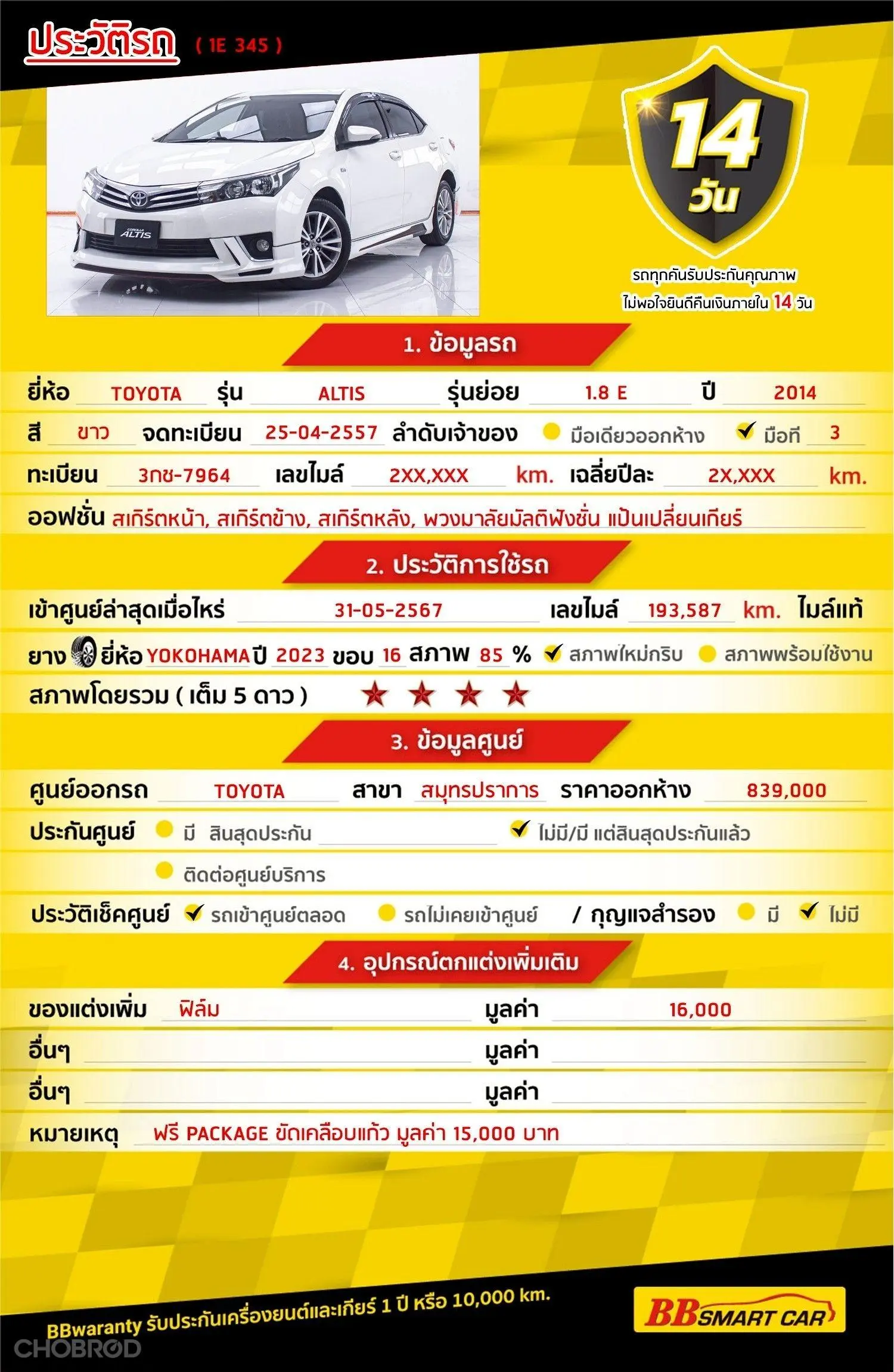TOYOTA ALTIS 1.8 E AT 2014 ออกรถ 0 บาท จัดได้ 269,000 Line:@**********แสดงข้อมูล 🔥จอง 199 บาท ส่งบัตรประชาชน รู้ผลพิจารณาภายใน 30 นาที ไม่ผ่านคืนเงินจองทุกกรณี 🔥ซื้อรถกับ BB พร้อมให้คำปรึกษา แก้ทุกปัญหา ให้ทุกเรื่อง บริการ call center 24 ชม. 🔥BB Care Plus รับประกันหลังการขาย สูงสุด 2 ปี หรือ 20,000 km.. 🔥มีรถให้เลือกมากกว่า 1,800 คัน สาขา 1 สี่แยกมไหสวรรย์ ใกล้เดอะมอลล์ท่าพระ รหัสรถ 1E345 ราคา 249,000 บาท ผ่อนเพียง 4,916 บาท Brand. : TOYOTA Year. : 2014 Model. : ALTIS Grade. : 1.8 E Engine. : 1800 CC Type. : เบนซิน Gearbox : AT Color. : ขาว Mileage. : 231,XXX KM. (ซื้อสด ราคานี้ยังไม่รวมค่าดำเนินการ 10,000 บ.) 🚩 Price. 249,000 บาท ยอดจัด : 259,000 บาท เงินดาวน์ : 0 บาท ประกันภัย : ฟรีประกันภัย 1 ปี ค่าดำเนินการ : 10,000 บาท รวมออกรถ : 0 บาท ผ่อน 36 งวด = 8,622 บาท ผ่อน 48 งวด = 6,697 บาท ผ่อน 60 งวด = 6,003 บาท ผ่อน 72 งวด = 5,234 บาท ผ่อน 84 งวด = 4,916 บาท เงื่อนไขเป็นไปตามที่ไฟแนนซ์กำหนด โปรโมชั่นพิเศษ สำหรับลูกค้าเครดิตดีลือกรับเรทดอกเบี้ยพิเศษ 📍36 งวด = 1.29 % 📍48 งวด = 1.99 % 📍60 งวด = 2.39 % 📍72 งวด = 3.59 % 🔥 เงื่อนไข โปรโมชั่น ดอกเบี้ยเริ่มต้น 1.29% ตลอดอายุสัญญา - ยอดจัดไฟแนนซ์ 300,000-600,000 บาท - ผ่อนสูงสุด 72 เดือน - เป็นลูกค้าประวัติดี พนักงานประจำเงินเดือน 20,000 ขึ้นไป - ค่าดำเนินการแคมเปญ 20,000 บาท (รวมในยอดจัดได้) 🎗Car Hightlight รถสวยๆ วันนี้ขอแนะนำ จุดเด่นออฟชั่น 1 : ภายในสีดำสไตล์สปอร์ต เบาะหนังคู่หน้าแบบ Bucket Seat วัสดุตกแต่งแผงคอนโซลหน้าแบบ Cyber Carbon ลายสปอร์ต พร้อมบุด้วยวัสดุแบบนุ่ม มาตรวัดเรืองแสง 3 วง สปอร์ตเต็มขั้น พวงมาลัยหุ้มหนังปรับระดับได้ 4 ทิศทาง พร้อมปุ่มควบคุมเครื่องเสียง แป้นเปลี่ยนเกียร์ Paddle Shift 2 : พวงมาลัยมัลติฟังชั่น 🎗ภายใน - SRS ถุงลมนิรภัยคู่หน้า - ระบบ VSC,ABS,BA,EBD 🎗ภายนอก สเกิร์ตหน้า, สเกิร์ตข้าง, สเกิร์ตหลัง ปลายท่อไอเสียแบบสปอร์ตและสปอยเลอร์หลัง แบบสปอร์ต ไฟหน้าแบบ LED โปรเจคเตอร์ พร้อมไฟ LED Day Time Running Lights และไฟท้าย LED แบบ Surface illumination ล้ออัลลอย 17 นิ้ว ดีไซน์เข้ม 🎗ความคุ้มค่า สำหรับคันนี้หากเปรียบเทียบราคากับคุณภาพ คันนี้ถือว่าคุ้มค่ามากค่ะ ผ่อนสบายๆก็มีรถขับได้ รถดีมีคุณภาพแบบนี้รีบตัดสินใจซื้อได้เลราคานี้มาไวไปไวนะคะ ⭐️การรับประกันหลังการขาย BB Care Plus สูงสุด 2 ปี หรือ 20,000 km. ด้วยช่างที่ผ่านการอบรมจากศูนย์ชั้นนำของประเทศ 🎉Special offer เฉพาะ บีบีสมาร์ทคาร์ ที่นี่ที่เดียว ⭐ดอกเบี้ยเริ่มต้น 1.29% มีไฟแนนซ์รองรับหลายที่ค่ะ ⭐ฟรี!! แพคเก็จ ขัดเคลือบแก้ว มูลค่า 15,000 บาท ทุกคัน ⭐อนุมัติไว 30 นาที นำเอกสารมาให้ครบรับรถกลับบ้านทันทีค่ะ ⭐BB Care Plus รับประกันหลังการขาย สูงสุด 2 ปี หรือ 20,000 km. ⭐มี 6 สาขา ในกรุงเทพและปริมณฑลใกล้บ้านท่าน ⭐รถทุกคันผ่านตรวจสอบ Inspection เรียบร้อยแล้วค่ะ ผ่าน 5 ดาวทุกคันค่ะ ⭐เซลล์ทุกท่านเป็นมืออาชีพพร้อมให้บริการทุกท่าน