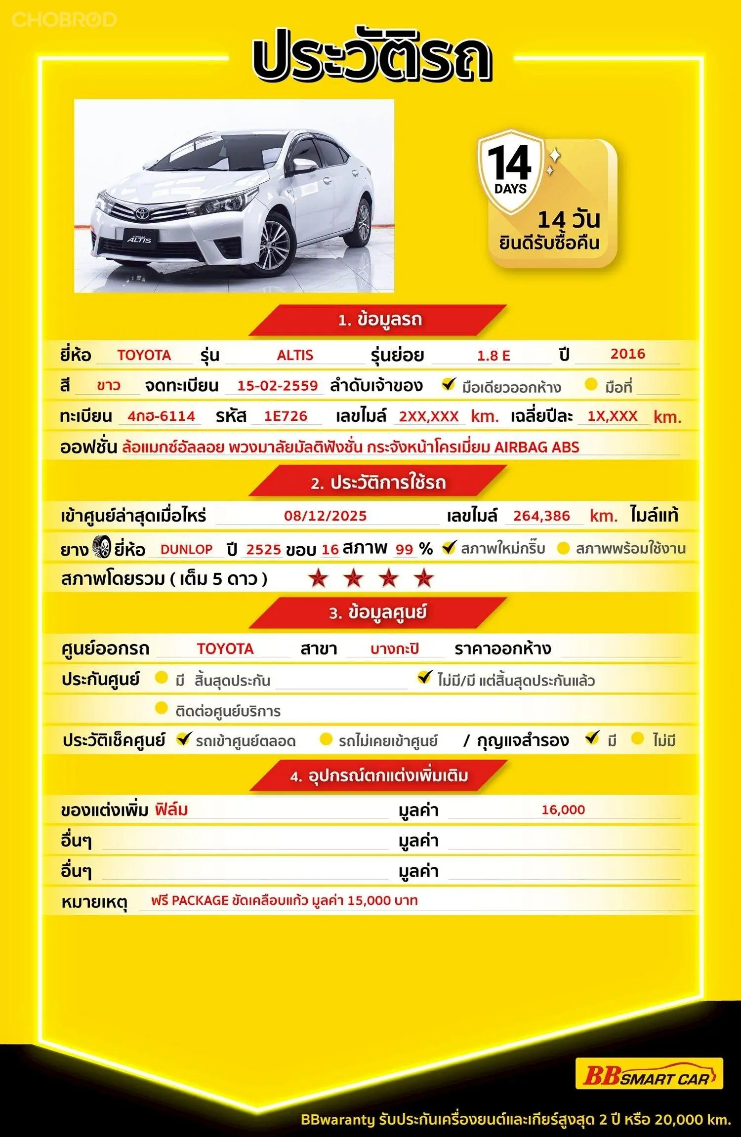 TOYOTA ALTIS 1.8 E AT 2016 ออกรถ 0 บาท จัดได้ 314,000 . Line : @**********แสดงข้อมูล 🔥จอง 199 บาท ส่งบัตรประชาชน รู้ผลพิจารณาภายใน 30 นาที ไม่ผ่านคืนเงินจองทุกกรณี 🔥ซื้อรถกับ BB พร้อมให้คำปรึกษา แก้ทุกปัญหา ให้ทุกเรื่อง บริการ call center 24 ชม. 🔥BB Care Plus รับประกันหลังการขาย สูงสุด 2 ปี หรือ 20,000 km.. 🔥มีรถให้เลือกมากกว่า 1,800 คัน สาขา 1 สี่แยกมไหสวรรย์ ใกล้เดอะมอลล์ท่าพระ รหัสรถ 1E726 ราคา 294,000 บาท ผ่อนเพียง 5,769 บาท Brand. : TOYOTA Year. : 2016 Model. : ALTIS Grade. : 1.8 E Engine. : 1800 CC Type. : เบนซิน Gearbox : AT Color. : ขาว Mileage. : 264,XXX KM. (ซื้อสด ราคานี้ยังไม่รวมค่าดำเนินการ 10,000 บ.) 🚩 Price. 294,000 บาท ยอดจัด : 304,000 บาท เงินดาวน์ : 0 บาท ประกันภัย : ฟรีประกันภัย 1 ปี ค่าดำเนินการ : 10,000 บาท รวมออกรถ : 0 บาท ผ่อน 36 งวด = 10,120 บาท ผ่อน 48 งวด = 7,861 บาท ผ่อน 60 งวด = 6,912 บาท ผ่อน 72 งวด = 6,144 บาท ผ่อน 84 งวด = 5,769 บาท เงื่อนไขเป็นไปตามที่ไฟแนนซ์กำหนด โปรโมชั่นพิเศษ สำหรับลูกค้าเครดิตดีลือกรับเรทดอกเบี้ยพิเศษ 📍36 งวด = 1.29 % 📍48 งวด = 1.99 % 📍60 งวด = 2.39 % 📍72 งวด = 3.59 % 🔥 เงื่อนไข โปรโมชั่น ดอกเบี้ยเริ่มต้น 1.29% ตลอดอายุสัญญา - ยอดจัดไฟแนนซ์ 300,000-600,000 บาท - ผ่อนสูงสุด 72 เดือน - เป็นลูกค้าประวัติดี พนักงานประจำเงินเดือน 20,000 ขึ้นไป - ค่าดำเนินการแคมเปญ 20,000 บาท (รวมในยอดจัดได้) 🎗Car Hightlight รถสวยๆ วันนี้ขอแนะนำ TOYOTA ALTIS 1.8 E AT 2016 จุดเด่นออฟชั่น 1 : ล้อแมกซ์อัลลอย 2 : พวงมาลัยมัลติฟังชั่น 3 : กระจังหน้าโครเมี่ยม 🎗ภายใน AIRBAG ABS 🎗ภายนอก ไฟหน้าแบบ LED เปิด-ปิดอัตโนมัติ ไฟท้ายแบบ LED กระจกมองข้างปรับไฟฟ้า พร้อมไฟเลี้ยว มือเปิดประตูภายนอก สีเดียวกับตัวรถ 🎗ความคุ้มค่า สำหรับคันนี้หากเปรียบเทียบราคากับคุณภาพ คันนี้ถือว่าคุ้มค่ามากค่ะ ผ่อนสบายๆก็มีรถขับได้ รถดีมีคุณภาพแบบนี้รีบตัดสินใจซื้อได้เลยราคานี้มาไวไปไวนะคะ ⭐️การรับประกันหลังการขาย BB Care Plus สูงสุด 2 ปี หรือ 20,000 km. ด้วยช่างที่ผ่านการอบรมจากศูนย์ชั้นนำของประเทศ 🎉Special offer เฉพาะ บีบีสมาร์ทคาร์ ที่นี่ที่เดียว ⭐ดอกเบี้ยเริ่มต้น 1.29% มีไฟแนนซ์รองรับหลายที่ค่ะ ⭐ฟรี!! แพคเก็จ ขัดเคลือบแก้ว มูลค่า 15,000 บาท ทุกคัน ⭐อนุมัติไว 30 นาที นำเอกสารมาให้ครบรับรถกลับบ้านทันทีค่ะ ⭐BB Care Plus รับประกันหลังการขาย สูงสุด 2 ปี หรือ 20,000 km. ⭐มี 6 สาขา ในกรุงเทพและปริมณฑลใกล้บ้านท่าน ⭐รถทุกคันผ่านตรวจสอบ Inspection เรียบร้อยแล้วค่ะ ผ่าน 5 ดาวทุกคันค่ะ ⭐เซลล์ทุกท่านเป็นมืออาชีพพร้อมให้บริการทุกท่านแน่นอนค่ะ เลือกข้อเสนอที่ให้คุณมากกว่าที่อื่น เพราะเราเล็งเห็นแล้ว ที่บีบีสมาร์ทคาร์ ให้คุณได้มากกว่าที่อื่นแน่นอนครับ มาที่เดียวจบทุกปัญหา หลากหลายรุ่นให้เลือกกับบริการที่คุณต้องประทับใจแน่นอนครับ