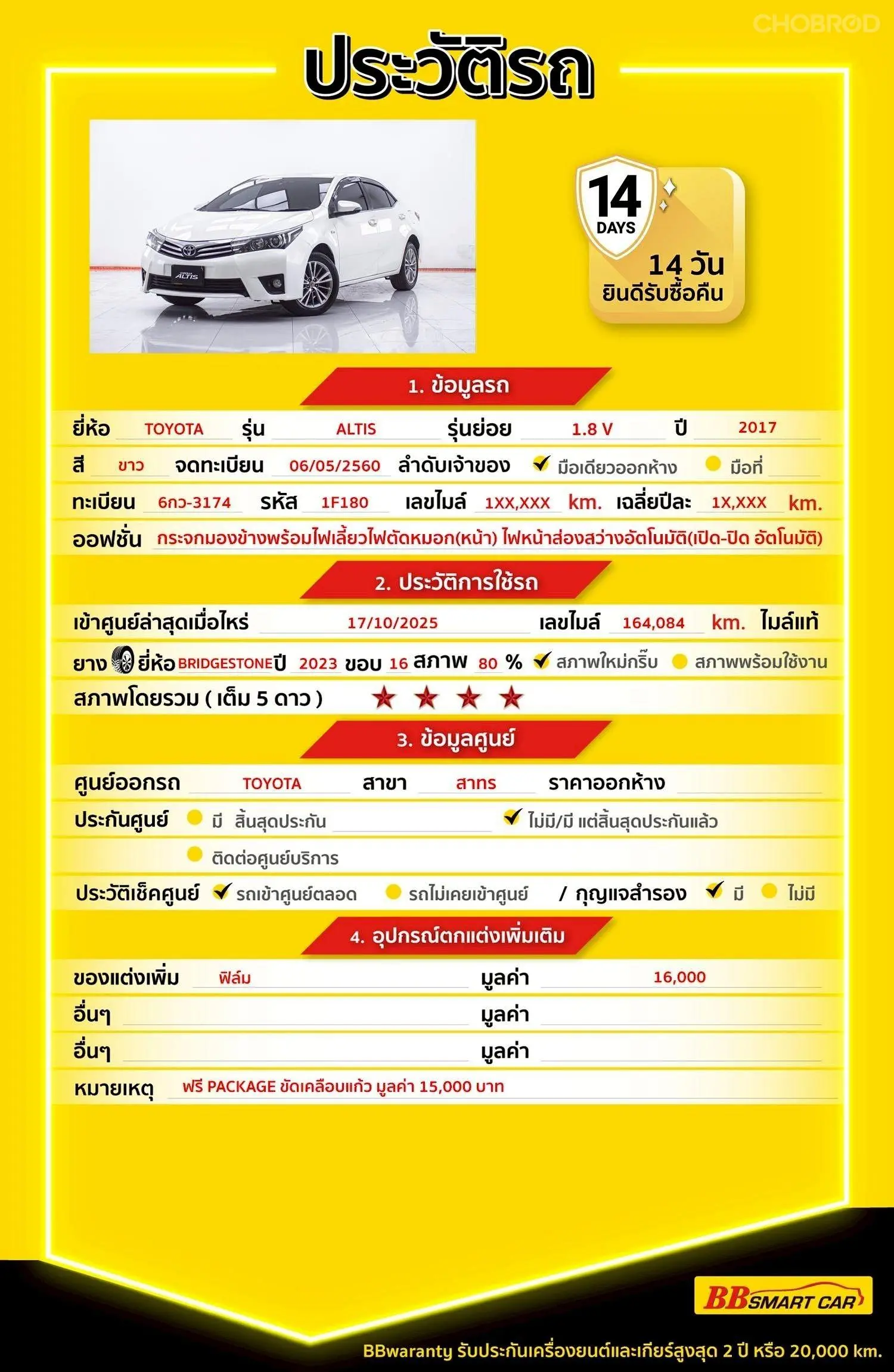 มีการรับประกันจากดีลเลอร์ (6 เดือน) มีบริการช่วยเหลือฉุกเฉินบนท้องถนน 24 ชม. จากดีลเลอร์