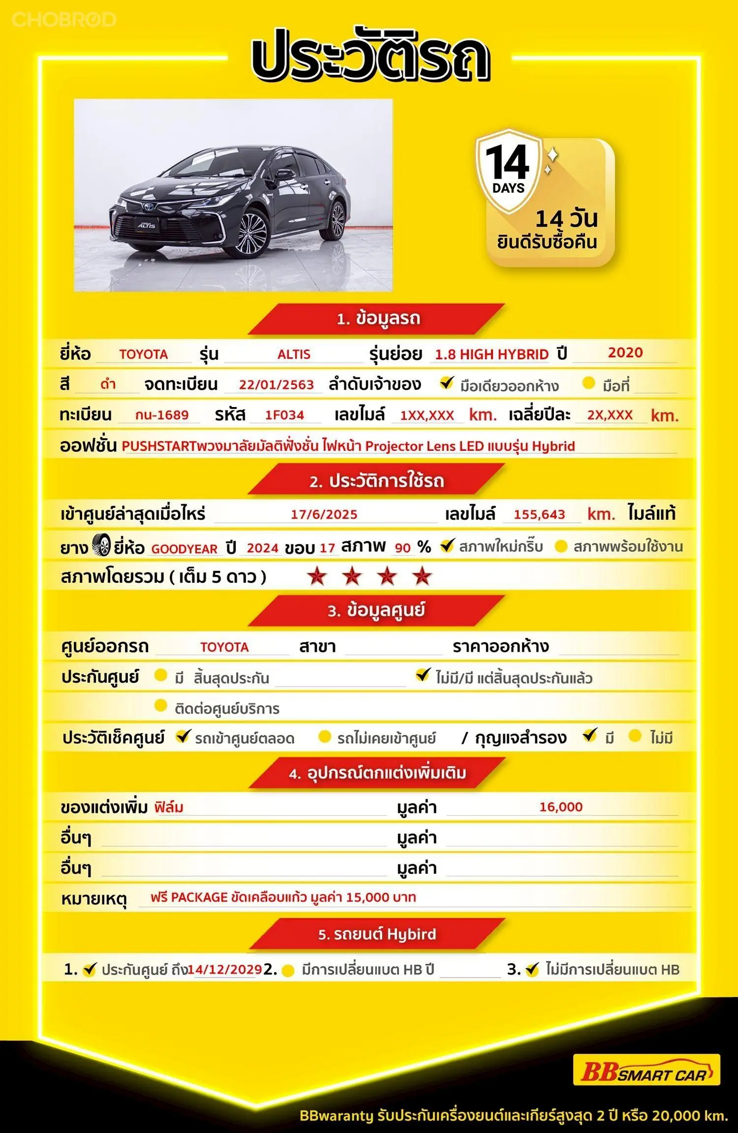 มีการรับประกันจากดีลเลอร์ (6 เดือน) มีบริการช่วยเหลือฉุกเฉินบนท้องถนน 24 ชม. จากดีลเลอร์