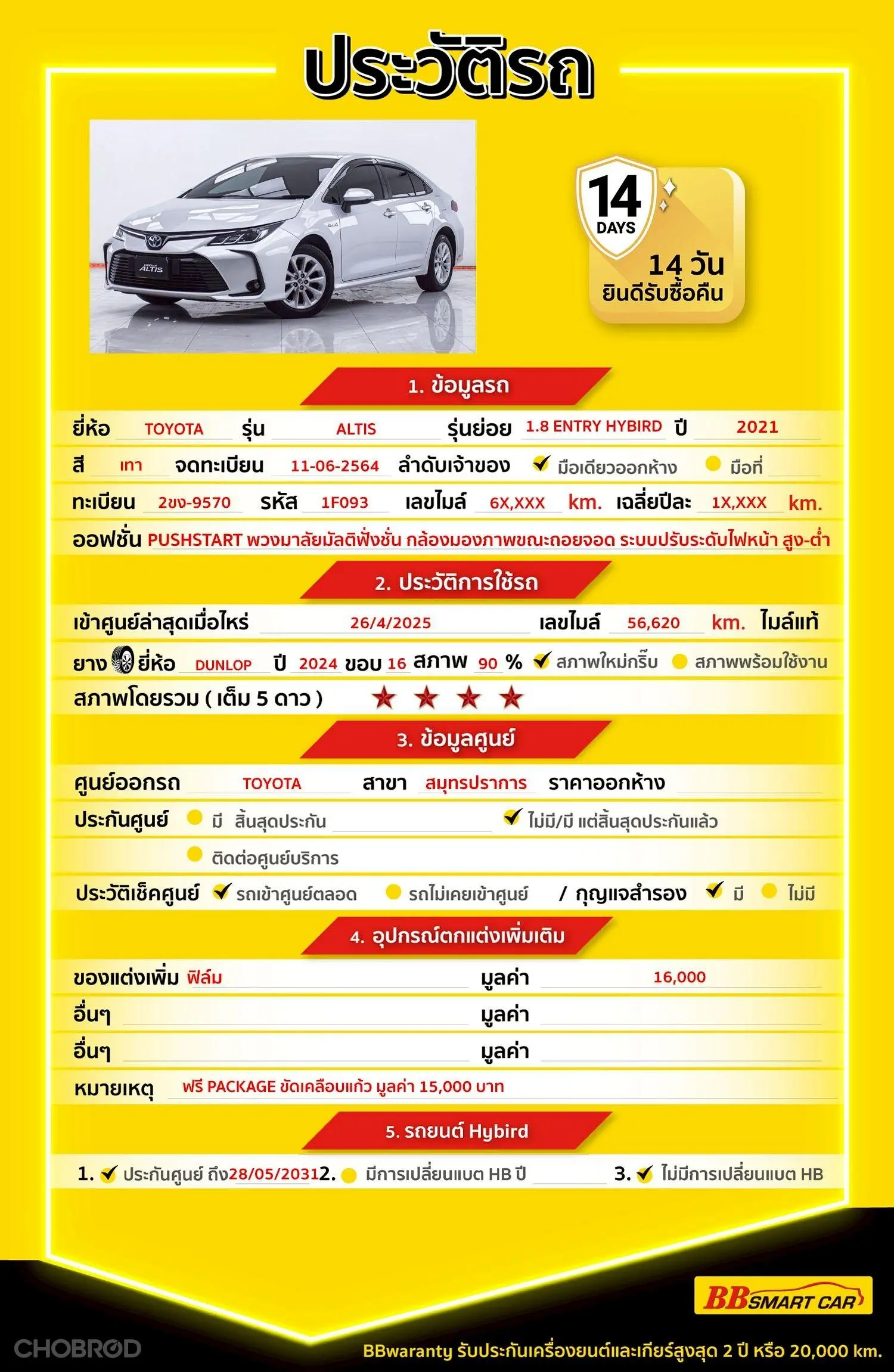 มีการรับประกันจากดีลเลอร์ (6 เดือน) มีบริการช่วยเหลือฉุกเฉินบนท้องถนน 24 ชม. จากดีลเลอร์