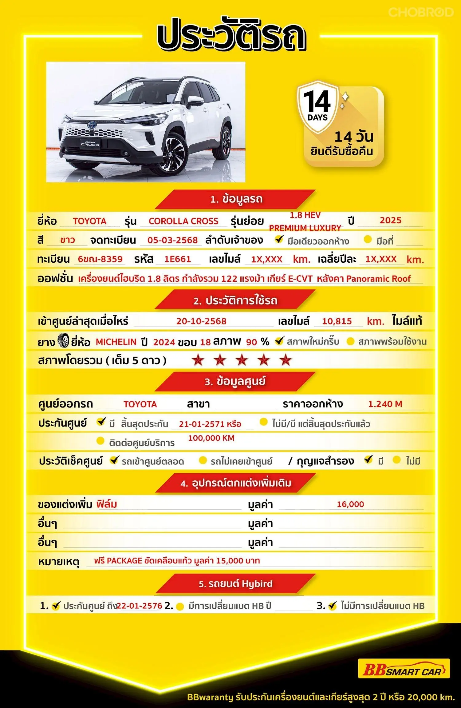 TOYOTA COROLLA CROSS 1.8 HEV PREMIUM LUXURY AT 2025 ออกรถ 0 บาท จัดได้ 979,000 บ. Line : @**********แสดงข้อมูล 🔥จอง 199 บาท ส่งบัตรประชาชน รู้ผลพิจารณาภายใน 30 นาที ไม่ผ่านคืนเงินจองทุกกรณี 🔥ซื้อรถกับ BB พร้อมให้คำปรึกษา แก้ทุกปัญหา ให้ทุกเรื่อง บริการ call center 24 ชม. 🔥BB Care Plus รับประกันหลังการขาย สูงสุด 2 ปี หรือ 20,000 km.. 🔥มีรถให้เลือกมากกว่า 1,800 คัน สาขา 1 สี่แยกมไหสวรรย์ ใกล้เดอะมอลล์ท่าพระ รหัสรถ 1E661 ราคา 959,000 บาท ผ่อนเพียง 16,222 บาท Brand. : TOYOTA Year. : 2025 Model. : COROLLA CROSS Grade. : 1.8 HEV PREMIUM LUXURY Engine. : 1800 CC Type. : เบนซิน+ไฟฟ้า Gearbox : AT Color. : ขาว Mileage. : 12,XXX KM. (ซื้อสด ราคานี้ยังไม่รวมค่าดำเนินการ 10,000 บ.) 🚩 Price. 959,000 บาท ยอดจัด : 969,000 บาท เงินดาวน์ : 0 บาท ประกันภัย : ฟรีประกันภัย 1 ปี ค่าดำเนินการ : 10,000 บาท รวมออกรถ : 0 บาท ผ่อน 36 งวด = 29,915 บาท ผ่อน 48 งวด = 22,715 บาท ผ่อน 60 งวด = 19,950 บาท ผ่อน 72 งวด = 17,848 บาท ผ่อน 84 งวด = 16,222 บาท เงื่อนไขเป็นไปตามที่ไฟแนนซ์กำหนด โปรโมชั่นพิเศษ สำหรับลูกค้าเครดิตดีลือกรับเรทดอกเบี้ยพิเศษ 📍36 งวด = 1.29 % 📍48 งวด = 1.99 % 📍60 งวด = 2.39 % 📍72 งวด = 3.59 % 🔥 เงื่อนไข โปรโมชั่น ดอกเบี้ยเริ่มต้น 1.29% ตลอดอายุสัญญา - ยอดจัดไฟแนนซ์ 300,000-600,000 บาท - ผ่อนสูงสุด 72 เดือน - เป็นลูกค้าประวัติดี พนักงานประจำเงินเดือน 20,000 ขึ้นไป - ค่าดำเนินการแคมเปญ 20,000 บาท (รวมในยอดจัดได้) 🎗Car Hightlight รถสวยๆ วันนี้ขอแนะนำ TOYOTA COROLLA CROSS 1.8 HEV PREMIUM LUXURY AT 2025 จุดเด่นออฟชั่น 1 : เครื่องยนต์ไฮบริด 1.8 ลิตร กำลังรวม 122 แรงม้า เกียร์ E-CVT, ภายในจอ 12.3 นิ้ว, กล้อง 360° (PVM), เบรกมือไฟฟ้า, และแพ็กเกจความปลอดภัย Toyota Safety Sense ครบครัน เน้นความหรูหราและเทคโนโลยีล้ำสมัย 2 : กล้อง: Panoramic View Monitor (PVM) 360° และกล้องหน้า-หลังบันทึกภาพ. * หน้าจอ: จอขับขี่ Full Digital 12.3 นิ้ว และจอสัมผัส 10.1 นิ้ว (Wireless Apple CarPlay/Android Auto). 3 : * ระบบชาร์จ: แท่นชาร์จไร้สาย (Wireless Charger). * เบาะ: วัสดุหนัง, เบาะคนขับปรับไฟฟ้า 8 ทิศทาง, มีไฟ Ambient Light. * พอร์ทชาร์จ: USB Type-C เพิ่มเติม 🎗ภายใน • ระบบช่วยเตือนขณะจอดรถพร้อมเบรกอัตโนมัติ (PKSB). * สัญญาณเตือนกะระยะ (Parking Sensor): 8 ตำแหน่ง. * ระบบเตือนมุมอับสายตา (BSM) & เตือนขณะถอยหลัง (RCTA). * เบรกมือไฟฟ้า (EPB) และระบบหน่วงเบรกอัตโนมัติ (ABH). * ระบบอื่นๆ: ระบบควบคุมความเร็วอัตโนมัติ (DRCC), ระบบเตือนเมื่อออกนอกเลน (LDW). 🎗ภายนอก ภายนอกไฟหน้า-ท้าย LED ดีไซน์ใหม่, ล้อ 18 นิ้วทูโทน, หลังคา Panoramic Roof หลังคา : Panoramic Roof พร้อมม่านบังแดดไฟฟ้า ไฟหน้า/ท้าย: LED Crystalized Headlamp ดีไซน์ใหม่ พร้อมไฟเลี้ยว Sequential ล้อ: อัลลอยปัดเงาสีทูโทน ขนาด 18 นิ้ว. 🎗ความคุ้มค่า สำหรับคันนี้หากเปรียบเทียบราคากับคุณภาพ คันนี้ถือว่าคุ้มค่ามากค่ะ ผ่อนสบายๆก็มีรถขับได้ รถดีมีคุณภาพแบบนี้รีบตัดสินใจซื้อได้เลยราคานี้มาไวไปไวนะคะ ⭐️การรับประกันหลังการขาย BB Care Plus สูงสุด 2 ปี หรือ 20,000 km. ด้วยช่างที่ผ่านการอบรมจากศูนย์ชั้นนำของประเทศ 🎉Special offer เฉพาะ บ