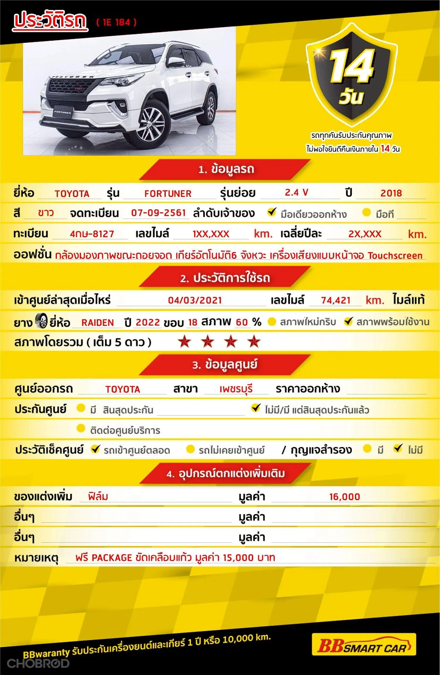 มีการรับประกันจากดีลเลอร์ (6 เดือน) มีบริการช่วยเหลือฉุกเฉินบนท้องถนน 24 ชม. จากดีลเลอร์