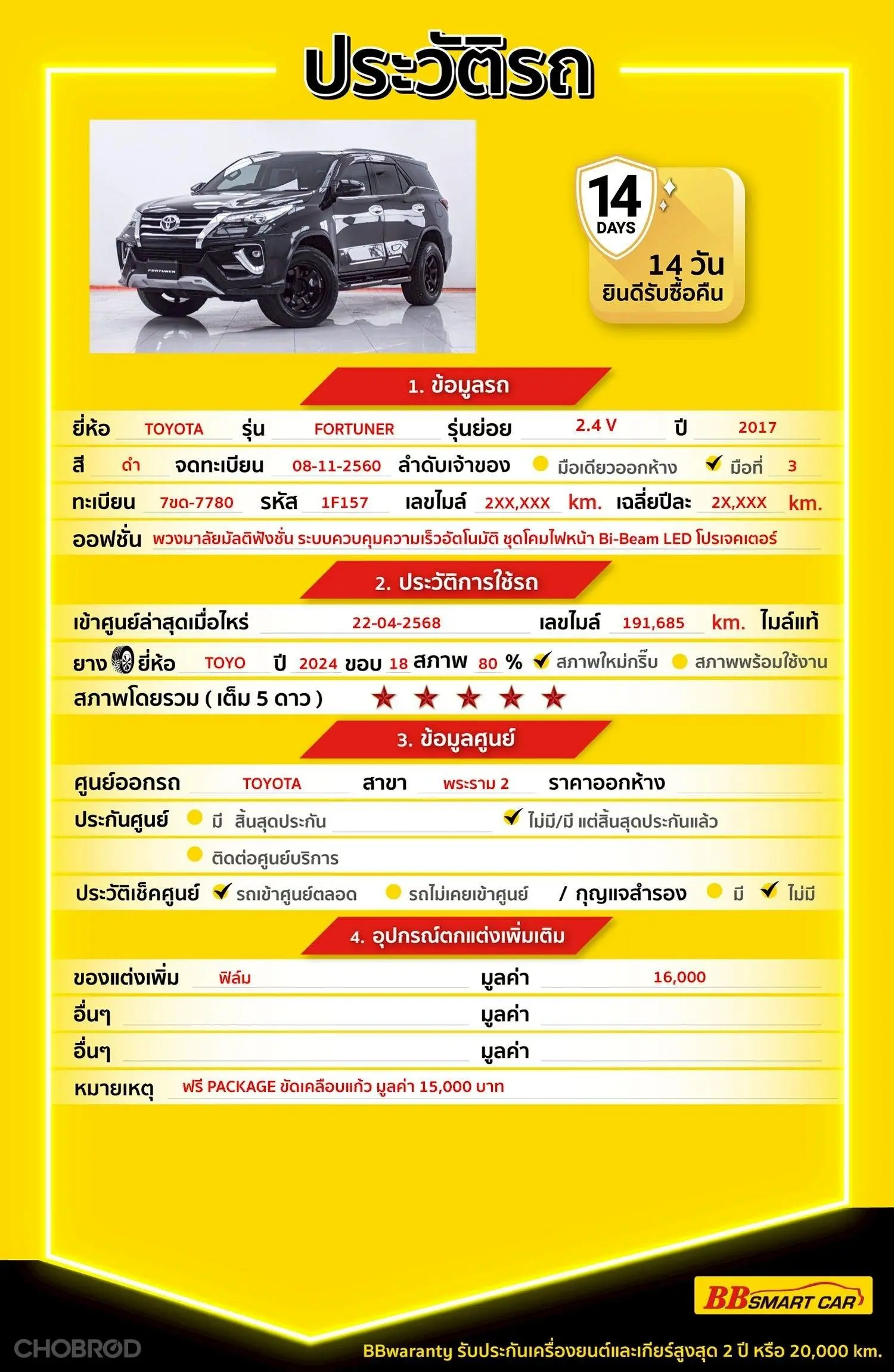 TOYOTA FORTUNER 2.4 V 2WD AT 2017 ออกรถ 0 บาท จัดได้ 749,000 บ. Line:@******แสดงข้อมูล 🔥มีรถให้เลือกมากกว่า 1,800 คัน 🔥รถทุกคันผ่านตรวจสอบ Inspection เรียบร้อยแล้วค่ะ ผ่าน 5 ดาวทุกคันค่ะ 🔥ซื้อรถกับ BB พร้อมให้คำปรึกษา แก้ทุกปัญหา ให้ทุกเรื่อง บริการ call center 24 ชม. 🔥BB Care Plus รับประกันหลังการขาย สูงสุด 2 ปี หรือ 20,000 km. 🔥ฟรี!! แพคเก็จ ขัดเคลือบแก้ว มูลค่า 15,000 บาท ทุกคัน 🔥มี 6 สาขา ในกรุงเทพและปริมณฑลใกล้บ้านท่าน สาขา 1 สี่แยกมไหสวรรย์ ใกล้เดอะมอลล์ท่าพระ รหัสรถ 1F157 ราคา 729,000 บาท ผ่อนเพียง 13,295 บาท Brand. : TOYOTA Year. : 2017 Model. : FORTUNER Grade. : 2.4 V 2WD Engine. : 2400 CC Type. : ดีเซล Gearbox : AT Color. : ดำ Mileage. : 210,XXX KM. (ซื้อสด ราคานี้ยังไม่รวมค่าดำเนินการ 10,000 บ.) 🚩 Price. 729,000 บาท ยอดจัด : 739,000 บาท เงินดาวน์ : 0 บาท ประกันภัย : ค่าดำเนินการ : 10,000 บาท รวมออกรถ : 0 บาท ผ่อน 36 งวด = 24,528 บาท ผ่อน 48 งวด = 19,036 บาท ผ่อน 60 งวด = 15,873 บาท ผ่อน 72 งวด = 14,271 บาท ผ่อน 84 งวด = 13,295 บาท เงื่อนไขเป็นไปตามที่ไฟแนนซ์กำหนด โปรโมชั่นพิเศษ สำหรับลูกค้าเครดิตดีลือกรับเรทดอกเบี้ยพิเศษ 📍36 งวด = 1.29 % 📍48 งวด = 1.99 % 📍60 งวด = 2.39 % 📍72 งวด = 3.59 % 🔥 เงื่อนไข โปรโมชั่น ดอกเบี้ยเริ่มต้น 1.29% ตลอดอายุสัญญา - ยอดจัดไฟแนนซ์ 300,000-600,000 บาท - ผ่อนสูงสุด 72 เดือน - เป็นลูกค้าประวัติดี พนักงานประจำเงินเดือน 20,000 ขึ้นไป - ค่าดำเนินการแคมเปญ 20,000 บาท (รวมในยอดจัดได้) 🎗Car Hightlight รถสวยๆ วันนี้ขอแนะนำ TOYOTA FORTUNER 2.4 V 2WD AT 2017 จุดเด่นออฟชั่น 1 : ระบบ Push Start 2 : พวงมาลัยมัลติฟังชั่น 3 : ระบบควบคุมความเร็วอัตโนมัติ 🎗ภายใน AIRBAG ABS 🎗ภายนอก * ชุดโคมไฟหน้า Bi-Beam LED โปรเจคเตอร์ * เสารับสัญญาณวิทยุดีไซน์ล้ำแบบ Shark Fin * กระจกมองข้างพร้อมไฟเลี้ยว และระบบ Welcome Light * ราวหลังคาให้ครบทุกรุ่นย่อย * ไฟท้าย LED แบบ Light Guiding * ล้อ TOYO ปี 24 ขอบ 18 * ระบบปัดน้ำฝนด้านหน้า – ด้านหลัง