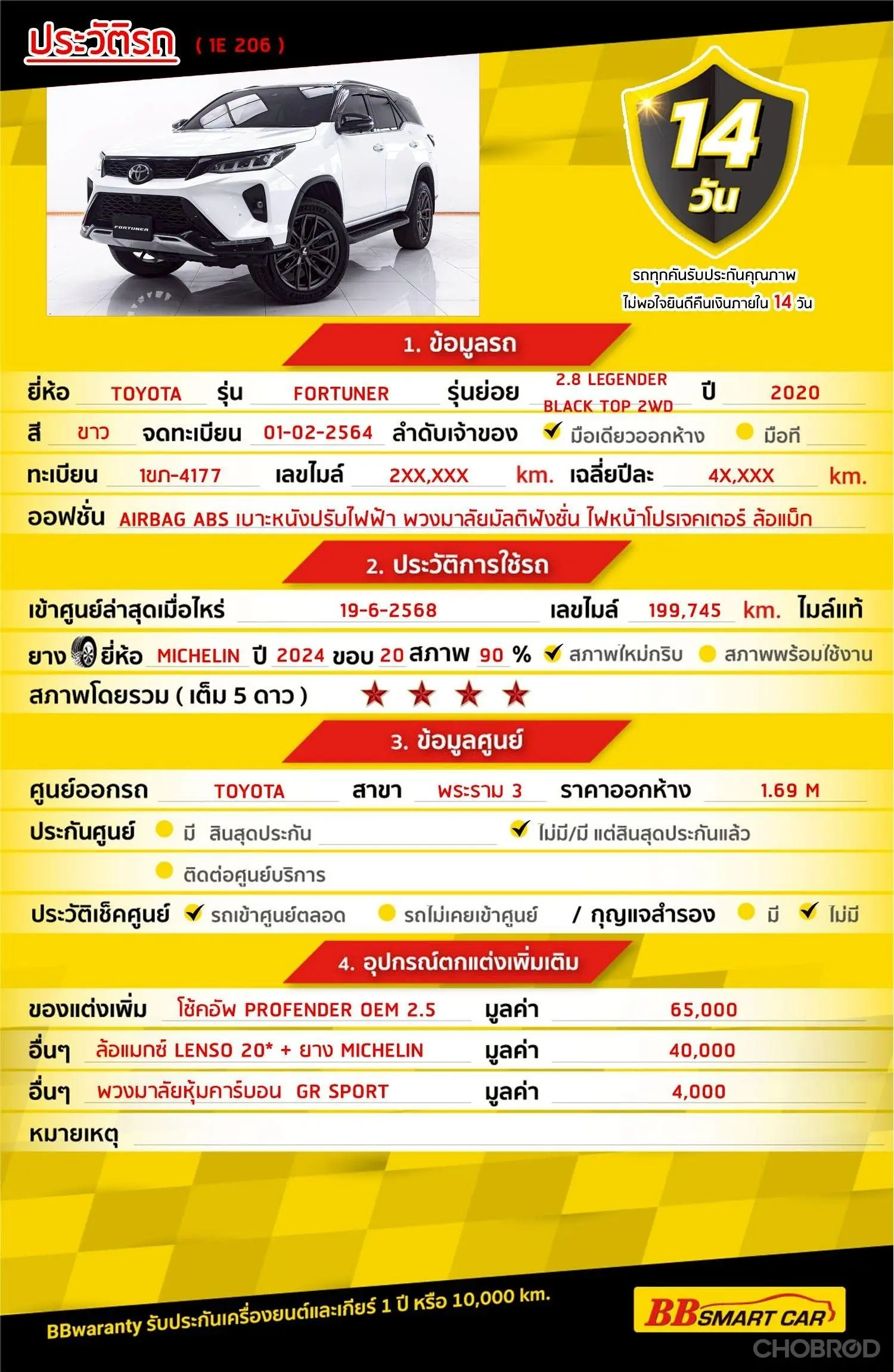 TOYOTA FORTUNER 2.8 LEGENDER BLACK TOP 2WD AT 2021 ออกรถ 0 บาท จัดได้ 969,000 Line:@**********แสดงข้อมูล 🔥จอง 199 บาท ส่งบัตรประชาชน รู้ผลพิจารณาภายใน 30 นาที ไม่ผ่านคืนเงินจองทุกกรณี 🔥ซื้อรถกับ BB พร้อมให้คำปรึกษา แก้ทุกปัญหา ให้ทุกเรื่อง บริการ call center 24 ชม. 🔥BB Care Plus รับประกันหลังการขาย สูงสุด 2 ปี หรือ 20,000 km.. 🔥มีรถให้เลือกมากกว่า 1,600 คัน สาขา 1 สี่แยกมไหสวรรย์ ใกล้เดอะมอลล์ท่าพระ รหัสรถ 1E206 ราคา 949,000 บาท ผ่อนเพียง 16,055 บาท Brand. : TOYOTA Year. : 2021 Model. : FORTUNER Grade. : 2.8 LEGENDER BLACK TOP 2WD Engine. : 2800 CC Type. : ดีเซล Gearbox : AT Color. : ขาว-ดำ Mileage. : 205,XXX KM. (ซื้อสด ราคานี้ยังไม่รวมค่าดำเนินการ 10,000 บ.) 🚩 Price. 949,000 บาท ยอดจัด : 959,000 บาท เงินดาวน์ : 0 บาท ประกันภัย : ฟรีประกันภัย 1 ปี ค่าดำเนินการ : 10,000 บาท รวมออกรถ : 0 บาท ผ่อน 36 งวด = 29,607 บาท ผ่อน 48 งวด = 22,481 บาท ผ่อน 60 งวด = 19,745 บาท ผ่อน 72 งวด = 17,664 บาท ผ่อน 84 งวด = 16,055 บาท เงื่อนไขเป็นไปตามที่ไฟแนนซ์กำหนด โปรโมชั่นพิเศษ สำหรับลูกค้าเครดิตดีลือกรับเรทดอกเบี้ยพิเศษ 📍36 งวด = 1.29 % 📍48 งวด = 1.99 % 📍60 งวด = 2.39 % 📍72 งวด = 3.59 % 🔥 เงื่อนไข โปรโมชั่น ดอกเบี้ยเริ่มต้น 1.29% ตลอดอายุสัญญา - ยอดจัดไฟแนนซ์ 300,000-600,000 บาท - ผ่อนสูงสุด 72 เดือน - เป็นลูกค้าประวัติดี พนักงานประจำเงินเดือน 20,000 ขึ้นไป - ค่าดำเนินการแคมเปญ 20,000 บาท (รวมในยอดจัดได้) 🎗Car Hightlight รถสวยๆ วันนี้ขอแนะนำ TOYOTA FORTUNER 2.8 LEGENDER BLACK TOP 2WD AT 2021 จุดเด่นออฟชั่น 1 : ไฟหน้า DayTime Running Light แบบ Light Guiding ดีไซน์ใหม่ ที่มาพร้อมกับไฟเลี้ยว LED แบบ Sequential ไฟสูงและไฟต่ำแบบ LED 2 : AIRBAG 3 : เบาะหนังปรับไฟฟ้า ของแต่งเพิ่มเติม ล้อแมกซ์ LENSO 20* + ยาง MICHELIN พวงมาลัยหุ้มคาร์บอน GR SPORT โช้คอัพ PROFENDER OEM 2.5 มูลค่ารวมกว่า 109 K 🎗ภายใน พร้อมปรับดีไซน์กันชนหลังใหม่ให้สอดรับกับดีไซน์ด้านหน้าอย่างลงตัว นอกจากนี้ยังปรับเปลี่ยนลายล้ออัลลอย 20 นิ้วเป็นดีไซน์ใหม่ ที่มาพร้อมกับหลังคาทูโทน 🎗ภายนอก ล้อแมกซ์ 20" ไฟหน้า-ท้าย LED ที่ปัดหมอกด้านหลัง กระจกมองข้างสีเดียวกับตัวรถ กระจกมองข้าง ปรับและพับด้วยไฟฟ้า พร้อมไฟเลี้ยวในตัว มือเปิดประตูภายนอก สีเดียวกับตัวรถ ระบบปัดน้ำฝนด้านหน้า – ด้านหลัง กระจังหน้าโครเมียมรมดำ ชายกันชนหน้า – ชายกันชนหลัง สีดำ ชายด้านข้างตัวรถ สีดำ 🎗ความคุ้มค่า สำหรับคันนี้หากเปรียบเทียบราคากับคุณภาพ คันนี้ถือว่าคุ้มค่ามากค่ะ ผ่อนสบายๆก็มีรถขับได้ รถดีมีคุณภาพแบบนี้รีบตัดสินใจซื้อได้เลราคานี้มาไวไปไวนะคะ ⭐️การรับประกันหลังการขาย BB Care Plus สูงสุด 2 ปี หรือ 20,000 km. ด้วยช่างที่ผ่านการอบรมจากศูนย์ชั้นนำของประเทศ 🎉Special offer เฉพาะ บีบีสมาร์ทคาร์ ที่นี่ที่เดียว ⭐ดอกเบี้ยเริ่มต้น 1.29% มีไฟแนนซ์รองรับหลายที่ค่ะ ⭐ฟรี!! แพคเก็จ ขัดเคลือบแก้ว มูลค่า 15,000 บาท ทุกคัน ⭐อนุมัติไว 30 นาที นำเอกสารมาให้ครบรับรถกลับบ้านทันทีค่ะ ⭐BB Care Plus รั
