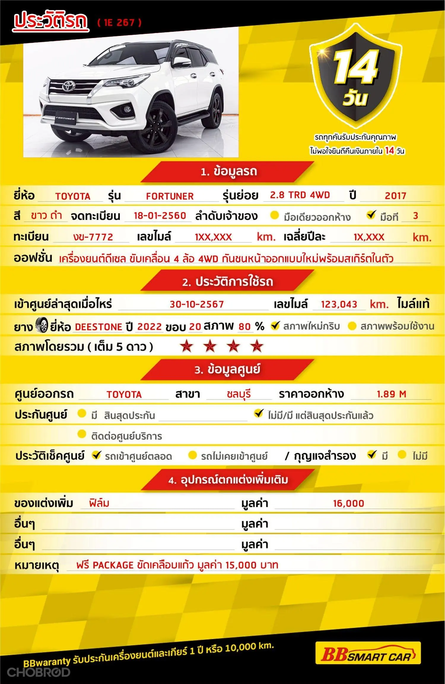 TOYOTA FORTUNER 2.8 TRD 4WD AT 2017 ออกรถ 0 บาท จัดได้ 859,000 Line:@bbsmartcar 🔥จอง 199 บาท ส่งบัตรประชาชน รู้ผลพิจารณาภายใน 30 นาที ไม่ผ่านคืนเงินจองทุกกรณี 🔥ซื้อรถกับ BB พร้อมให้คำปรึกษา แก้ทุกปัญหา ให้ทุกเรื่อง บริการ call center 24 ชม. 🔥BB Care Plus รับประกันหลังการขาย สูงสุด 2 ปี หรือ 20,000 km.. 🔥มีรถให้เลือกมากกว่า 1,800 คัน สาขา 1 สี่แยกมไหสวรรย์ ใกล้เดอะมอลล์ท่าพระ รหัสรถ 1E267 ราคา 839,000 บาท ผ่อนเพียง 14,214 บาท Brand. : TOYOTA Year. : 2017 Model. : FORTUNER Grade. : 2.8 TRD 4WD Engine. : 2800 CC Type. : ดีเซล Gearbox : AT Color. : ขาว - ดำ Mileage. : 128,XXX KM. (ซื้อสด ราคานี้ยังไม่รวมค่าดำเนินการ 10,000 บ.) 🚩 Price. 839,000 บาท ยอดจัด : 859,000 บาท เงินดาวน์ : 0 บาท ประกันภัย : ฟรีประกันภัย 1 ปี ค่าดำเนินการ : 10,000 บาท รวมออกรถ : 0 บาท ผ่อน 36 งวด = 26,211 บาท ผ่อน 48 งวด = 19,902 บาท ผ่อน 60 งวด = 17,480 บาท ผ่อน 72 งวด = 15,638 บาท ผ่อน 84 งวด = 14,214 บาท เงื่อนไขเป็นไปตามที่ไฟแนนซ์กำหนด โปรโมชั่นพิเศษ สำหรับลูกค้าเครดิตดีลือกรับเรทดอกเบี้ยพิเศษ 📍36 งวด = 1.29 % 📍48 งวด = 1.99 % 📍60 งวด = 2.39 % 📍72 งวด = 3.59 % 🔥 เงื่อนไข โปรโมชั่น ดอกเบี้ยเริ่มต้น 1.29% ตลอดอายุสัญญา - ยอดจัดไฟแนนซ์ 300,000-600,000 บาท - ผ่อนสูงสุด 72 เดือน - เป็นลูกค้าประวัติดี พนักงานประจำเงินเดือน 20,000 ขึ้นไป - ค่าดำเนินการแคมเปญ 20,000 บาท (รวมในยอดจัดได้) 🎗Car Hightlight รถสวยๆ วันนี้ขอแนะนำ TOYOTA FORTUNER 2.8 TRD 4WD AT ดีเซล สีขาว - ดำ จุดเด่นออฟชั่น 1 : เครื่องยนต์ดีเซล ขับเคลื่อน 4 ล้อ 4WD ชุดเครื่องเสียง Premium Audio หน้าจอระบบสัมผัส Touchscreen 2 : พวงมาลัยหุ้มหนัง พร้อมลาย Carbon Kevlar 3 : ช่องเก็บของด้านบนพร้อมสัญลักษณ์ TRD Sportivo 🎗ภายใน ห้องโดยสารโทนสีดำมาพร้อมเบา่ะหนังสีดำตัดแดงสวยมากๆค่ะ ภายในกว้างขวางนั่งสบายไม่อึดอัดแน่นอนค่ะ 🎗ภายนอก กันชนหน้าออกแบบใหม่ พร้อมสเกิร์ตในตัว กันชนหลังออกแบบใหม่ พร้อมสเกิร์ตในตัว กระจังหน้า สีรมดำ Dark Chrome Wrapping Film สีดำ Matt Black Top ติดตั้งบนหลังคา (มีเฉพาะรุ่นตัวถังสีขาว) คิ้วขอบป้ายทะเบียนหลัง สีรมดำ Dark Chrome ป้ายสัญลักษณ์รุ่นพิเศษ TRD Sportivo ปลอกปลายท่อไอเสีย TRD Sportivo ล้ออัลลอย ขนาด 20 นิ้ว ลาย 6 ก้าน สีรมดำ TRD Sportivo ยาง Dunlop ขนาด 265/50 R20 คอยล์สปริง และ ช็อคอัพ เซ็ตอัพใหม่จาก TRD Sportivo 🎗ความคุ้มค่า สำหรับคันนี้หากเปรียบเทียบราคากับคุณภาพ คันนี้ถือว่าคุ้มค่ามากค่ะ ผ่อนสบายๆก็มีรถขับได้ รถดีมีคุณภาพแบบนี้รีบตัดสินใจซื้อได้เลราคานี้มาไวไปไวนะคะ ⭐️การรับประกันหลังการขาย BB Care Plus สูงสุด 2 ปี หรือ 20,000 km. ด้วยช่างที่ผ่านการอบรมจากศูนย์ชั้นนำของประเทศ 🎉Special offer เฉพาะ บีบีสมาร์ทคาร์ ที่นี่ที่เดียว ⭐ดอกเบี้ยเริ่มต้น 1.29% มีไฟแนนซ์รองรับหลายที่ค่ะ ⭐ฟรี!! แพคเก็จ ขัดเคลือบแก้ว มูลค่า 15,000 บาท ทุกคัน ⭐อนุมัติไว 30 นาที นำเอกสารมาให้ครบรับรถกลับบ้านทันทีค่ะ ⭐BB Care Plus รับประกันหลังการขาย สูงสุด 2 ปี หรือ 20,000 km. ⭐มี 6 สาขา ใน