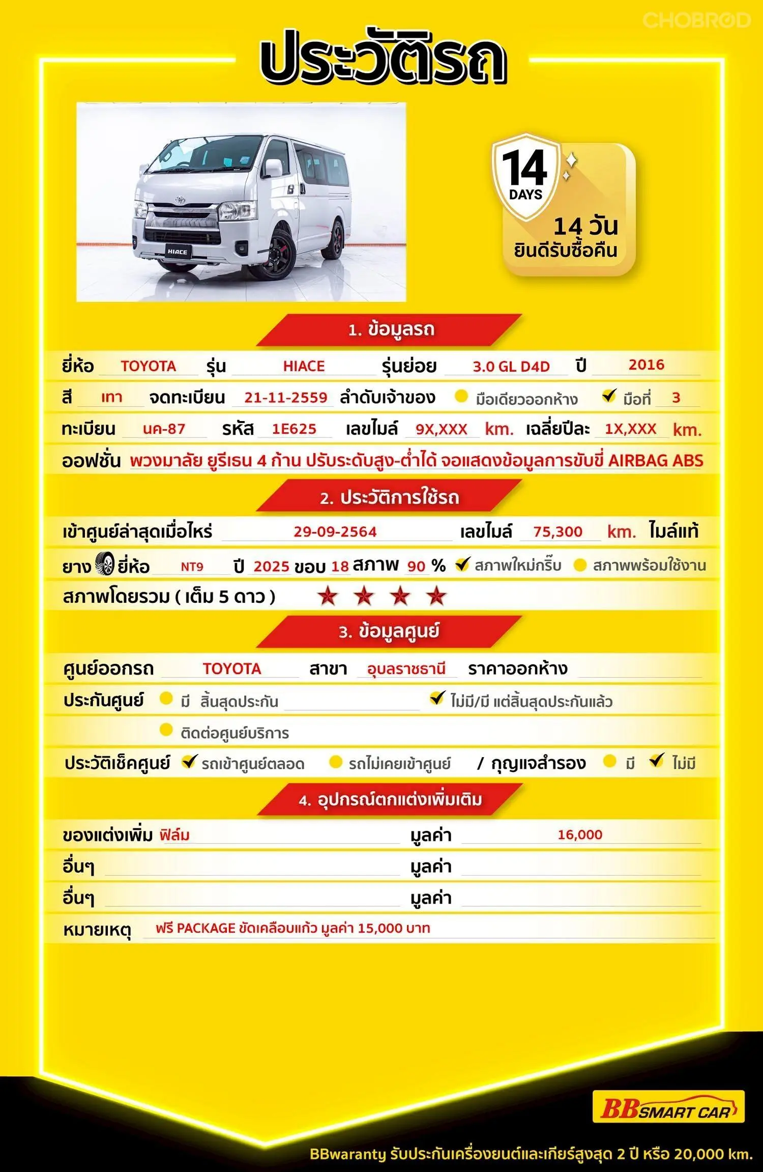 TOYOTA HIACE 3.0 GL D4D MT 2016 ออกรถ 0 บาท จัดได้ 679,000 บ. Line : @**********แสดงข้อมูล 🔥จอง 199 บาท ส่งบัตรประชาชน รู้ผลพิจารณาภายใน 30 นาที ไม่ผ่านคืนเงินจองทุกกรณี 🔥ซื้อรถกับ BB พร้อมให้คำปรึกษา แก้ทุกปัญหา ให้ทุกเรื่อง บริการ call center 24 ชม. 🔥BB Care Plus รับประกันหลังการขาย สูงสุด 2 ปี หรือ 20,000 km.. 🔥มีรถให้เลือกมากกว่า 1,800 คัน สาขา 1 สี่แยกมไหสวรรย์ ใกล้เดอะมอลล์ท่าพระ รหัสรถ 1E625 ราคา 659,000 บาท ผ่อนเพียง 12,513 บาท Brand. : TOYOTA Year. : 2016 Model. : HIACE Grade. : 3.0 GL D4D Engine. : 3000 CC Type. : ดีเซล Gearbox : MT Color. : เทา Mileage. : 97,XXX KM. (ซื้อสด ราคานี้ยังไม่รวมค่าดำเนินการ 10,000 บ.) 🚩 Price. 659,000 บาท ยอดจัด : 669,000 บาท เงินดาวน์ : 0 บาท ประกันภัย : ฟรีประกันภัย 1 ปี ค่าดำเนินการ : 10,000 บาท รวมออกรถ : 0 บาท ผ่อน 36 งวด = 22,682 บาท ผ่อน 48 งวด = 17,711 บาท ผ่อน 60 งวด = 14,847 บาท ผ่อน 72 งวด = 13,396 บาท ผ่อน 84 งวด = 12,513 บาท เงื่อนไขเป็นไปตามที่ไฟแนนซ์กำหนด โปรโมชั่นพิเศษ สำหรับลูกค้าเครดิตดีลือกรับเรทดอกเบี้ยพิเศษ 📍36 งวด = 2.59 % 📍48 งวด = 2.89 % 📍60 งวด = 3.29 % 📍72 งวด = 4.49 % 🔥 เงื่อนไข โปรโมชั่น ดอกเบี้ยเริ่มต้น 2.59% ตลอดอายุสัญญา - ยอดจัดไฟแนนซ์ 300,000-600,000 บาท - ผ่อนสูงสุด 72 เดือน - เป็นลูกค้าประวัติดี - ค่าดำเนินการแคมเปญ 20,000 บาท (รวมในยอดจัดได้) 🎗Car Hightlight รถสวยๆ วันนี้ขอแนะนำ TOYOTA HIACE 3.0 GL D4D MT 2016 จุดเด่นออฟชั่น 1 : เครื่องยนต์ดีเซล 3000 ซีซี ระบบเกียร์ธรรมดา และมีรุ่น 11 ที่นั่ง หรือ 9 ที่นั่งขึ้นอยู่กับรุ่นย่อย มีคุณสมบัติเด่นคือเป็นรุ่น Minor Change ที่ใช้ไฟหน้าใหม่ 2 : พวงมาลัย ยูรีเธน 4 ก้าน ปรับระดับสูง-ต่ำได้ จอแสดงข้อมูลการขับขี่ MID กระจกปรับไฟฟ้า 3 : เบาะนั่ง 4 ตอน ระบบเซ็นทรัลล้อค 🎗ภายใน AIRBAG ABS ระบบเสริมแรงเบรก BA ระบบไล้ฝ้ากระจกหลัง เข็มขัดนิรภัย 🎗ภายนอก กระจกมองข้าง ปรับและพับด้วยไฟฟ้า พร้อมไฟเลี้ยวในตัว ไฟ Daytime Running Lights (LED) ไฟท้ายแบบ LED ที่ปัดหมอกด้านหลัง ล้อแม็กซ์ขอบขนาด 18 นิ้ว 🎗ความคุ้มค่า สำหรับคันนี้หากเปรียบเทียบราคากับคุณภาพ คันนี้ถือว่าคุ้มค่ามากค่ะ ผ่อนสบายๆก็มีรถขับได้ รถดีมีคุณภาพแบบนี้รีบตัดสินใจซื้อได้เลยราคานี้มาไวไปไวนะคะ ⭐️การรับประกันหลังการขาย BB Care Plus สูงสุด 2 ปี หรือ 20,000 km. ด้วยช่างที่ผ่านการอบรมจากศูนย์ชั้นนำของประเทศ 🎉Special offer เฉพาะ บีบีสมาร์ทคาร์ ที่นี่ที่เดียว ⭐ดอกเบี้ยเริ่มต้น 2.59% มีไฟแนนซ์รองรับหลายที่ค่ะ ⭐ฟรี!! แพคเก็จ ขัดเคลือบแก้ว มูลค่า 15,000 บาท ทุกคัน ⭐อนุมัติไว 30 นาที นำเอกสารมาให้ครบรับรถกลับบ้านทันทีค่ะ ⭐BB Care Plus รับประกันหลังการขาย สูงสุด 2 ปี หรือ 20,000 km. ⭐มี 6 สาขา ในกรุงเทพและปริมณฑลใกล้บ้านท่าน ⭐รถทุกคันผ่านตรวจสอบ Inspection เรียบร้อยแล้วค่ะ ผ่าน 5 ดาวทุกคันค่ะ ⭐เซลล์ทุกท่านเป็นมืออาชีพพร้อมให้บริการทุกท่านแน่นอนค่ะ