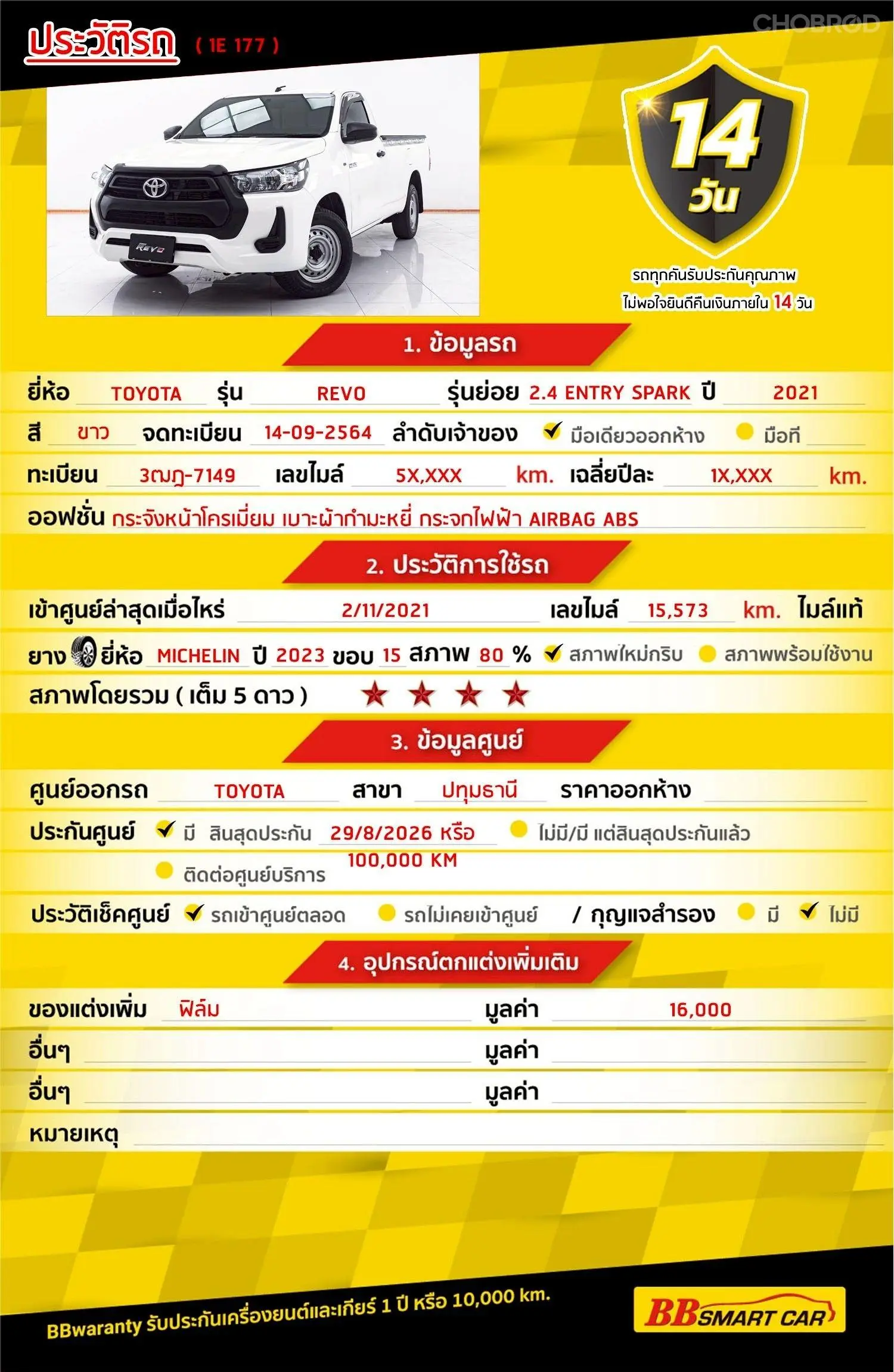 TOYOTA HILUX REVO 2.4 ENTRY SPARK MT 2021 ออกรถ 0 บาท จัดได้ 399,000 Line:@**********แสดงข้อมูล 🔥จอง 199 บาท ส่งบัตรประชาชน รู้ผลพิจารณาภายใน 30 นาที ไม่ผ่านคืนเงินจองทุกกรณี 🔥ซื้อรถกับ BB พร้อมให้คำปรึกษา แก้ทุกปัญหา ให้ทุกเรื่อง บริการ call center 24 ชม. 🔥BB Care Plus รับประกันหลังการขาย สูงสุด 2 ปี หรือ 20,000 km.. 🔥มีรถให้เลือกมากกว่า 1,800 คัน สาขา 1 สี่แยกมไหสวรรย์ ใกล้เดอะมอลล์ท่าพระ รหัสรถ 1E177 ราคา 379,000 บาท ผ่อนเพียง 6,790 บาท Brand. : TOYOTA Year. : 2021 Model. : HILUX REVO Grade. : 2.4 ENTRY SPARK Engine. : 2400 CC Type. : ดีเซล Gearbox : MT Color. : ขาว Mileage. : 58,XXX KM. (ซื้อสด ราคานี้ยังไม่รวมค่าดำเนินการ 10,000 บ.) 🚩 Price. 379,000 บาท ยอดจัด : 389,000 บาท เงินดาวน์ : 0 บาท ประกันภัย : ฟรีประกันภัย 1 ปี ค่าดำเนินการ : 10,000 บาท รวมออกรถ : 0 บาท ผ่อน 36 งวด = 12,842 บาท ผ่อน 48 งวด = 9,951 บาท ผ่อน 60 งวด = 8,286 บาท ผ่อน 72 งวด = 7,443 บาท ผ่อน 84 งวด = 6,790 บาท เงื่อนไขเป็นไปตามที่ไฟแนนซ์กำหนด โปรโมชั่นพิเศษ สำหรับลูกค้าเครดิตดีลือกรับเรทดอกเบี้ยพิเศษ 📍36 งวด = 2.59 % 📍48 งวด = 2.89 % 📍60 งวด = 3.29 % 📍72 งวด = 4.49 % 🔥 เงื่อนไข โปรโมชั่น ดอกเบี้ยเริ่มต้น 2.59% ตลอดอายุสัญญา - ยอดจัดไฟแนนซ์ 300,000-600,000 บาท - ผ่อนสูงสุด 72 เดือน - เป็นลูกค้าประวัติดี - ค่าดำเนินการแคมเปญ 20,000 บาท (รวมในยอดจัดได้) 🎗Car Hightlight รถสวยๆ วันนี้ขอแนะนำ TOYOTA HILUX REVO 2.4 ENTRY SPARK MT 2021 จุดเด่นออฟชั่น 1 : กระจังหน้าโครเมี่ยม 2 : เบาะผ้ากำมะหยี่ 3 : กระจกไฟฟ้า 🎗ภายใน AIRBAG ABS 🎗ภายนอก ล้ออัลลอย (15 นิ้ว) ไฟหน้าแบบ LED เปิด-ปิดอัตโนมัติ ไฟท้ายแบบ LED ตัวรถสีขาว เรียบหรู กระบะหลังพื้นที่กว้างขวาง เหมาะสำหรับใช้งานเป็นอย่างมาก ไม่มีชนหนักแน่นอนค่ะ 🎗ความคุ้มค่า สำหรับคันนี้หากเปรียบเทียบราคากับคุณภาพ คันนี้ถือว่าคุ้มค่ามากค่ะ ผ่อนสบายๆก็มีรถขับได้ รถดีมีคุณภาพแบบนี้รีบตัดสินใจซื้อได้เลราคานี้มาไวไปไวนะคะ ⭐️การรับประกันหลังการขาย BB Care Plus สูงสุด 2 ปี หรือ 20,000 km. ด้วยช่างที่ผ่านการอบรมจากศูนย์ชั้นนำของประเทศ 🎉Special offer เฉพาะ บีบีสมาร์ทคาร์ ที่นี่ที่เดียว ⭐ดอกเบี้ยเริ่มต้น 2.59% มีไฟแนนซ์รองรับหลายที่ค่ะ ⭐ฟรี!! แพคเก็จ ขัดเคลือบแก้ว มูลค่า 15,000 บาท ทุกคัน ⭐อนุมัติไว 30 นาที นำเอกสารมาให้ครบรับรถกลับบ้านทันทีค่ะ ⭐BB Care Plus รับประกันหลังการขาย สูงสุด 2 ปี หรือ 20,000 km. ⭐มี 6 สาขา ในกรุงเทพและปริมณฑลใกล้บ้านท่าน ⭐รถทุกคันผ่านตรวจสอบ Inspection เรียบร้อยแล้วค่ะ ผ่าน 5 ดาวทุกคันค่ะ ⭐เซลล์ทุกท่านเป็นมืออาชีพพร้อมให้บริการทุกท่านแน่นอนค่ะ เลือกข้อเสนอที่ให้คุณมากกว่าที่อื่น เพราะเราเล็งเห็นแล้ว ที่บีบีสมาร์ทคาร์ ให้คุณได้มากกว่าที่อื่นแน่นอนครับ มาที่เดียวจบทุกปัญหา หลากหลายรุ่นให้เลือกกับบริการที่คุณต้องประทับใจแน่นอนครับ