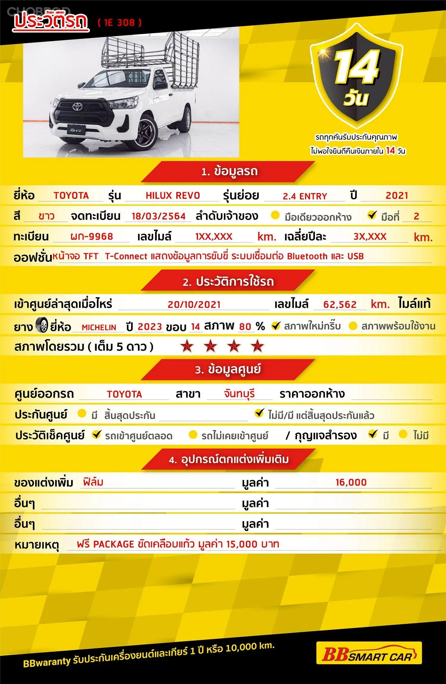 TOYOTA HILUX REVO 2.4 ENTRY SPARK MT 2021 ออกรถ 0 บาท จัดได้ 339,000 Line:***********แสดงข้อมูล 🔥จอง 199 บาท ส่งบัตรประชาชน รู้ผลพิจารณาภายใน 30 นาที ไม่ผ่านคืนเงินจองทุกกรณี 🔥ซื้อรถกับ BB พร้อมให้คำปรึกษา แก้ทุกปัญหา ให้ทุกเรื่อง บริการ call center 24 ชม. 🔥BB Care Plus รับประกันหลังการขาย สูงสุด 2 ปี หรือ 20,000 km.. 🔥มีรถให้เลือกมากกว่า 1,800 คัน สาขา 1 สี่แยกมไหสวรรย์ ใกล้เดอะมอลล์ท่าพระ รหัสรถ 1E308 ราคา 319,000 บาท ผ่อนเพียง 5,743 บาท Brand. : TOYOTA Year. : 2021 Model. : HILUX REVO Grade. : 2.4 ENTRY SPARK Engine. : 2400 CC Type. : ดีเซล Gearbox : MT Color. : ขาว Mileage. : 132,XXX KM. (ซื้อสด ราคานี้ยังไม่รวมค่าดำเนินการ 10,000 บ.) 🚩 Price. 319,000 บาท ยอดจัด : 329,000 บาท เงินดาวน์ : 0 บาท ประกันภัย : ฟรีประกันภัย 1 ปี ค่าดำเนินการ : 10,000 บาท รวมออกรถ : 0 บาท ผ่อน 36 งวด = 10,538 บาท ผ่อน 48 งวด = 8,093 บาท ผ่อน 60 งวด = 7,009 บาท ผ่อน 72 งวด = 6,295 บาท ผ่อน 84 งวด = 5,743 บาท เงื่อนไขเป็นไปตามที่ไฟแนนซ์กำหนด โปรโมชั่นพิเศษ สำหรับลูกค้าเครดิตดีลือกรับเรทดอกเบี้ยพิเศษ 📍36 งวด = 2.59 % 📍48 งวด = 2.89 % 📍60 งวด = 3.29 % 📍72 งวด = 4.49 % 🔥 เงื่อนไข โปรโมชั่น ดอกเบี้ยเริ่มต้น 2.59% ตลอดอายุสัญญา - ยอดจัดไฟแนนซ์ 300,000-600,000 บาท - ผ่อนสูงสุด 72 เดือน - เป็นลูกค้าประวัติดี - ค่าดำเนินการแคมเปญ 20,000 บาท (รวมในยอดจัดได้) 🎗Car Hightlight รถสวยๆ วันนี้ขอแนะนำ TOYOTA HILUX REVO 2.4 ENTRY SPARK MT 2021 จุดเด่นออฟชั่น 1 : เบาะกำมะหยี่ 2 : หน้าจอ TFT T-Connect แสดงข้อมูลการขับขี่ ระบบเชื่อมต่อ Bluetooth และ USB 3 : ไฟหน้าดีไซน์ใหม่แบบ Bi-Beam ไฟ LED Daytime Running Light และไฟท้ายแบบ LED Light Guiding 🎗ภายใน ระบบเบรกป้องกันล้อล็อค ABS ระบบกระจายแรงเบรก EBD ระบบเสริมแรงเบรก BA ระบบควบคุมการทรงตัว VSC ระบบป้องกันล้อหมุนฟรี TRC ระบบช่วยการออกตัวบนทางลาดชัน HAC ถุงลมนิรภัย 7 ตำแหน่ง (คู่หน้า-ด้านข้าง-ม่านนิรภัย-หัวเข่าคนขับ) 🎗ภายนอก กระจังหน้าโครเมียมรมดำ กระจกมองข้างพร้อมไฟเลี้ยว ไฟตัดหมอก (หน้า) ไฟหน้า (ระบบเปิด-ปิดไฟหน้าอัตโนมัติ) ล้อแมกซ์หน้าขอบ 18" ล้อแมกซ์หลังขอบ 14" ตัวรถสีขาว มีเสน่ห์ไม่แพ้ใคร กระบะหลังเสริมคอกเหล็กไว้ใช้งาน ไม่มีน้ำท่วมหรือชนหนักแน่นอนค่ะ 🎗ความคุ้มค่า สำหรับคันนี้หากเปรียบเทียบราคากับคุณภาพ คันนี้ถือว่าคุ้มค่ามากค่ะ ผ่อนสบายๆก็มีรถขับได้ รถดีมีคุณภาพแบบนี้รีบตัดสินใจซื้อได้เลราคานี้มาไวไปไวนะคะ ⭐️การรับประกันหลังการขาย BB Care Plus สูงสุด 2 ปี หรือ 20,000 km. ด้วยช่างที่ผ่านการอบรมจากศูนย์ชั้นนำของประเทศ 🎉Special offer เฉพาะ บีบีสมาร์ทคาร์ ที่นี่ที่เดียว ⭐ดอกเบี้ยเริ่มต้น 2.59% มีไฟแนนซ์รองรับหลายที่ค่ะ ⭐ฟรี!! แพคเก็จ ขัดเคลือบแก้ว มูลค่า 15,000 บาท ทุกคัน ⭐อนุมัติไว 30 นาที นำเอกสารมาให้ครบรับรถกลับบ้านทันทีค่ะ ⭐BB Care Plus รับประกันหลังการขาย สูงสุด 2 ปี หรือ 20,000 km. ⭐มี 6 สาขา ในกรุงเทพและปริมณฑลใกล้บ้านท่าน ⭐รถทุกคันผ่านตรวจสอบ Inspection เ