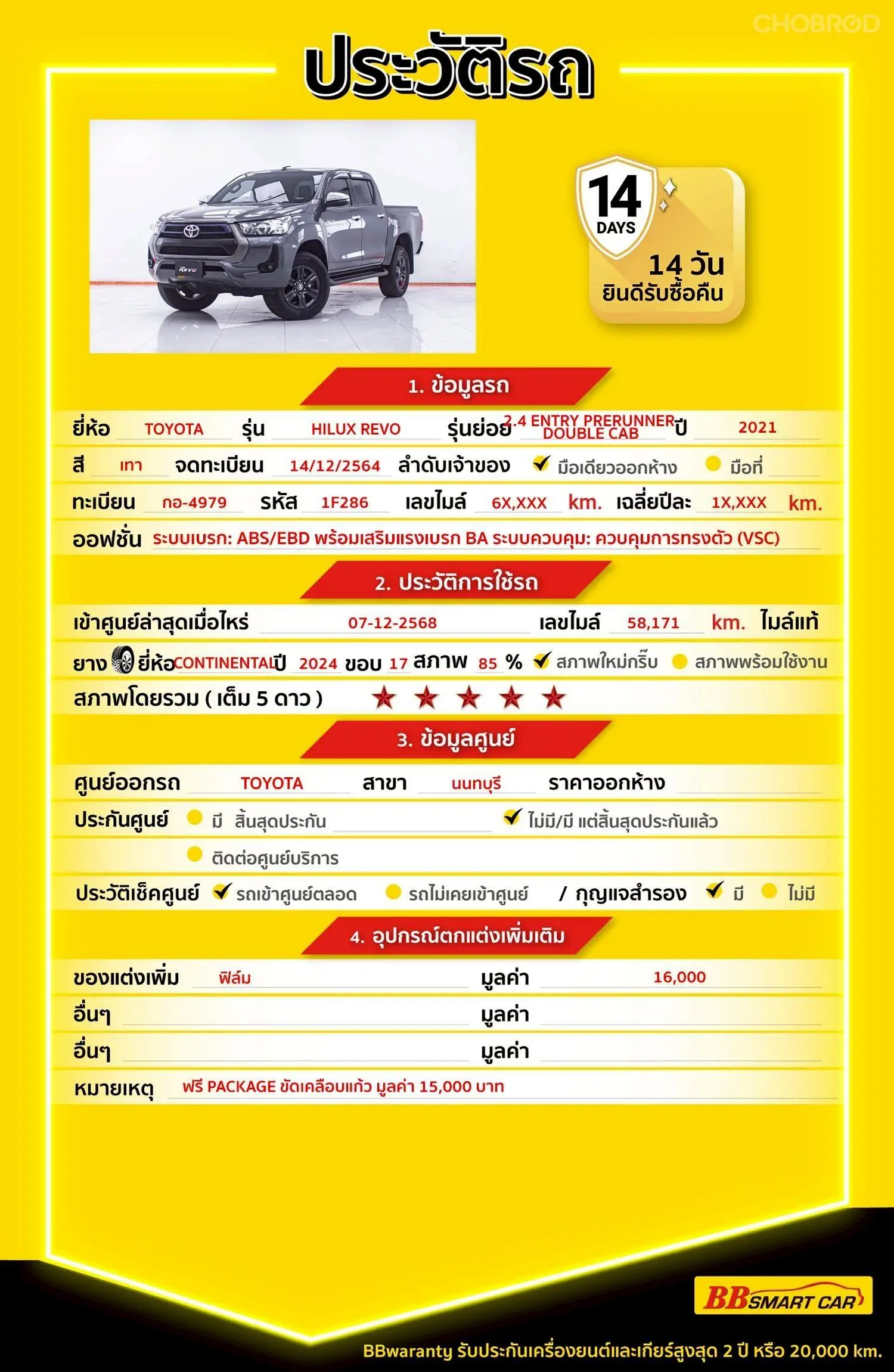 TOYOTA HILUX REVO 2.4 ENTRY DOUBLE CAB PRERUNNER MT 2021 ออกรถ 0 บาท จัดได้ 579,000 บ. Line:@******แสดงข้อมูล 🔥มีรถให้เลือกมากกว่า 1,800 คัน 🔥รถทุกคันผ่านตรวจสอบ Inspection เรียบร้อยแล้วค่ะ ผ่าน 5 ดาวทุกคันค่ะ 🔥ซื้อรถกับ BB พร้อมให้คำปรึกษา แก้ทุกปัญหา ให้ทุกเรื่อง บริการ call center 24 ชม. 🔥BB Care Plus รับประกันหลังการขาย สูงสุด 2 ปี หรือ 20,000 km. 🔥ฟรี!! แพคเก็จ ขัดเคลือบแก้ว มูลค่า 15,000 บาท ทุกคัน 🔥มี 6 สาขา ในกรุงเทพและปริมณฑลใกล้บ้านท่าน สาขา 1 สี่แยกมไหสวรรย์ ใกล้เดอะมอลล์ท่าพระ รหัสรถ 1F286 ราคา 559,000 บาท ผ่อนเพียง 9,526 บาท Brand. : TOYOTA Year. : 2021 Model. : HILUX REVO Grade. : 2.4 ENTRY DOUBLE CAB PRERUNNER Engine. : 2400 CC Type. : ดีเซล Gearbox : MT Color. : เทา Mileage. : 62,XXX KM. (ซื้อสด ราคานี้ยังไม่รวมค่าดำเนินการ 10,000 บ.) 🚩 Price. 559,000 บาท ยอดจัด : 569,000 บาท เงินดาวน์ : 0 บาท ประกันภัย : ค่าดำเนินการ : 10,000 บาท รวมออกรถ : 0 บาท ผ่อน 36 งวด = 18,327 บาท ผ่อน 48 งวด = 14,099 บาท ผ่อน 60 งวด = 11,715 บาท ผ่อน 72 งวด = 10,481 บาท ผ่อน 84 งวด = 9,526 บาท เงื่อนไขเป็นไปตามที่ไฟแนนซ์กำหนด โปรโมชั่นพิเศษ สำหรับลูกค้าเครดิตดีลือกรับเรทดอกเบี้ยพิเศษ 📍36 งวด = 1.29 % 📍48 งวด = 1.99 % 📍60 งวด = 2.39 % 📍72 งวด = 3.59 % 🔥 เงื่อนไข โปรโมชั่น ดอกเบี้ยเริ่มต้น 1.29% ตลอดอายุสัญญา - ยอดจัดไฟแนนซ์ 300,000-600,000 บาท - ผ่อนสูงสุด 72 เดือน - เป็นลูกค้าประวัติดี พนักงานประจำเงินเดือน 20,000 ขึ้นไป - ค่าดำเนินการแคมเปญ 20,000 บาท (รวมในยอดจัดได้) 🎗Car Hightlight รถสวยๆ วันนี้ขอแนะนำ TOYOTA HILUX REVO 2.4 ENTRY DOUBLE CAB PRERUNNER MT 2021 จุดเด่นออฟชั่น 1 : เครื่องยนต์: 2GD-FTV (High) 4 สูบ แถวเรียง 16 วาล์ว DOHC VN Turbo และ Intercooler 2 : ความจุกระบอกสูบ: 2,393 ซีซี กำลังสูงสุด: 150 แรงม้า (PS) ที่ 3,400 รอบ/นาที 3 : แรงบิดสูงสุด: 400 นิวตันเมตร ที่ 1,600 – 2,000 รอบ/นาที ระบบส่งกำลัง: เกียร์ธรรมดา 6 จังหวะ (บางแหล่งระบุว่ามีรุ่น 6AT ด้วย) ความจุถังน้ำมัน: 80 ลิตร 🎗ภายใน * เบาะนั่งวัสดุผ้า * หน้าจอสัมผัสขนาด 8 นิ้ว (บางล็อตอาจเป็น 7 นิ้ว) รองรับ Apple CarPlay และ Android Auto * มาตรวัด: จอแสดงผลข้อมูลผู้ขับขี่ TFT ขนาด 4.2 นิ้ว * กุญแจ: รีโมทแบบ Jack Knife Key * ระบบเบรก: ABS/EBD พร้อมเสริมแรงเบรก BA * ระบบควบคุม: ควบคุมการทรงตัว (VSC), ป้องกันล้อหมุนฟรี (TRC), ช่วยออกตัวบนทางลาดชัน (HAC) * ถุงลมนิรภัย: คู่หน้า และหัวเข่าด้านคนขับ * กล้อง: กล้องมองหลังขณะถอยจอด 🎗ภายนอก * ไฟหน้า: Bi-Beam LED พร้อมระบบเปิด-ปิดอัตโนมัติ * ไฟ Daytime Running Lights (DRL): แบบ LED * ล้อ: อัลลอย 17 นิ้ว * กระจกมองข้าง ปรับและพับด้วยไฟฟ้า พร้อมไฟเลี้ยวในตัว * เสาอากาศแบบสั้น