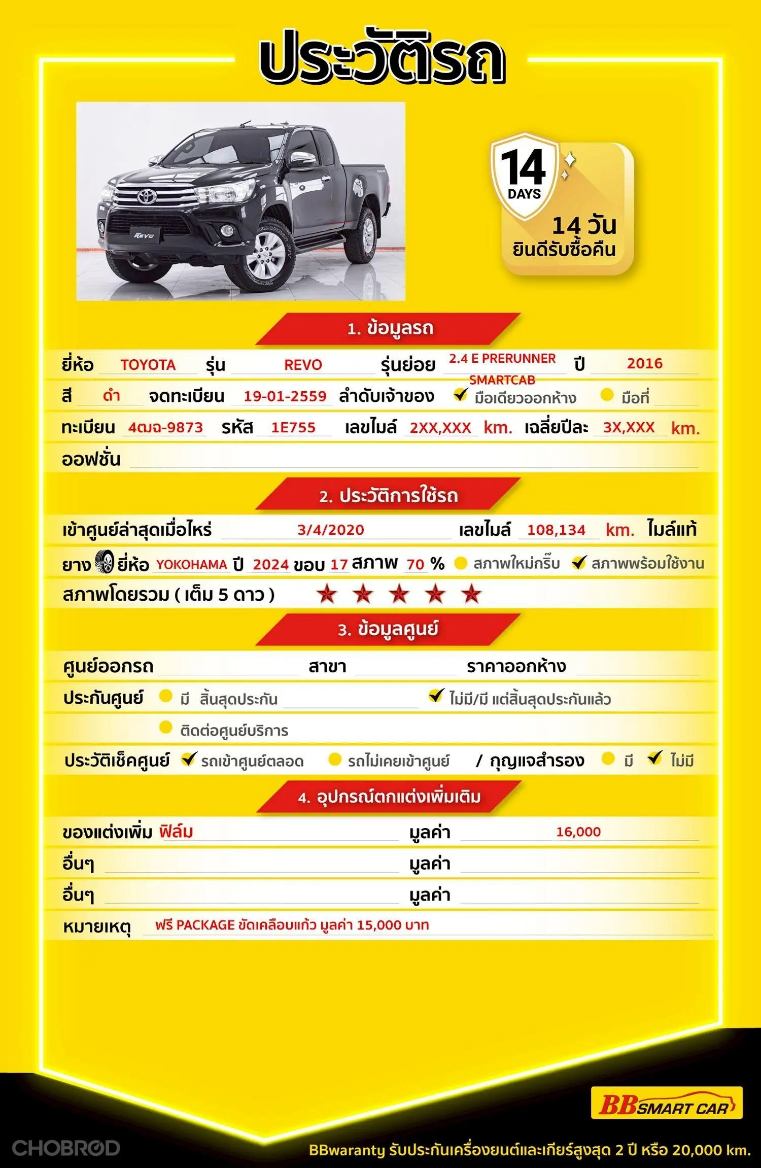 มีการรับประกันจากดีลเลอร์ (6 เดือน) มีบริการช่วยเหลือฉุกเฉินบนท้องถนน 24 ชม. จากดีลเลอร์