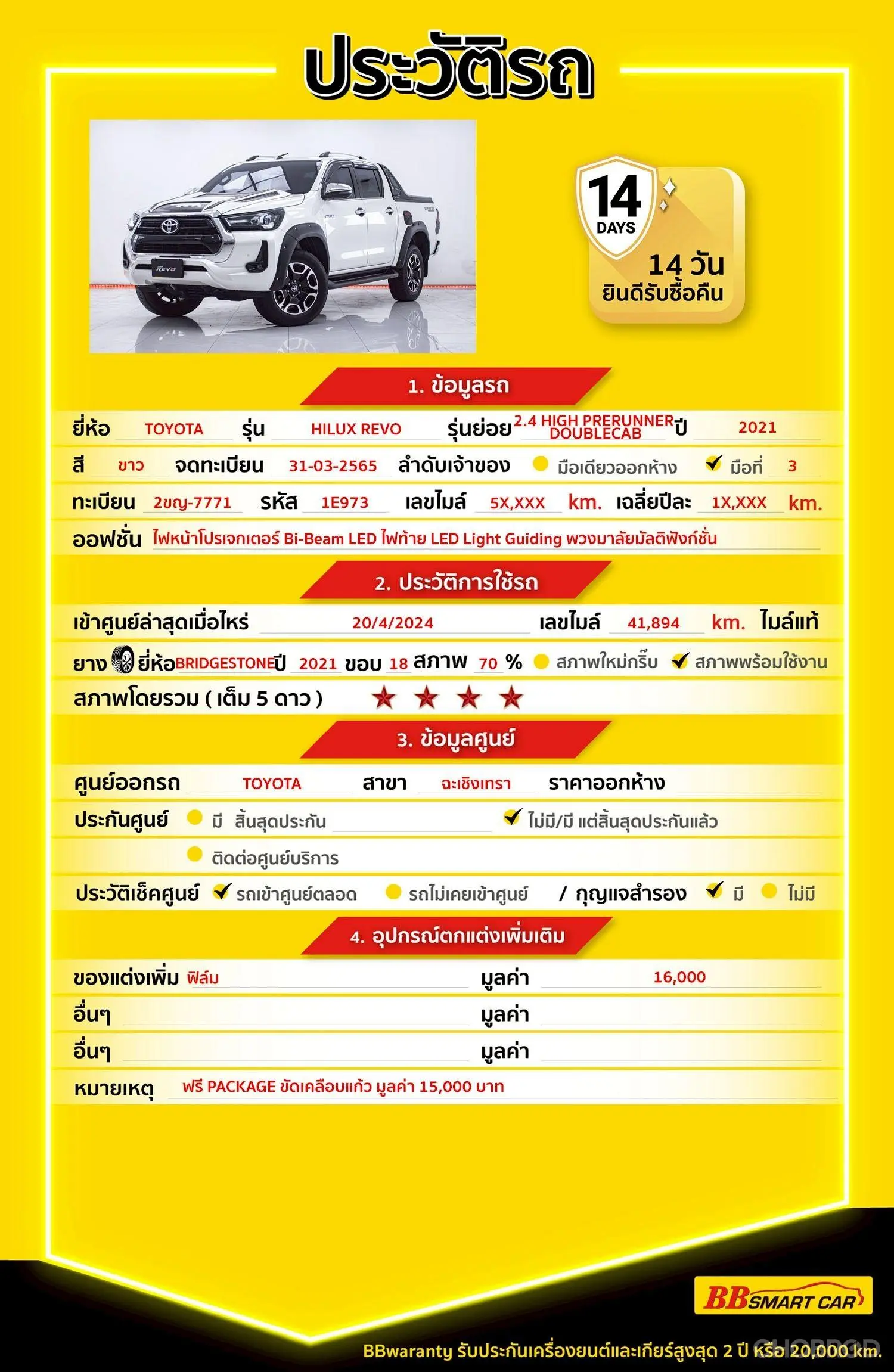 มีการรับประกันจากดีลเลอร์ (6 เดือน) มีบริการช่วยเหลือฉุกเฉินบนท้องถนน 24 ชม. จากดีลเลอร์