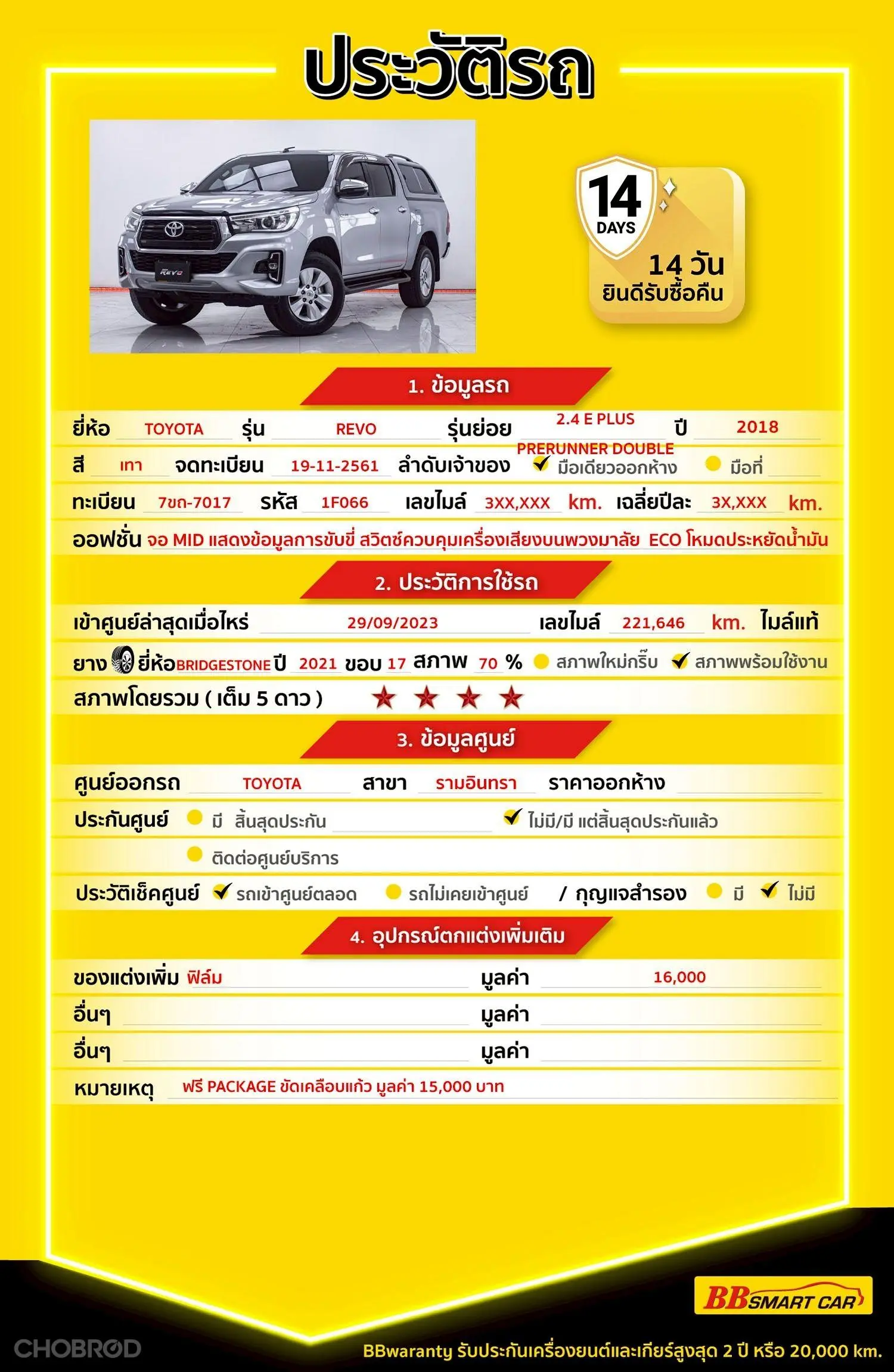 HILUX REVO 2.4 E PLUS PRERUNNER DOUBLE CAB AT 2018 ออกรถ 0 บาท จัดได้ 529,000 บ. Line:@BBCAR1 🔥มีรถให้เลือกมากกว่า 1,800 คัน 🔥รถทุกคันผ่านตรวจสอบ Inspection เรียบร้อยแล้วค่ะ ผ่าน 5 ดาวทุกคันค่ะ 🔥ซื้อรถกับ BB พร้อมให้คำปรึกษา แก้ทุกปัญหา ให้ทุกเรื่อง บริการ call center 24 ชม. 🔥BB Care Plus รับประกันหลังการขาย สูงสุด 2 ปี หรือ 20,000 km. 🔥ฟรี!! แพคเก็จ ขัดเคลือบแก้ว มูลค่า 15,000 บาท ทุกคัน 🔥มี 6 สาขา ในกรุงเทพและปริมณฑลใกล้บ้านท่าน สาขา 1 สี่แยกมไหสวรรย์ ใกล้เดอะมอลล์ท่าพระ รหัสรถ 1F066 ราคา 509,000 บาท ผ่อนเพียง 8,688 บาท Brand. : TOYOTA Year. : 2018 Model. : HILUX REVO Grade. : 2.4 E PLUS PRERUNNER DOUBLE CAB Engine. : 2400 CC Type. : ดีเซล Gearbox : AT Color. : เทา Mileage. : 313,XXX KM. (ซื้อสด ราคานี้ยังไม่รวมค่าดำเนินการ 10,000 บ.) 🚩 Price. 509,000 บาท ยอดจัด : 519,000 บาท เงินดาวน์ : 0 บาท ประกันภัย : ค่าดำเนินการ : 10,000 บาท รวมออกรถ : 0 บาท ผ่อน 36 งวด = 16,717 บาท ผ่อน 48 งวด = 12,860 บาท ผ่อน 60 งวด = 10,685 บาท ผ่อน 72 งวด = 9,559 บาท ผ่อน 84 งวด = 8,688 บาท เงื่อนไขเป็นไปตามที่ไฟแนนซ์กำหนด โปรโมชั่นพิเศษ สำหรับลูกค้าเครดิตดีลือกรับเรทดอกเบี้ยพิเศษ 📍36 งวด = 1.29 % 📍48 งวด = 1.99 % 📍60 งวด = 2.39 % 📍72 งวด = 3.59 % 🔥 เงื่อนไข โปรโมชั่น ดอกเบี้ยเริ่มต้น 1.29% ตลอดอายุสัญญา - ยอดจัดไฟแนนซ์ 300,000-600,000 บาท - ผ่อนสูงสุด 72 เดือน - เป็นลูกค้าประวัติดี พนักงานประจำเงินเดือน 20,000 ขึ้นไป - ค่าดำเนินการแคมเปญ 20,000 บาท (รวมในยอดจัดได้) 🎗Car Hightlight รถสวยๆ วันนี้ขอแนะนำ TOYOTA HILUX REVO 2.4 E PLUS PRERUNNER DOUBLE CAB AT 2018 จุดเด่นออฟชั่น 1 : เกียร์อัตโนมัติ 6 จังหวะ 2 : ยกสูงแคฟเปิดได้ PERRUNNER SMARTCAB 3 : หน้าจอเครื่องเสียง ระบบสัมผัส Touchscreen ขนาด 7 นิ้ว เครื่องเสียงวิทยุ CD/MP3 และ DVD 🎗ภายใน * ECO โหมดประหยัดน้ำมัน * ECO โหมดประหยัดน้ำมัน * คอนโซลหน้าตกแต่งด้วยวัสดุสีเงิน * ช่องแอร์ตกแต่งด้วยวัสดุสีเงินและโครเมียม * แผงข้างประตูบุผ้าและตกแต่งด้วยวัสดุสีเงิน * แผงสวิตซ์ประตูตกแต่งสีดำ * มือเปิดประตูด้านในโครเมียม * พวงมาลัยหุ้มหนัง ตกแต่งด้วยแถบสีเงิน * พวงมาลัยหุ้มหนัง ตกแต่งด้วยแถบสีเงิน * ฐานเกียร์ ตกแต่งด้วยแถบสีเงิน * เบรกมือ ตกแต่งด้วยโครเมียม * จอ MID แสดงข้อมูลการขับขี่ * สวิตซ์ควบคุมเครื่องเสียงบนพวงมาลัย 🎗ภายนอก * ไฟตัดหมอกคู่หน้า * กันชนหลัง โครเมียม * ที่ปัดน้ำฝนแบบปรับหน่วงเวลาได้ * ล้อ BRIDGESTONE ปี 21 ขอบ 17 * เสาอากาศแบบสั้น 🎗ความคุ้มค่า สำหรับคันนี้หากเปรียบเทียบราคากับคุณภาพ คันนี้ถือว่าคุ้มค่ามากค่ะ ผ่อนสบายๆก็มีรถขับได้ รถดีมีคุณภาพแบบนี้รีบตัดสินใจซื้อได้เลราคานี้มาไวไปไวนะคะ