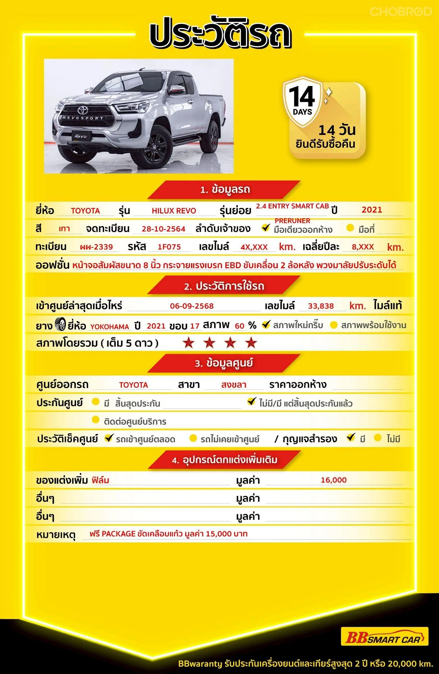มีการรับประกันจากดีลเลอร์ (6 เดือน) มีบริการช่วยเหลือฉุกเฉินบนท้องถนน 24 ชม. จากดีลเลอร์